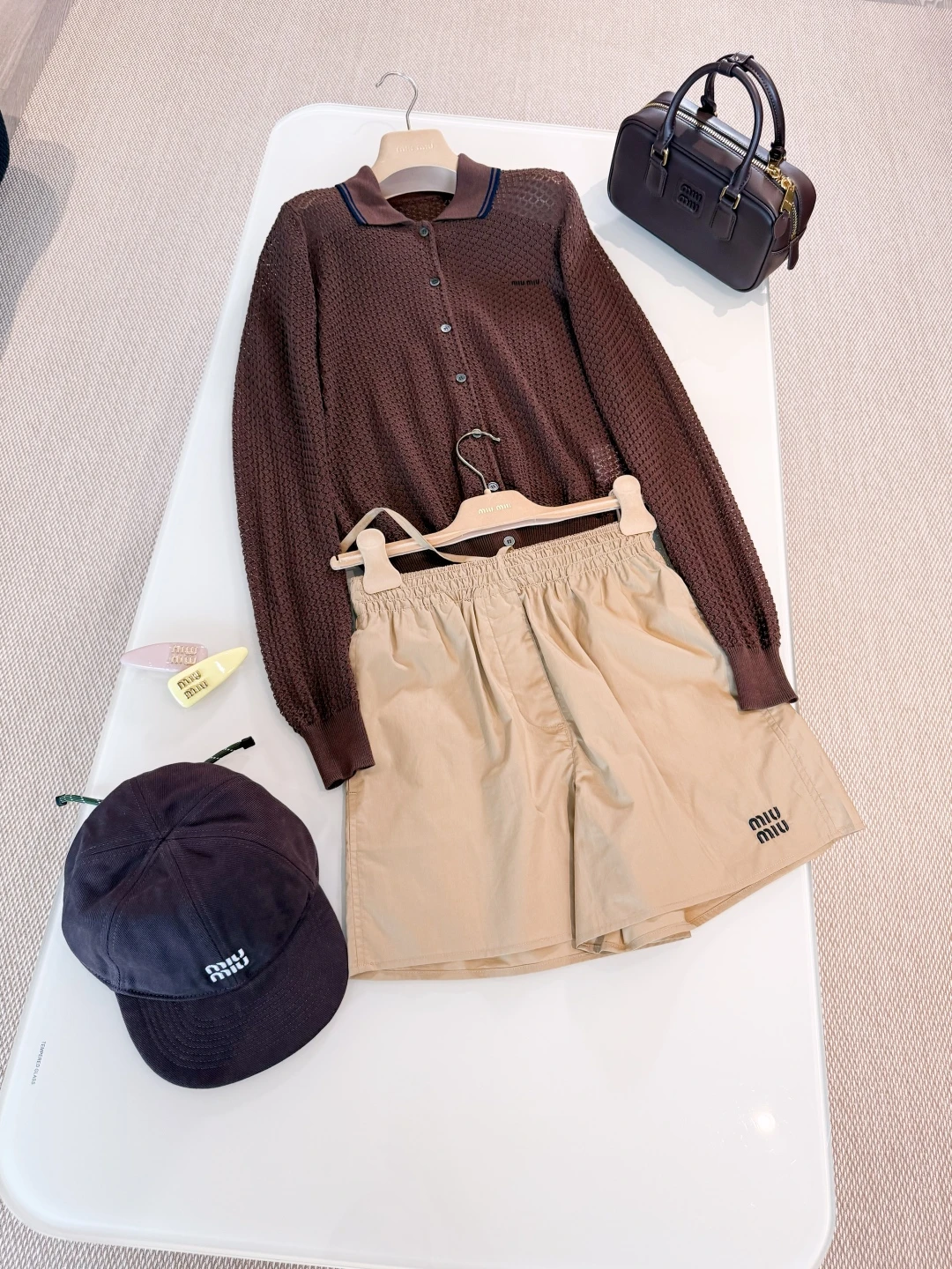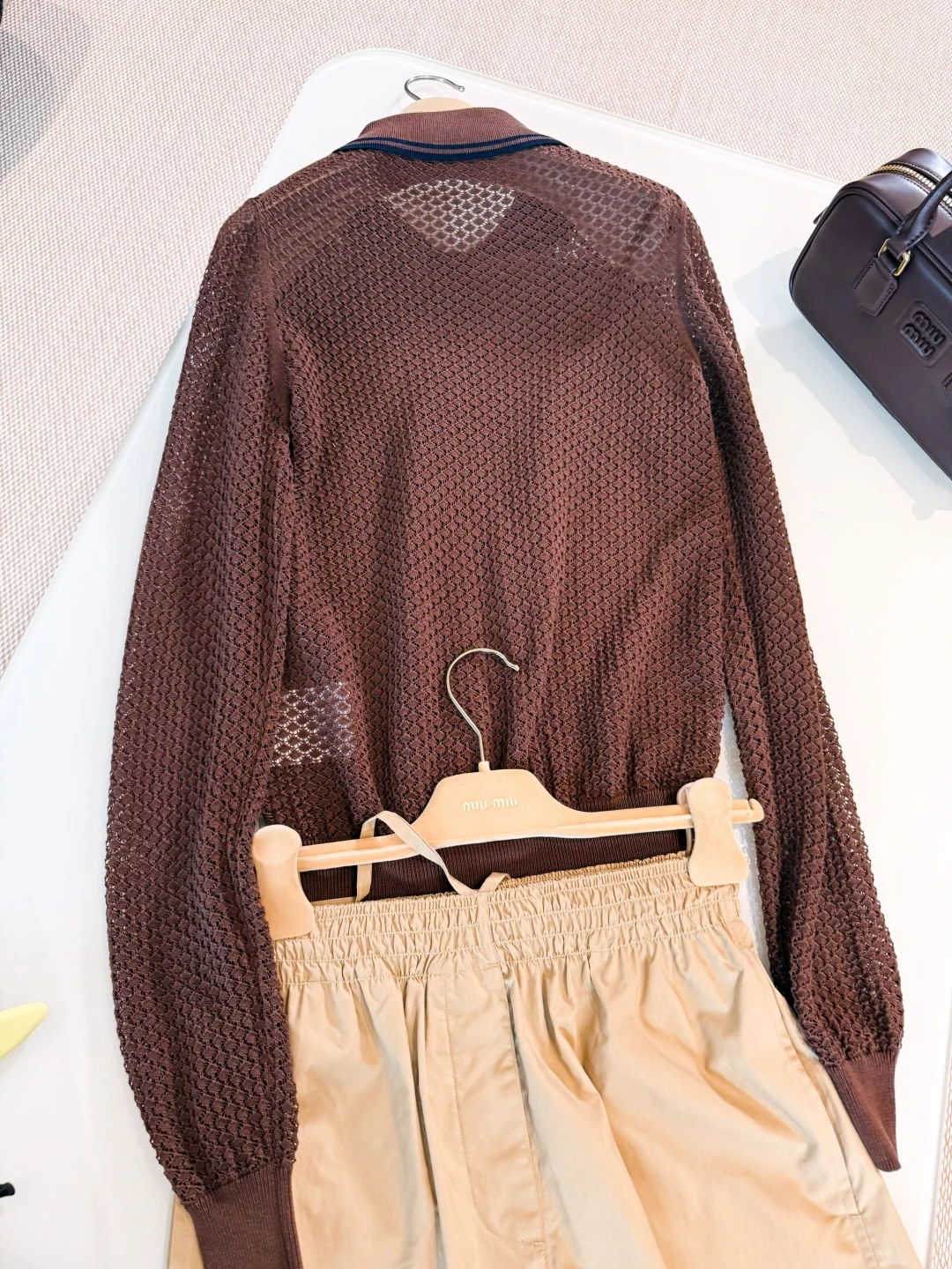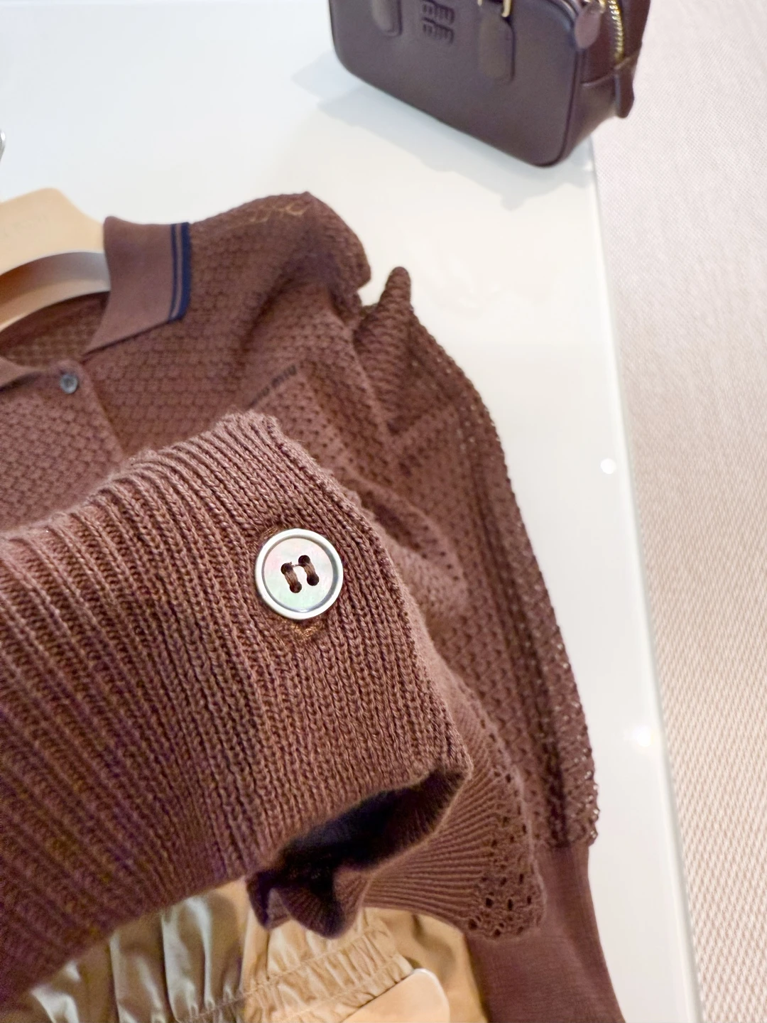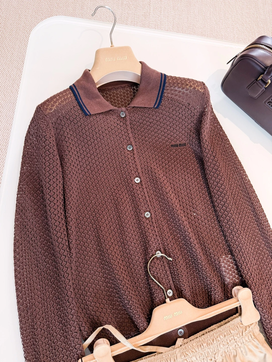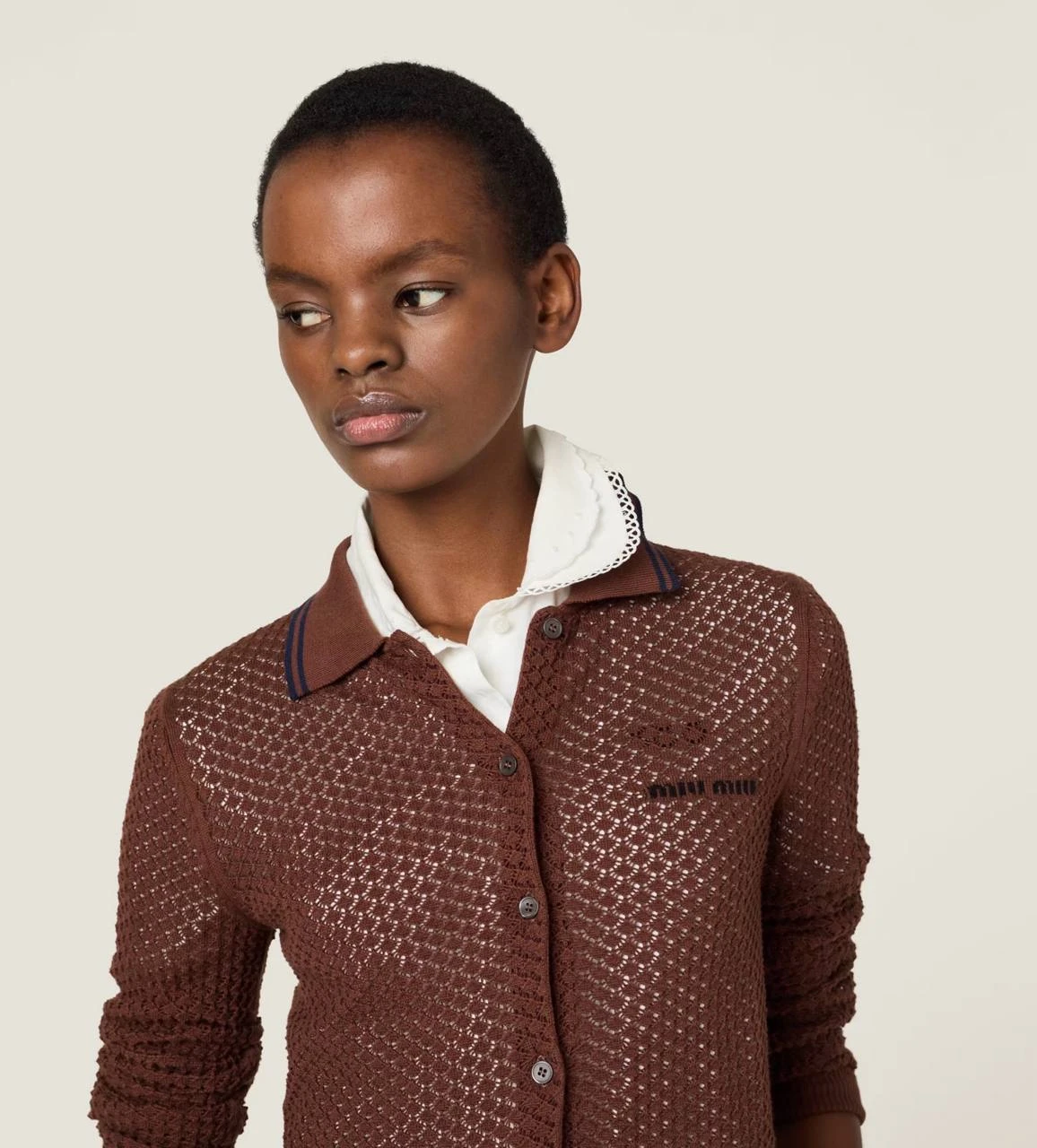 Дизайн кардигана отличается изяществом и лаконичностью: классический фасон с аккуратным воротником, застежкой на пуговицы и элегантными деталями, характерными для бренда MIU MIU. Этот кардиган легко сочетается с различной одеждой — от джинсов до юбок, добавляя образу женственности и утонченности.