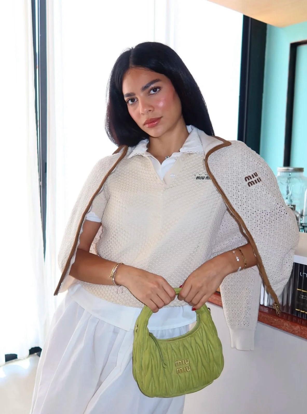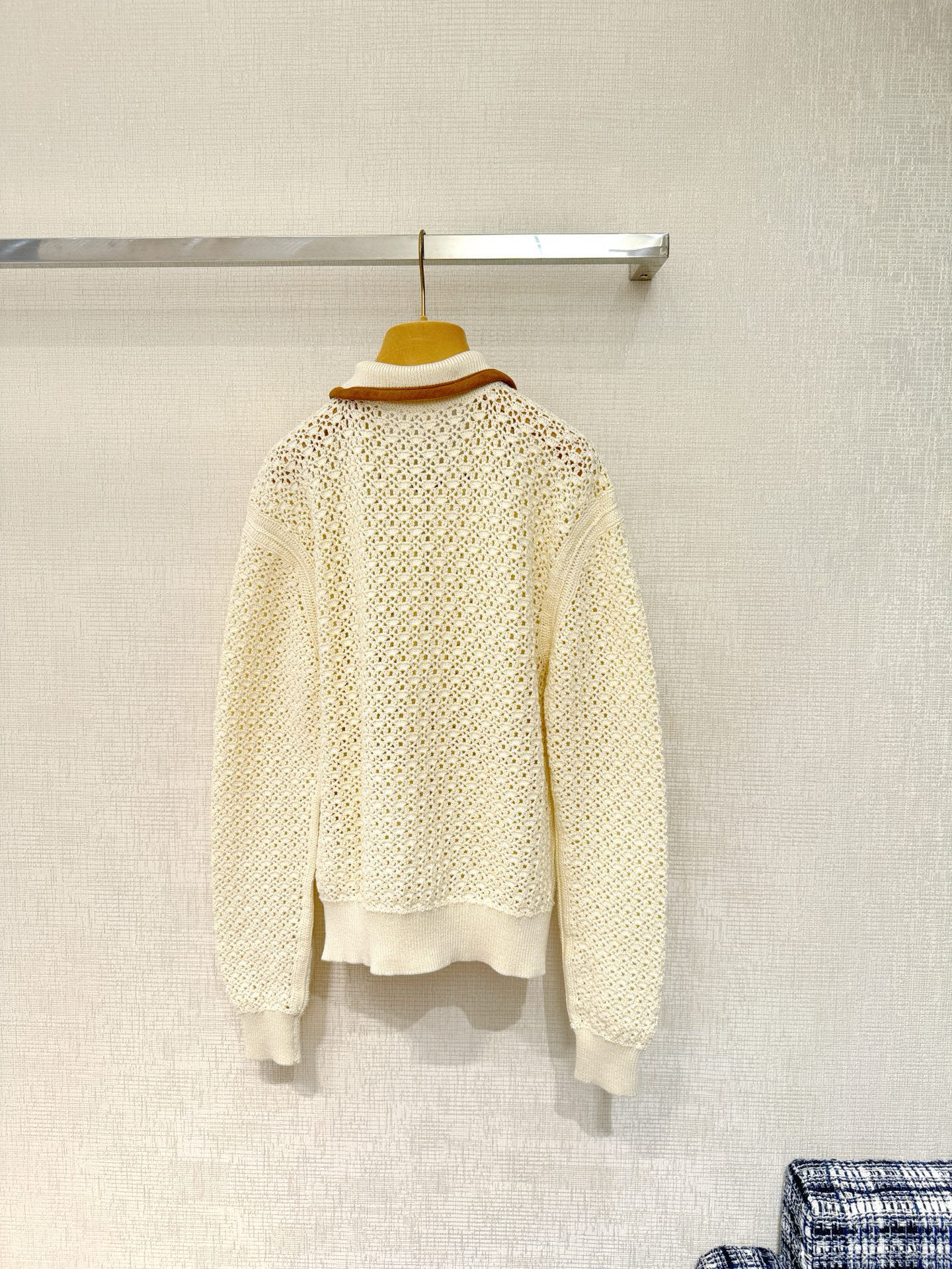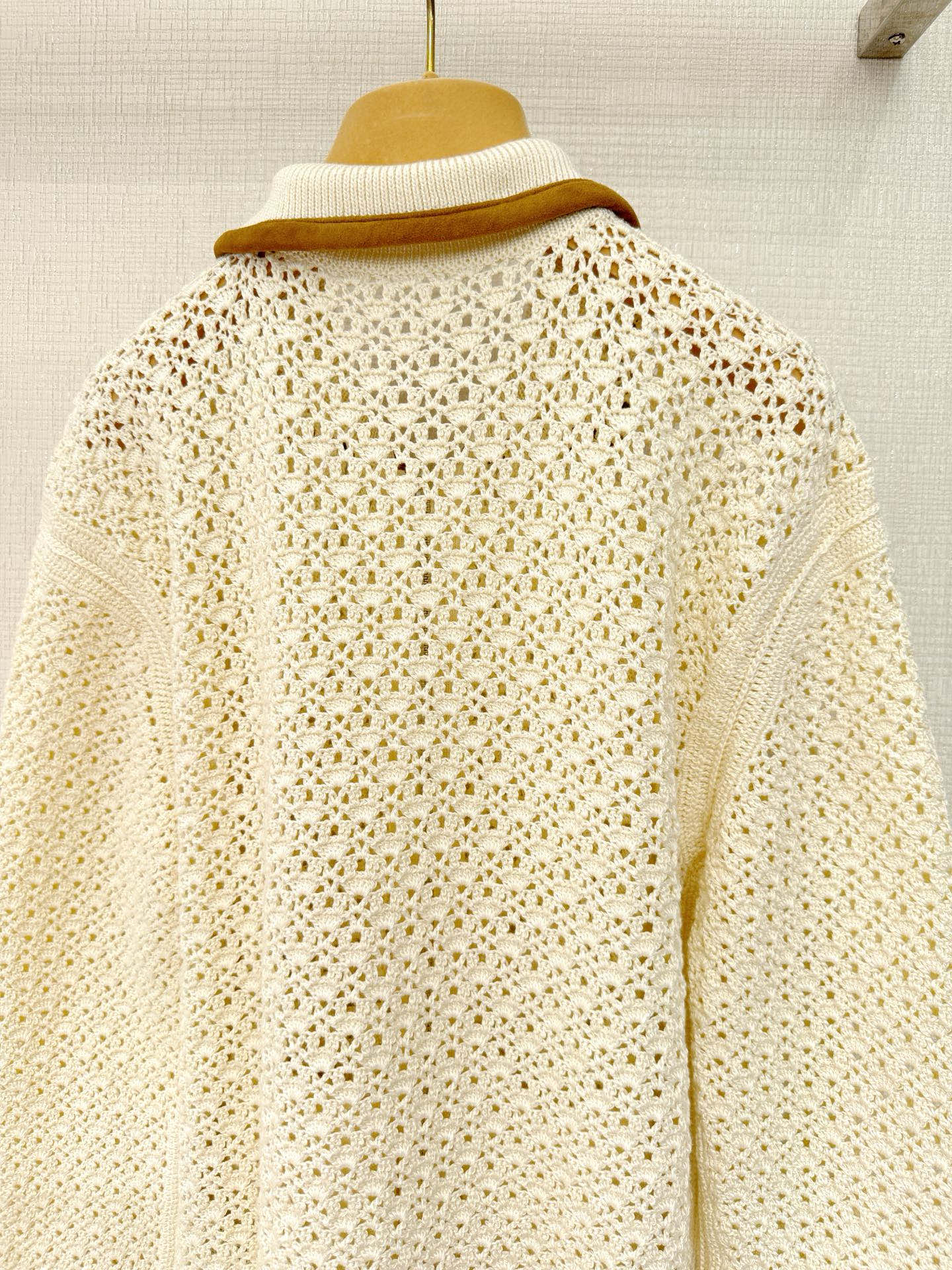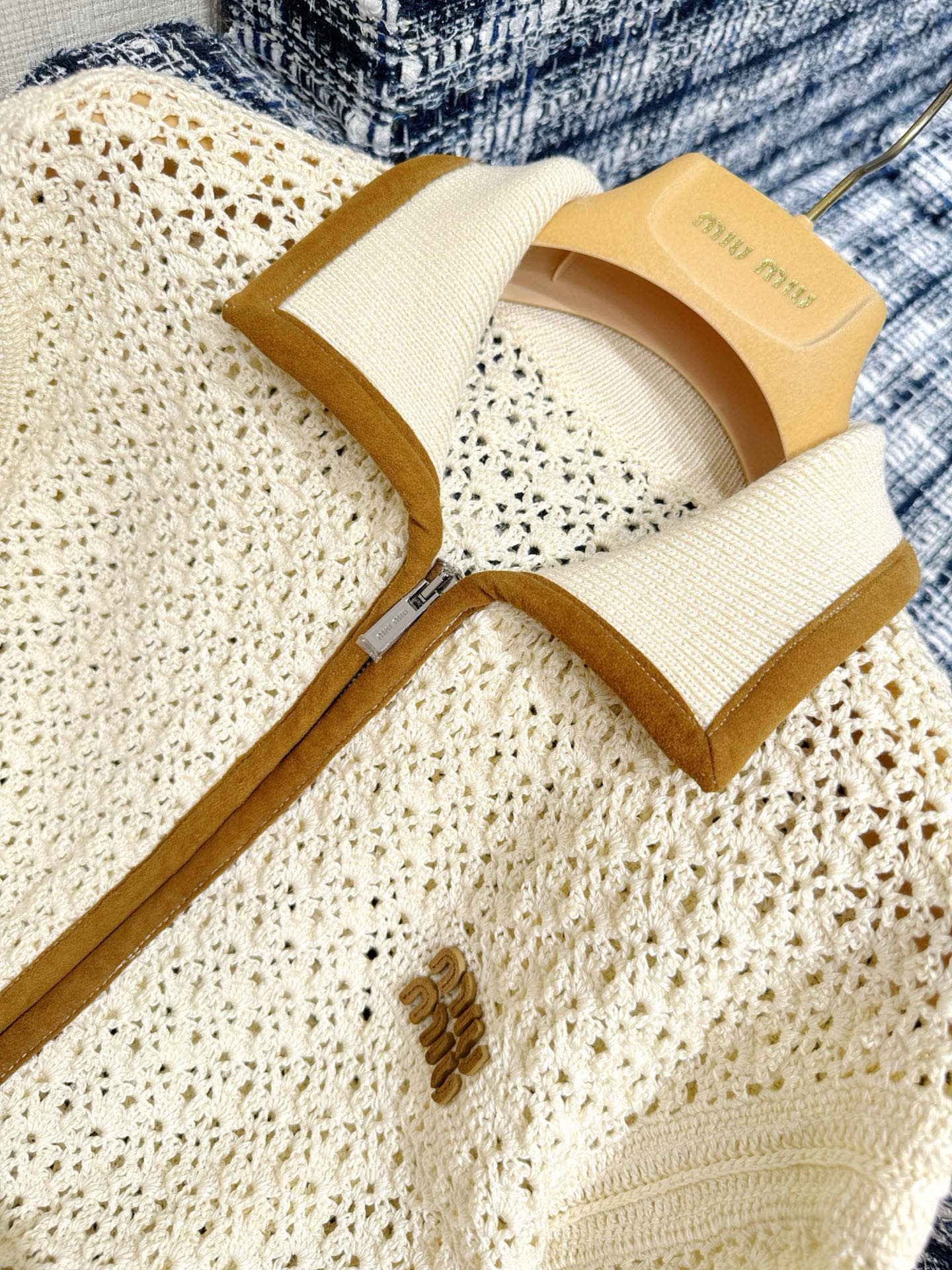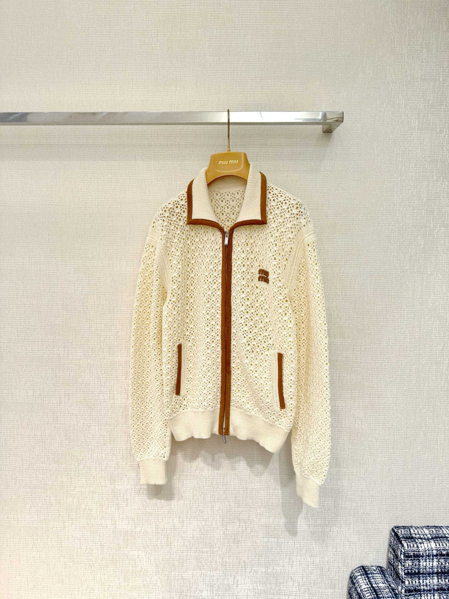 Кардиган Miu Miu выполнен из мягкого хлопка молочного оттенка в стиле ажурной вязки. Модель имеет свободный крой и застежку на молнию. Воротник-стойка, манжеты и нижняя планка выполнены из плотной резинки, а коричневые отделочные элементы придают изделию стильный акцент. На груди присутствует декоративная вышивка с логотипом бренда. Кардиган отличается легкостью и комфортом, идеально подходит для создания современных образов в стиле casual.