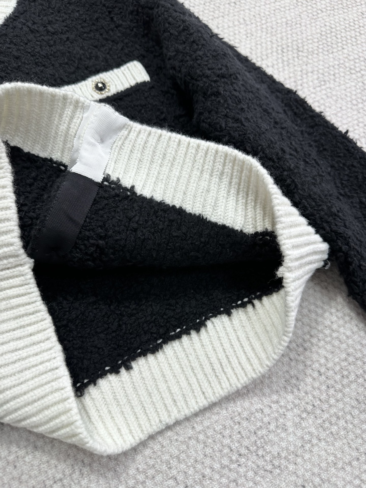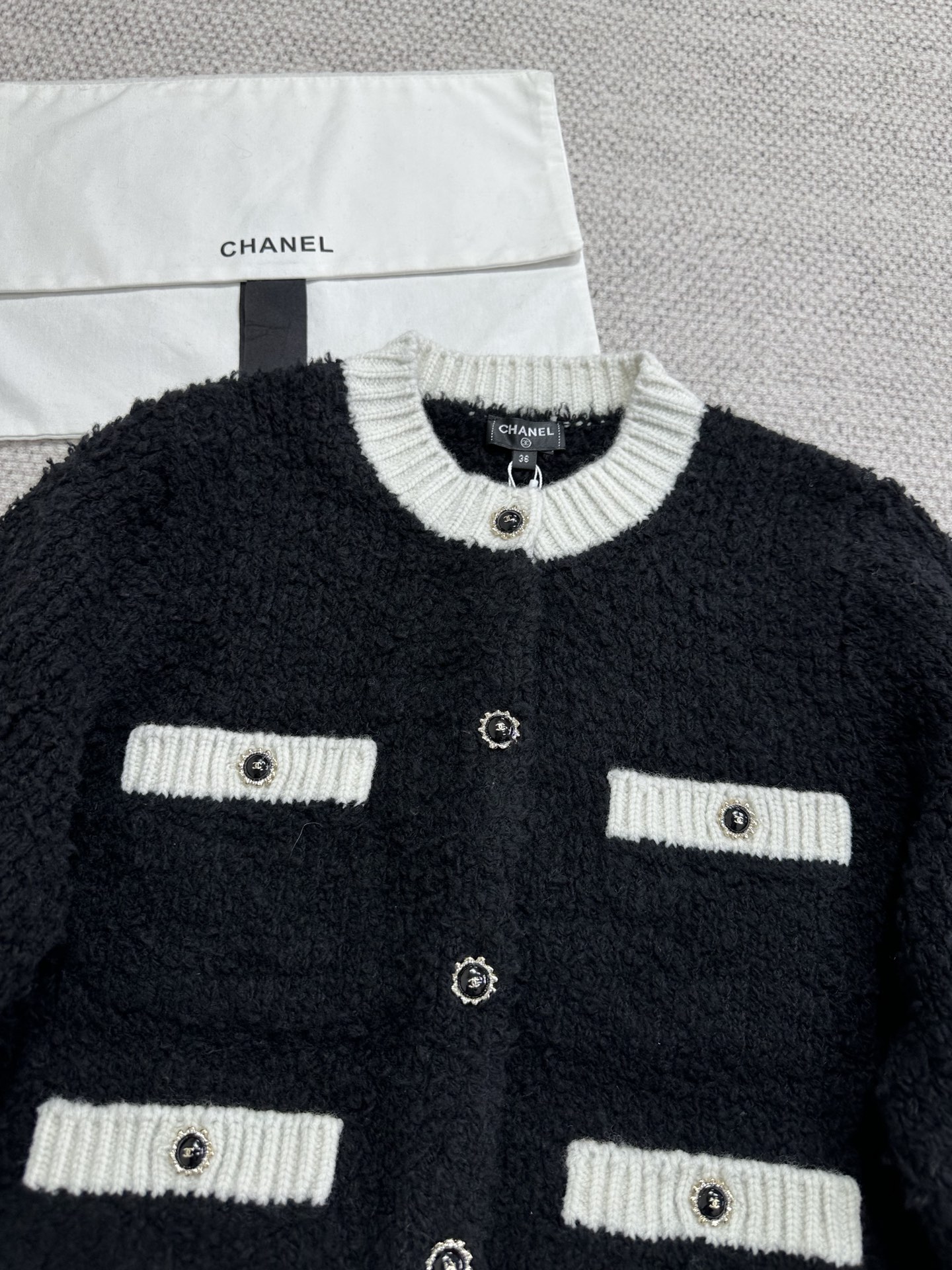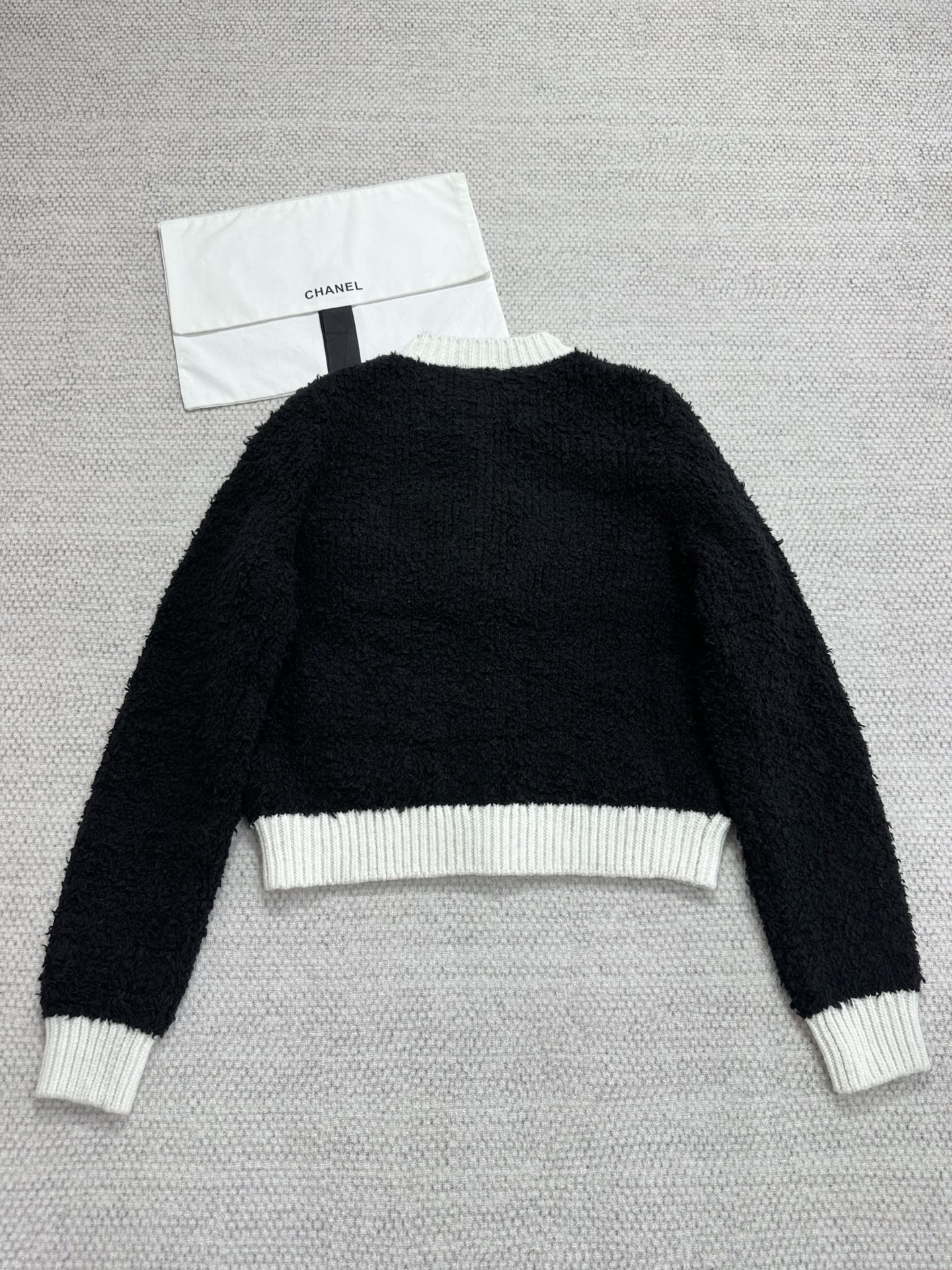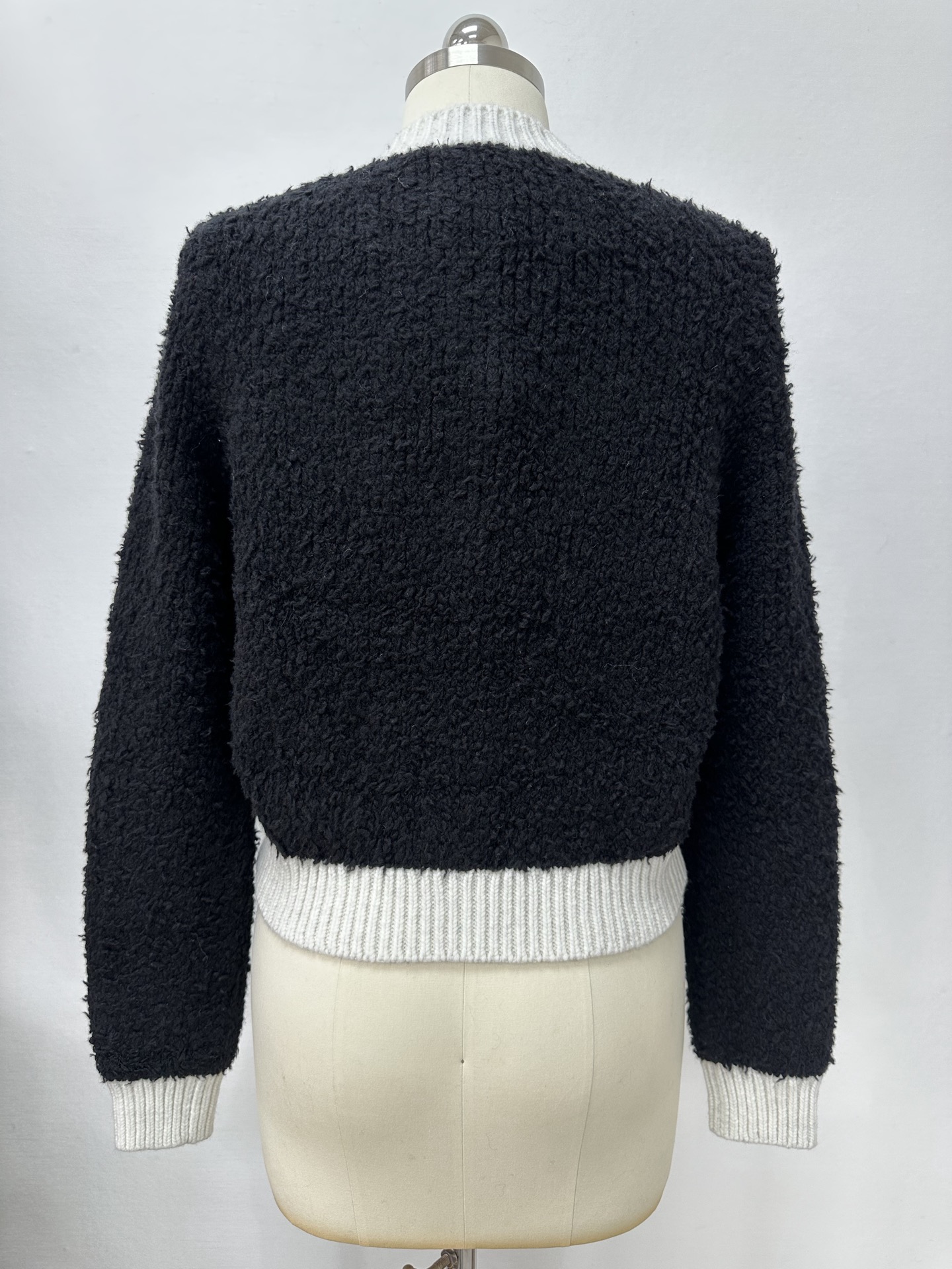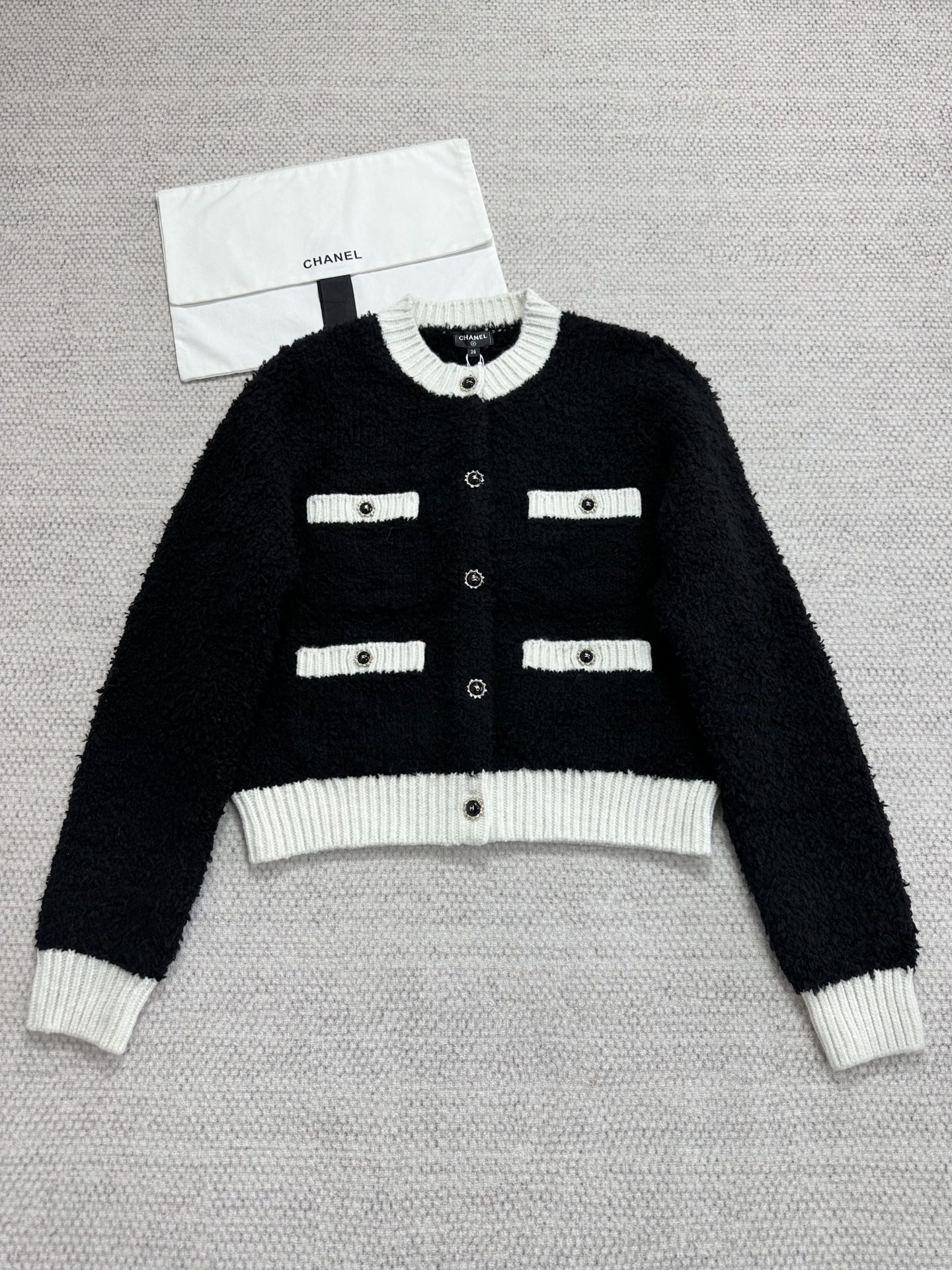 Элегантный черно‑белый кардиган в ретро‑стиле, идеально подходящий для городских и вечерних образов. Выполнен из текстурной вязки (букле или смесовый трикотаж) глубокого чёрного оттенка с контрастными белыми ребристыми манжетами, воротником и поясом. Модель имеет укороченную, слегка коробчатую посадку и четыре декоративных накладных кармана с белыми клапанами. Центральная застёжка — ряд декоративных пуговиц с металлизированной отделкой, которые придают изделию роскошный акцент.