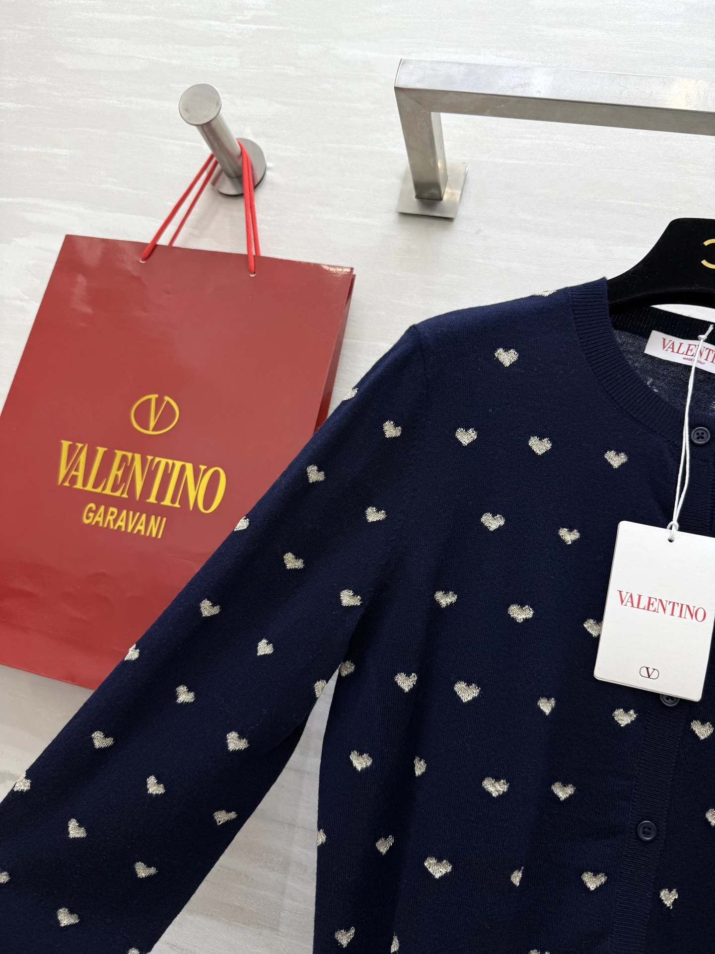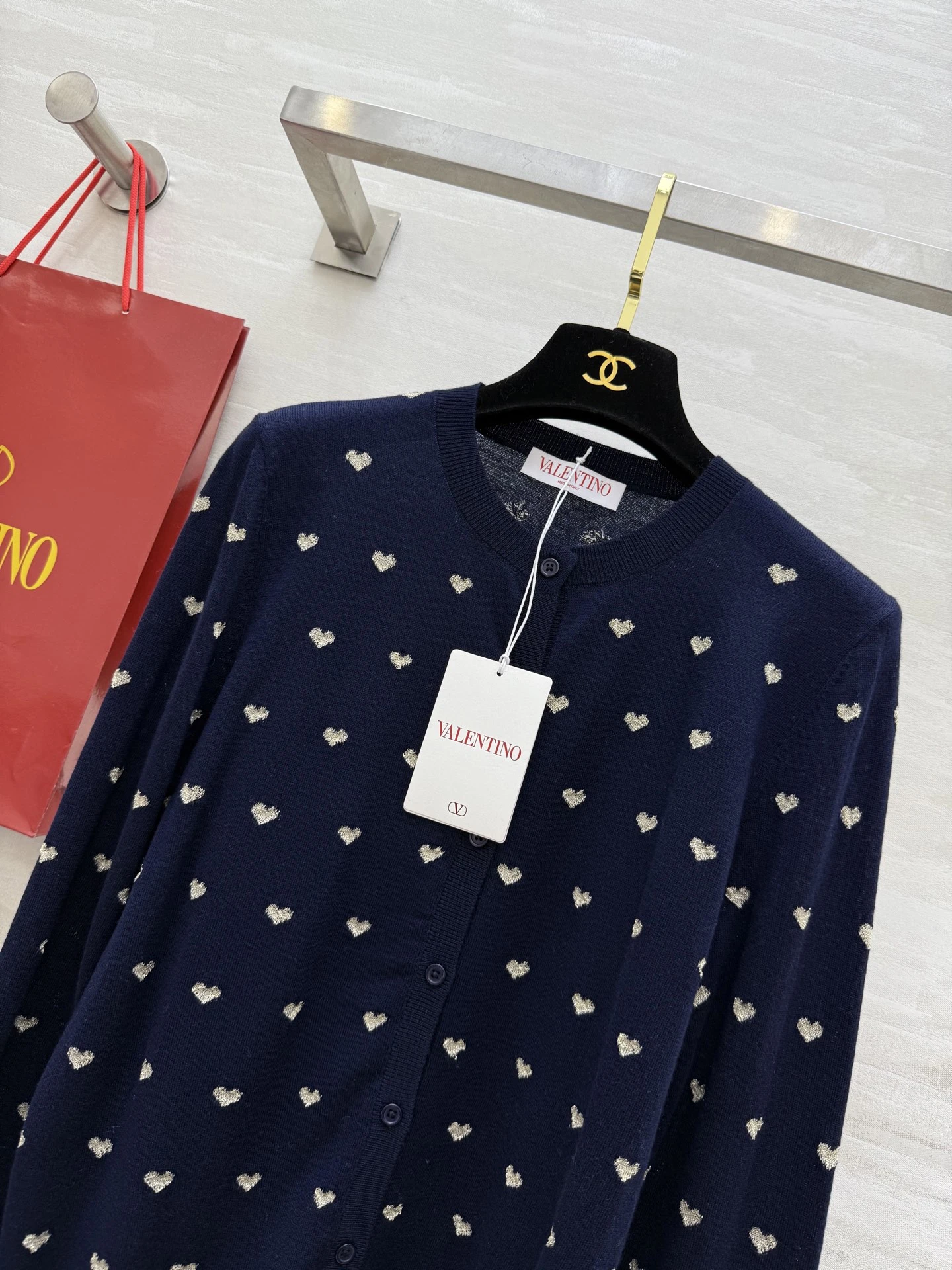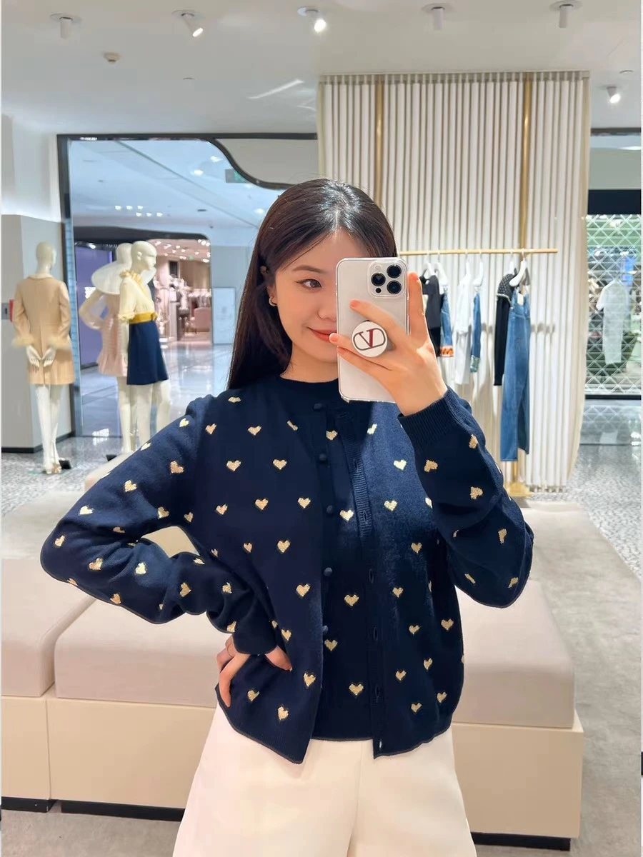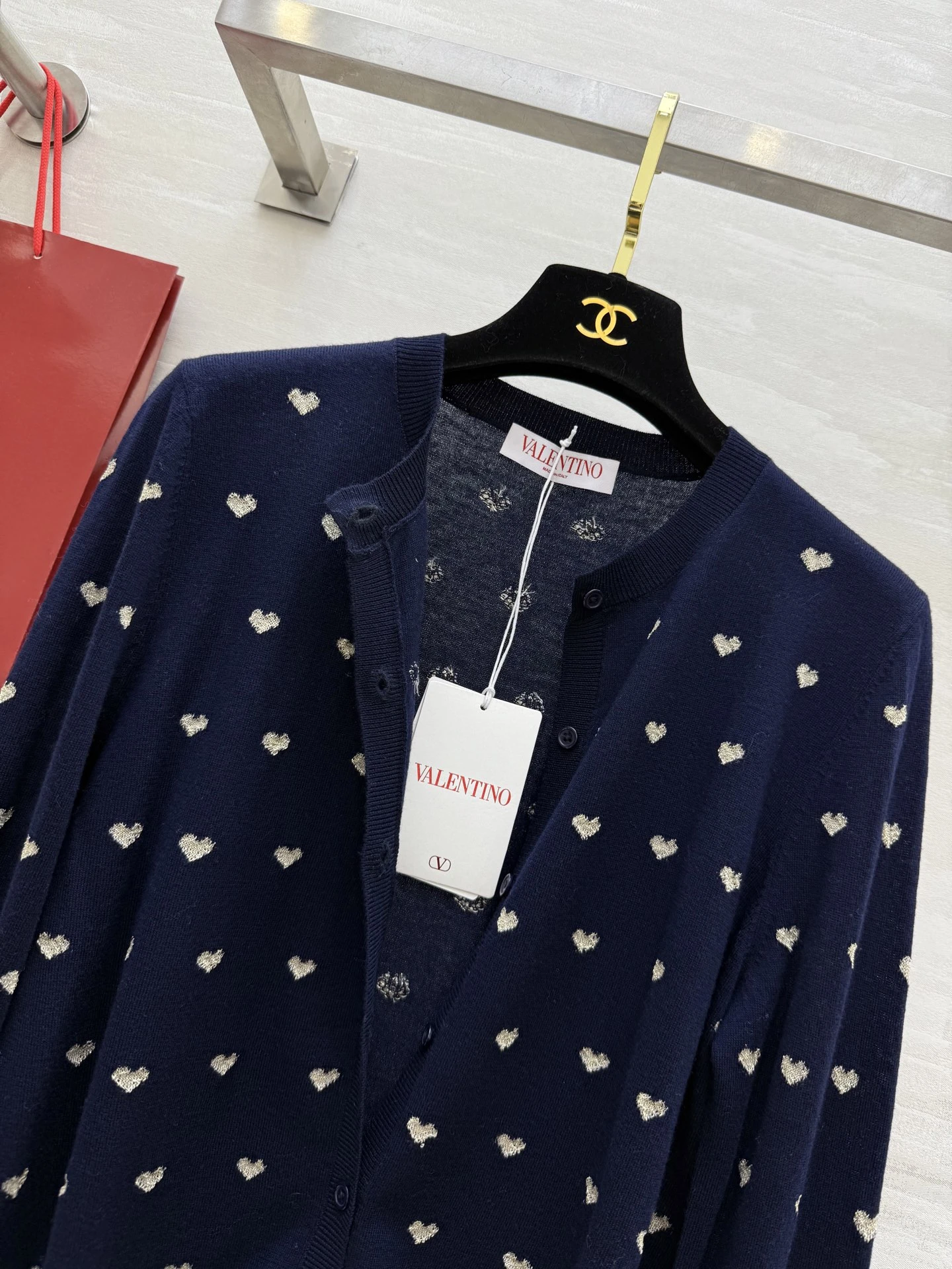 Элегантный женский кардиган темно‑синего цвета с оригинальным декором в виде маленьких золотистых сердечек. Универсальная модель с круглым вырезом и центральной застёжкой на пуговицы — идеальный выбор для создания повседневного и вечернего образа.