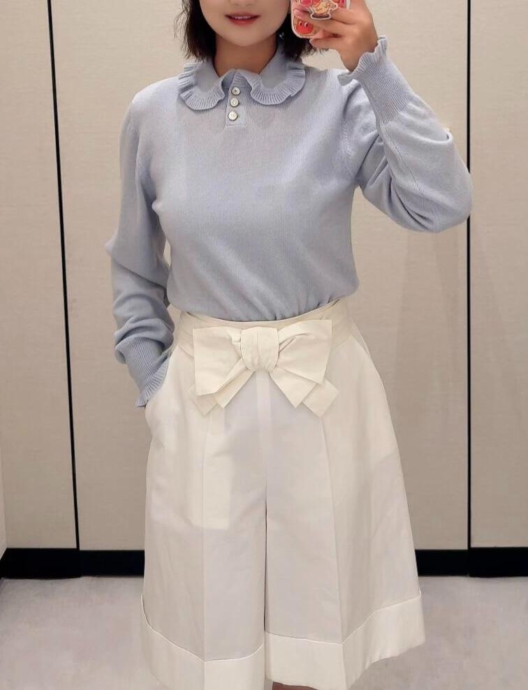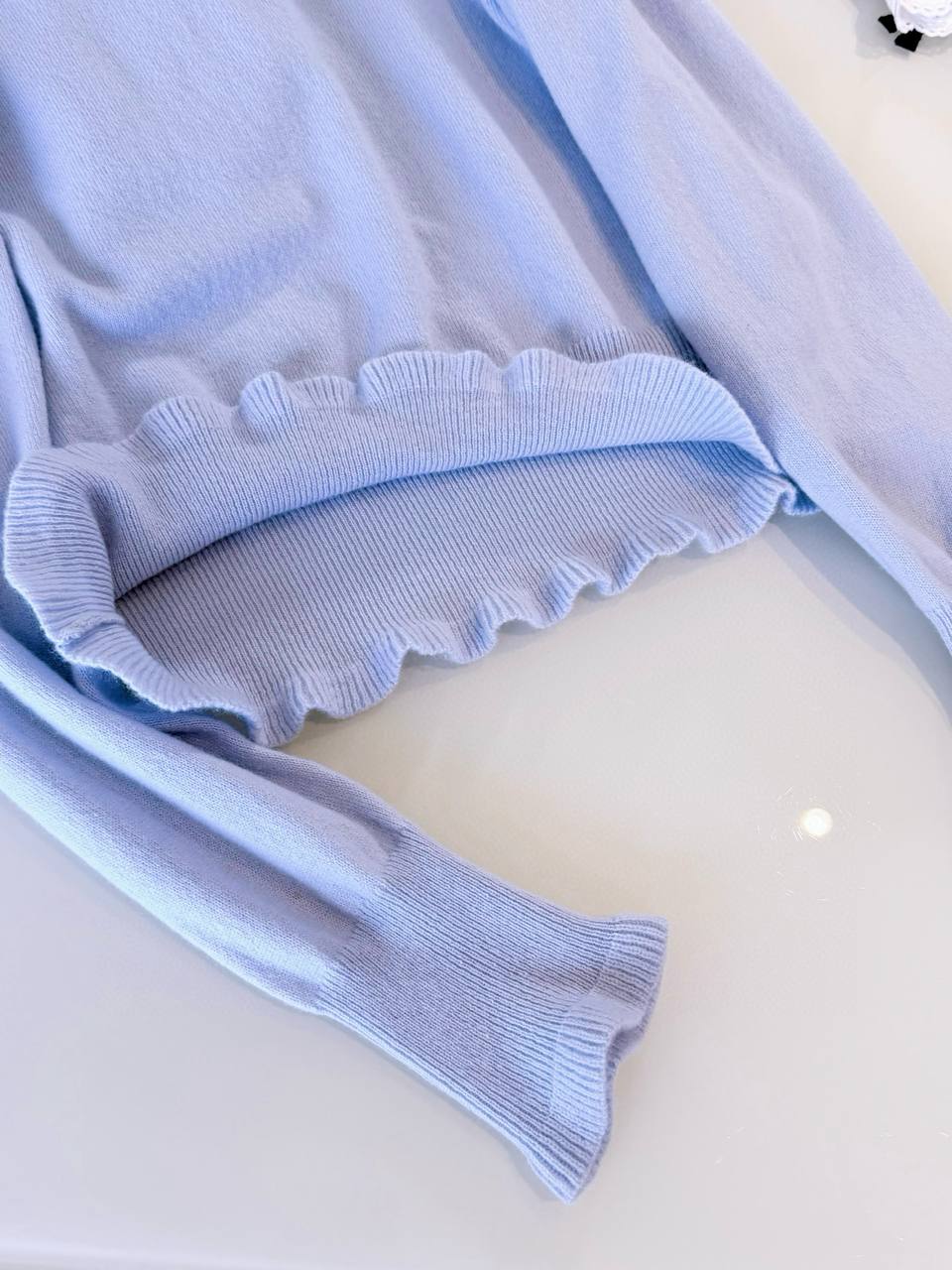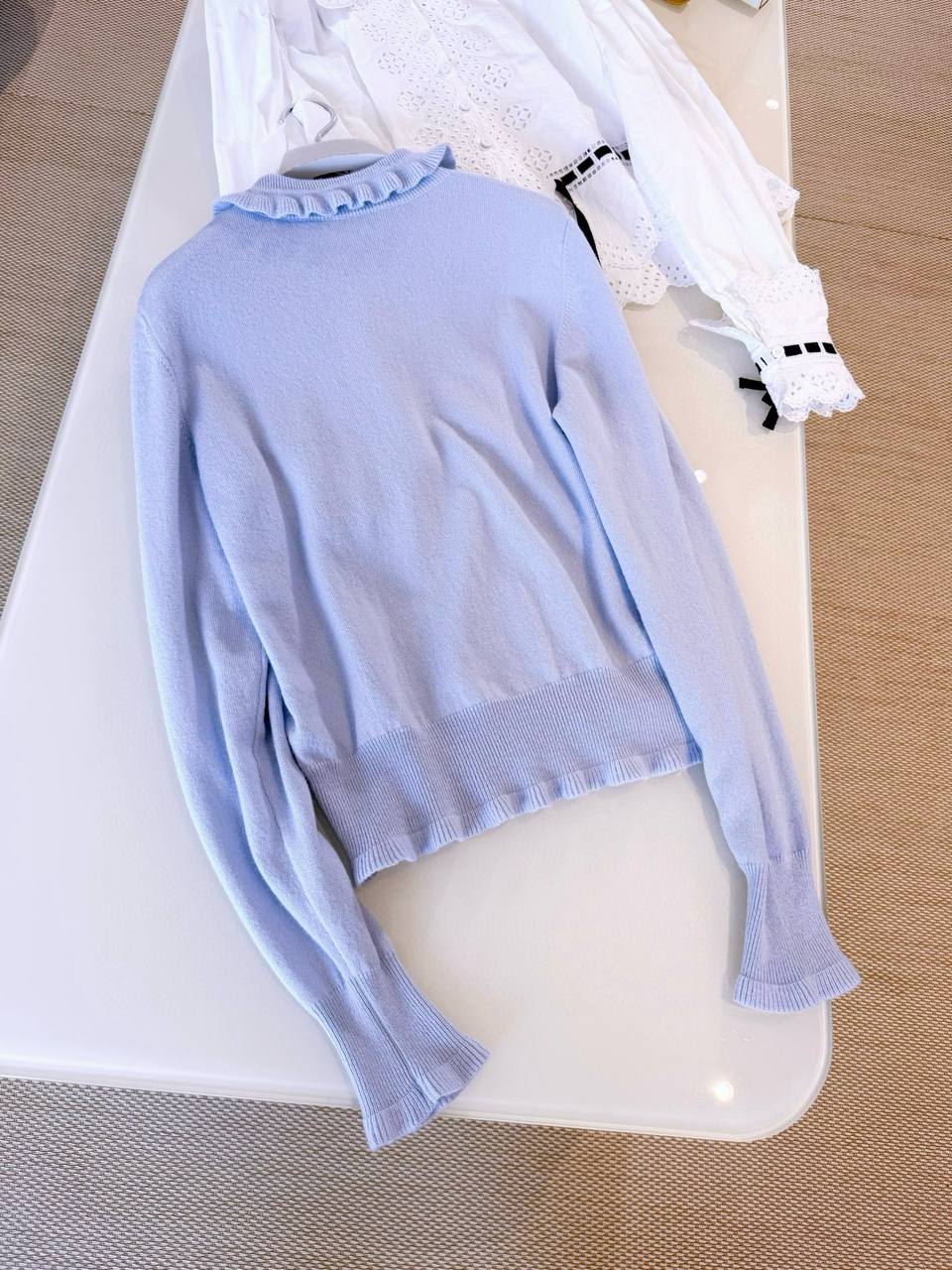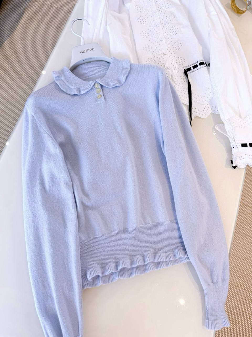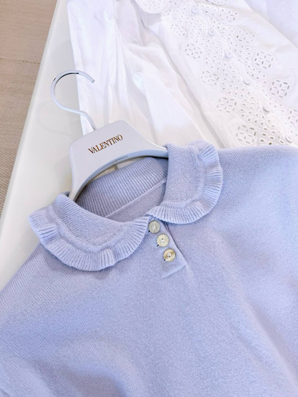 Откройте для себя утонченную элегантность с женским свитером из кашемира от Valentino. Выполненный в нежном небесно-голубом оттенке, этот свитер воплощает светлый и романтичный стиль. Изысканная круглая горловина украшена аккуратным рюшевым воротником, который добавляет образу нотку женственности и винтажного шарма. На вороте расположена короткая планка с тремя аккуратными жемчужными пуговицами — утонченная деталь, подчеркивающая премиальное качество изделия.