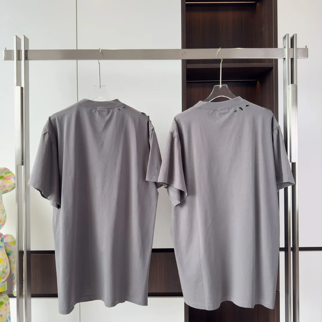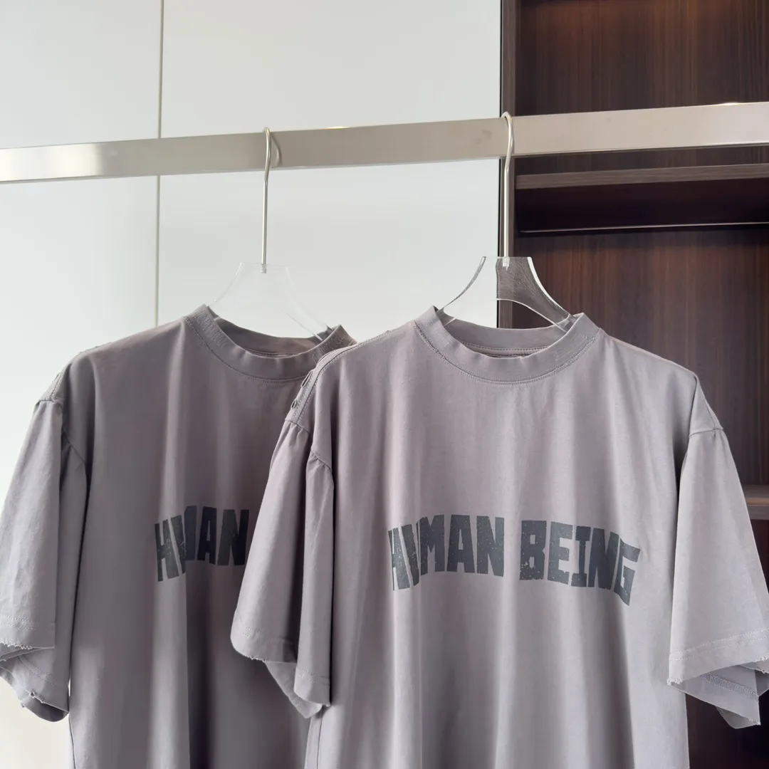 Стильная мужская футболка Balenciaga серого цвета с принтом «HUMAN BEING» на груди.