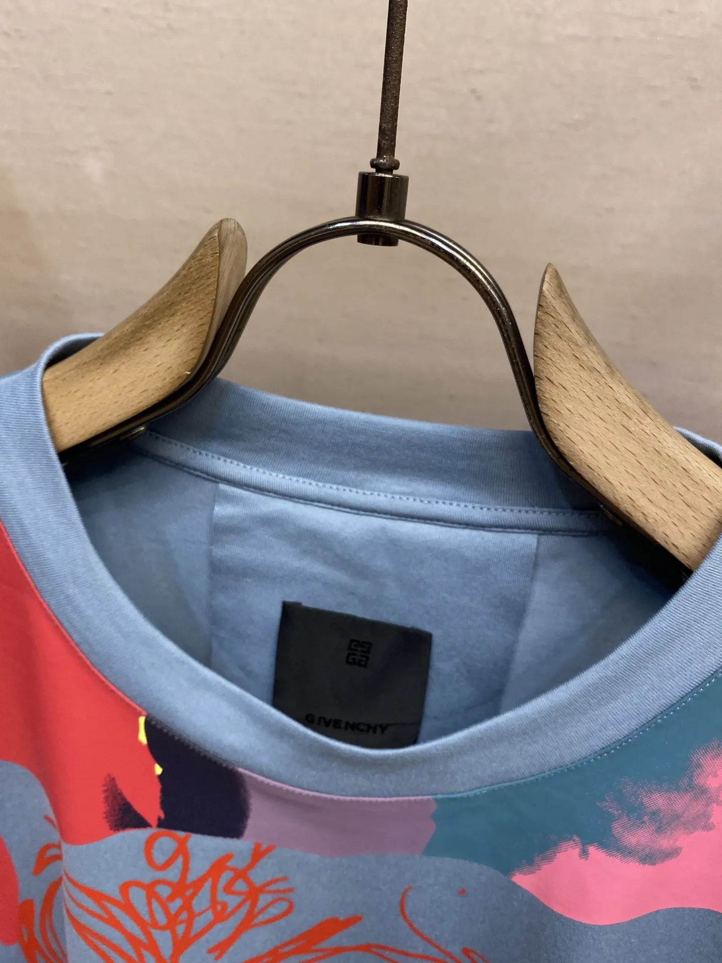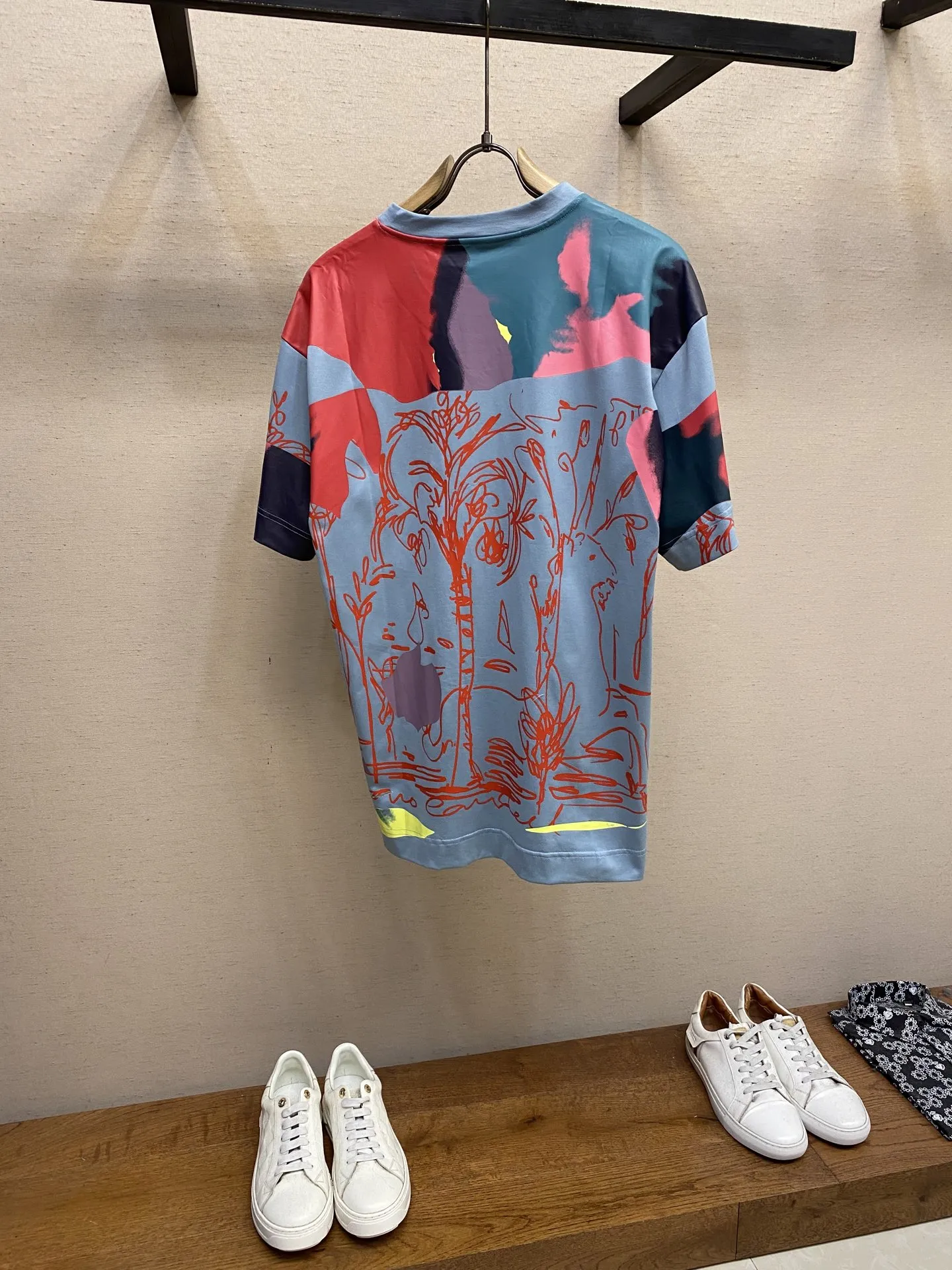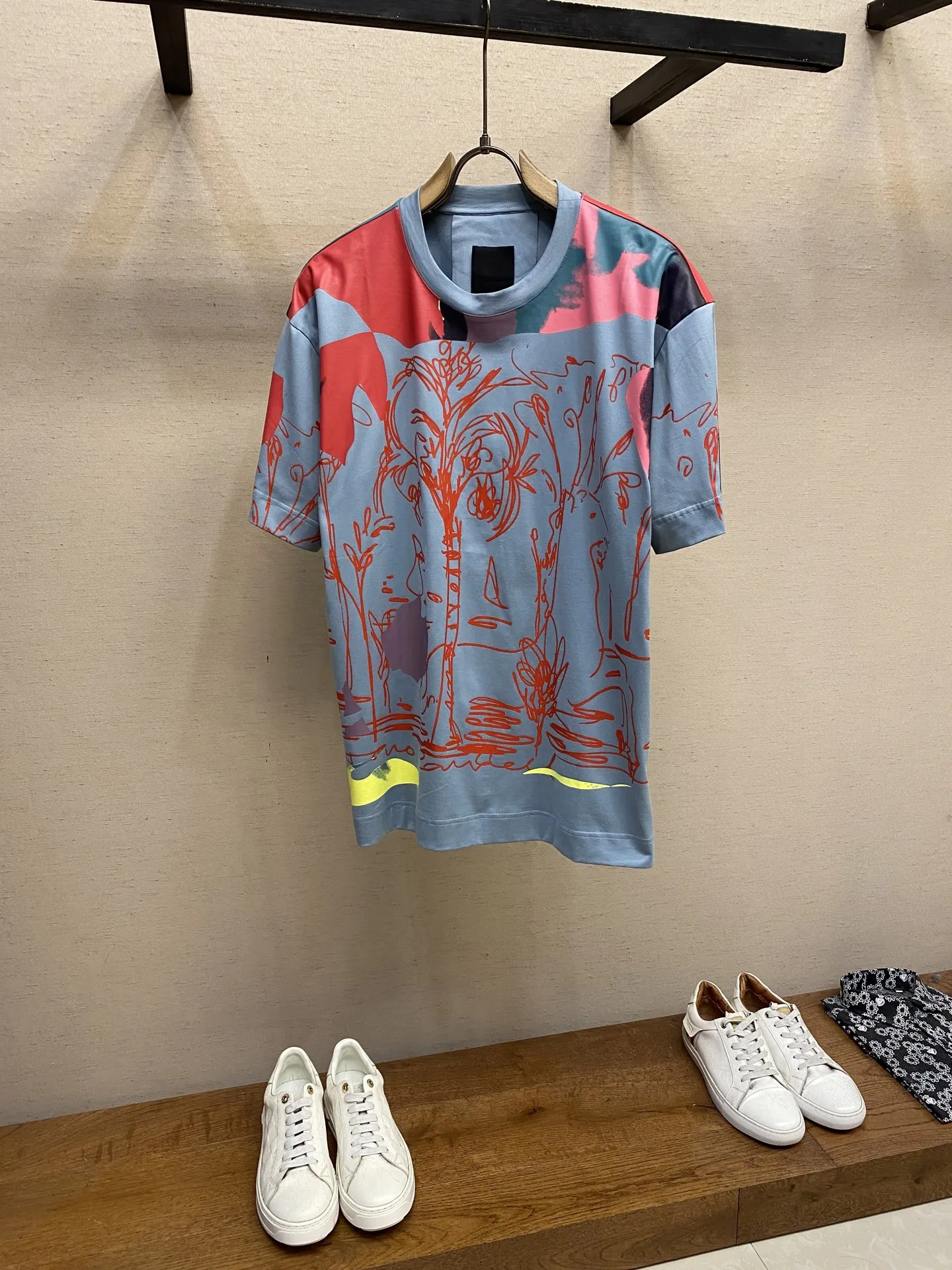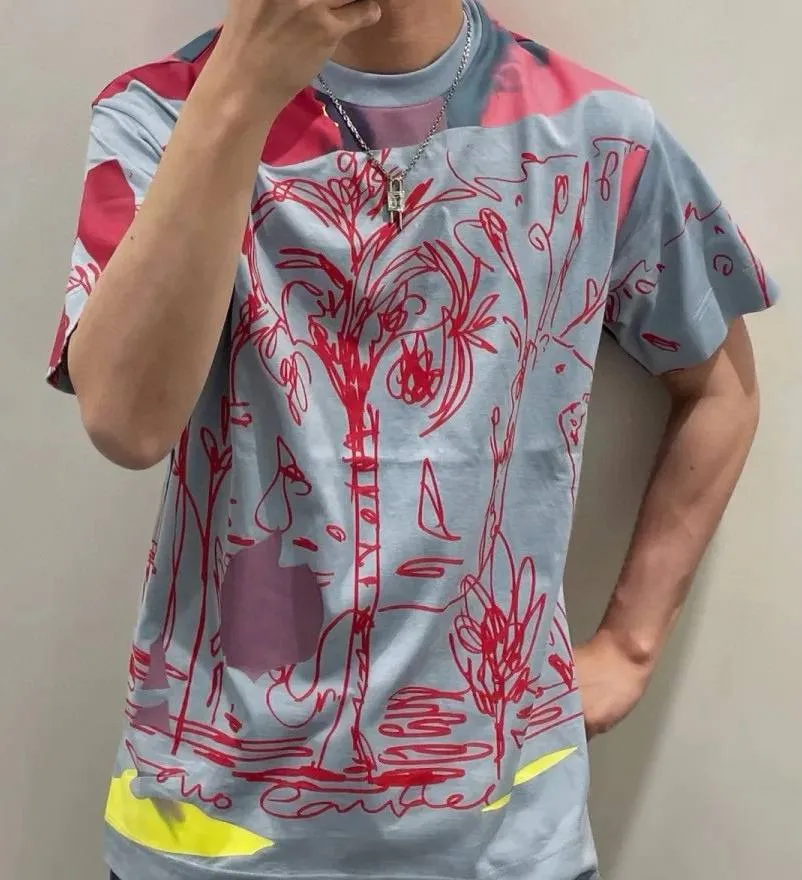 Мужская футболка Givenchy выполнена из высококачественного хлопка, обеспечивая комфорт и стиль на каждый день. Модель представлена в голубом цвете с оригинальным насыщенным принтом в красных и розовых тонах, который придаёт образу динамичность и индивидуальность. Детали декора включают абстрактные и растительные мотивы, а также яркие акценты желтого цвета в нижней части изделия.