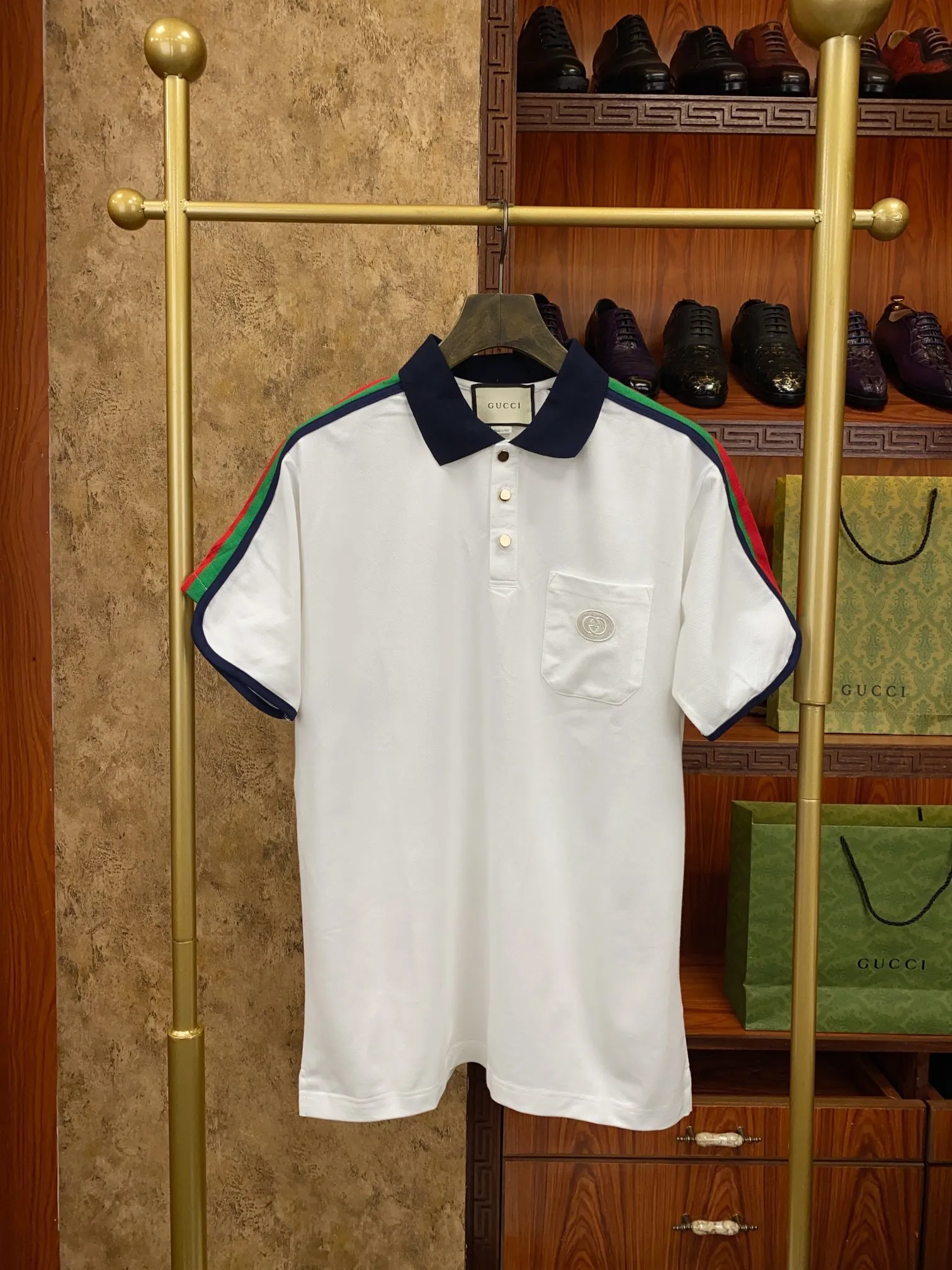 Элегантная футболка-поло Gucci из премиальной хлопковой сетки пике. Классический лацкан и изысканная вышивка с культовыми буквами Gucci делают эту модель идеальным выбором как для деловой встречи, так и для непринужденного отдыха. Высококачественная ткань пике-хлопок обеспечивает комфорт и долговечность.