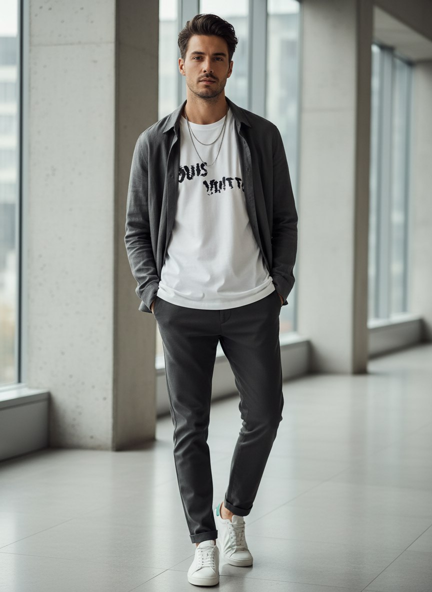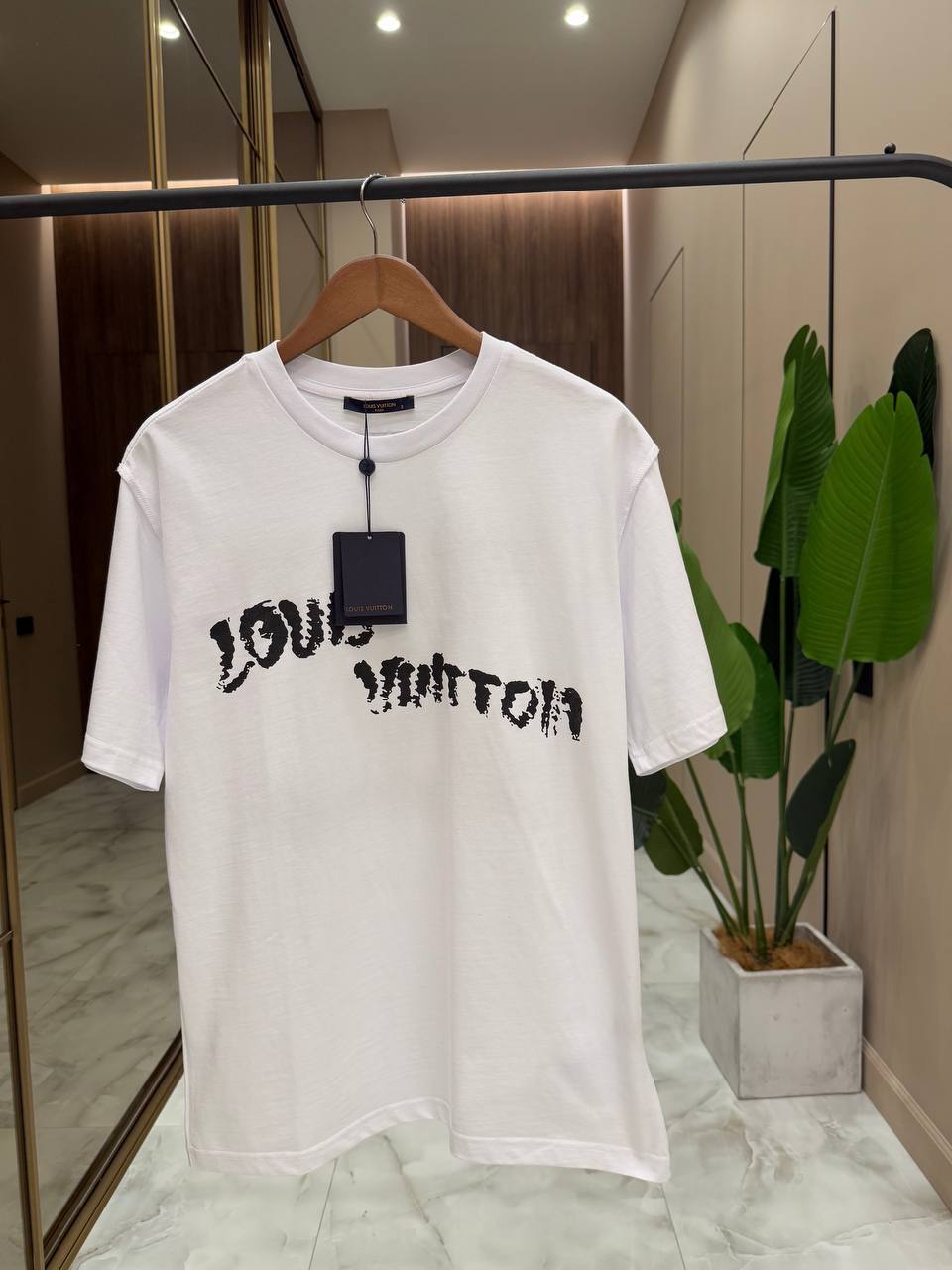 Эта мужская футболка от LOUIS VUITTON — сочетание простоты, стиля и узнаваемого брендового дизайна. Она станет универсальным и элегантным дополнением вашего гардероба. На передней части футболки расположена надпись "Louis Vuitton", которая добавляет изысканности и подчеркивает принадлежность к бренду, а большие буквы LV на спине только усиливают это значение. Футболка не просто предмет одежды, а способ выразить свой индивидуальный стиль и приверженность бренду.
