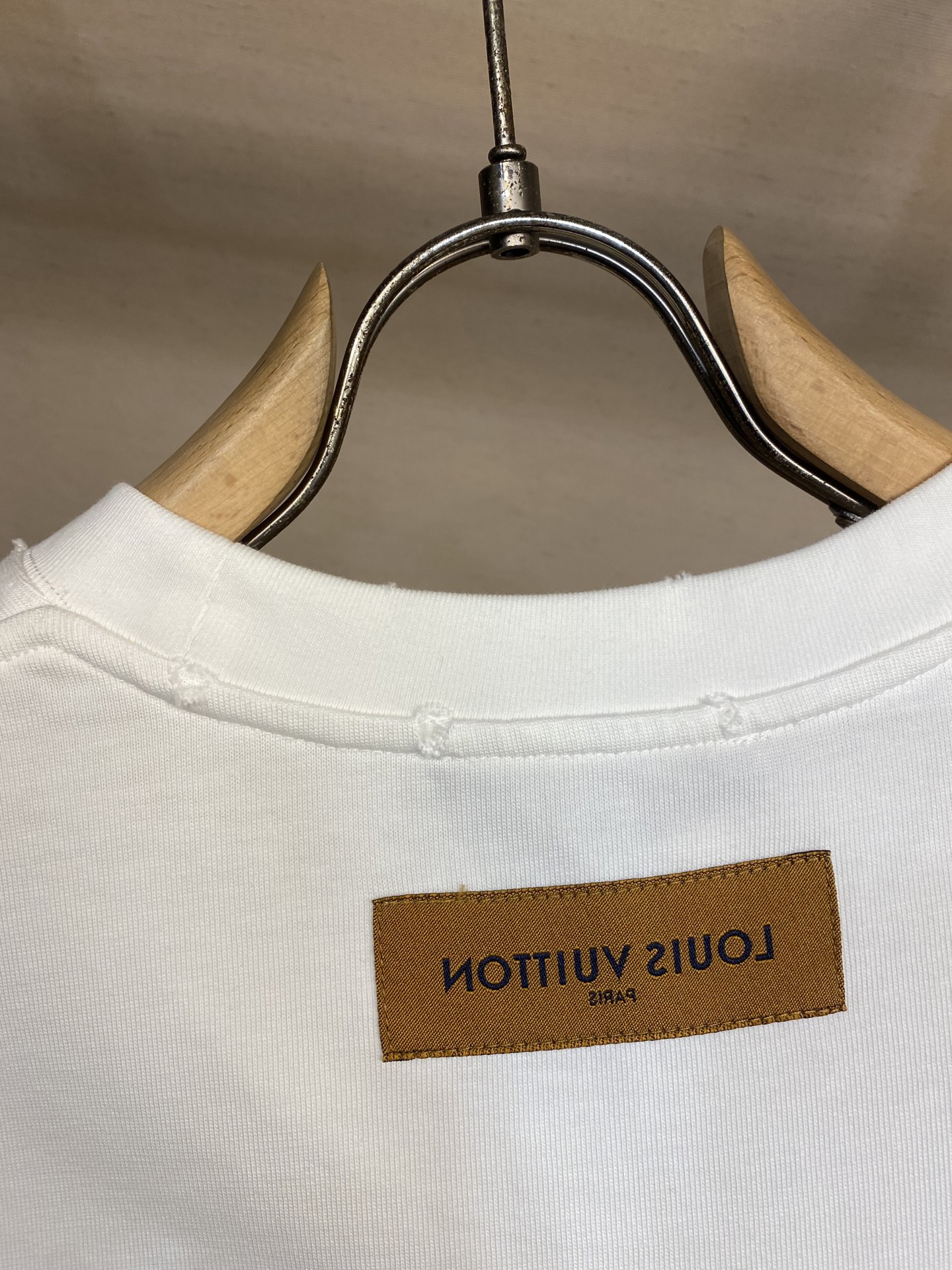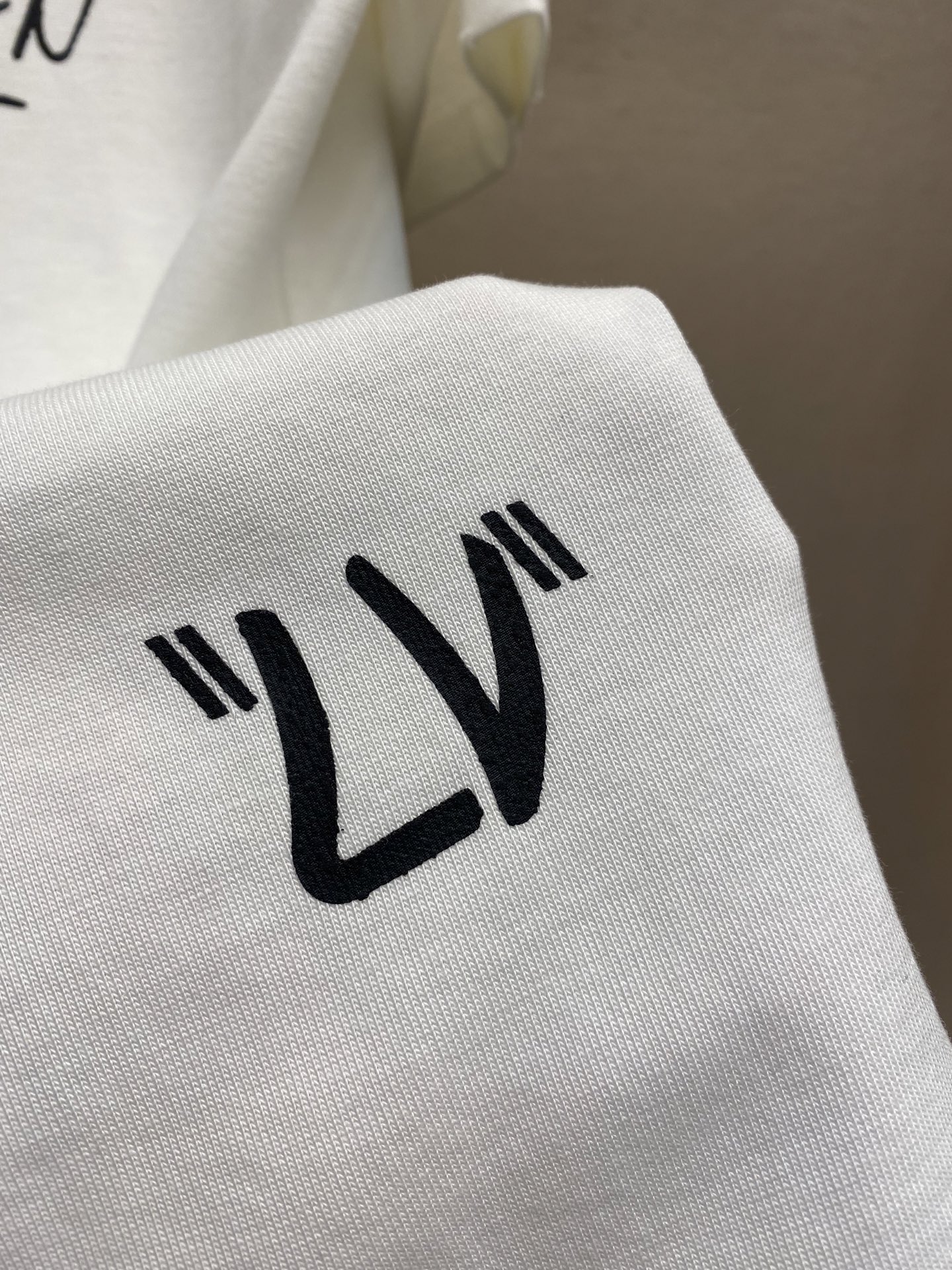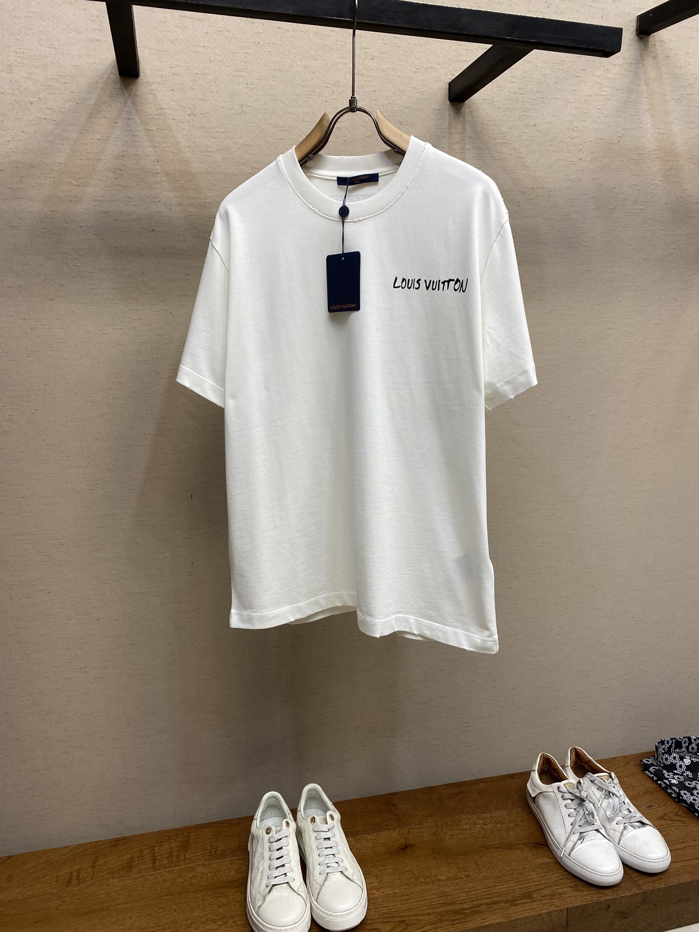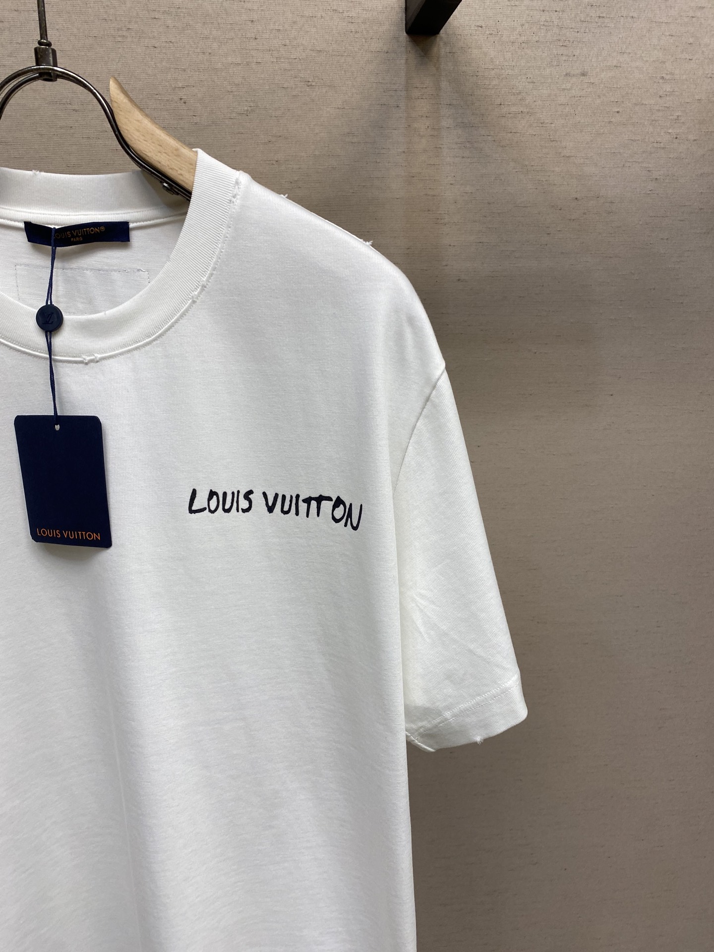 На груди футболки расположен аккуратный фирменный логотип Louis Vuitton в виде надписи, добавляющий стильный акцент и подчеркивающий принадлежность к легендарному бренду. Отлично сочетается с джинсами, брюками и кедами, подходит как для повседневных образов, так и для более стильных комбинаций.