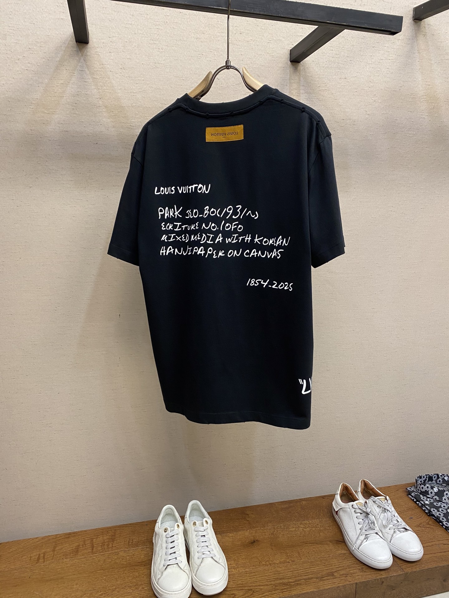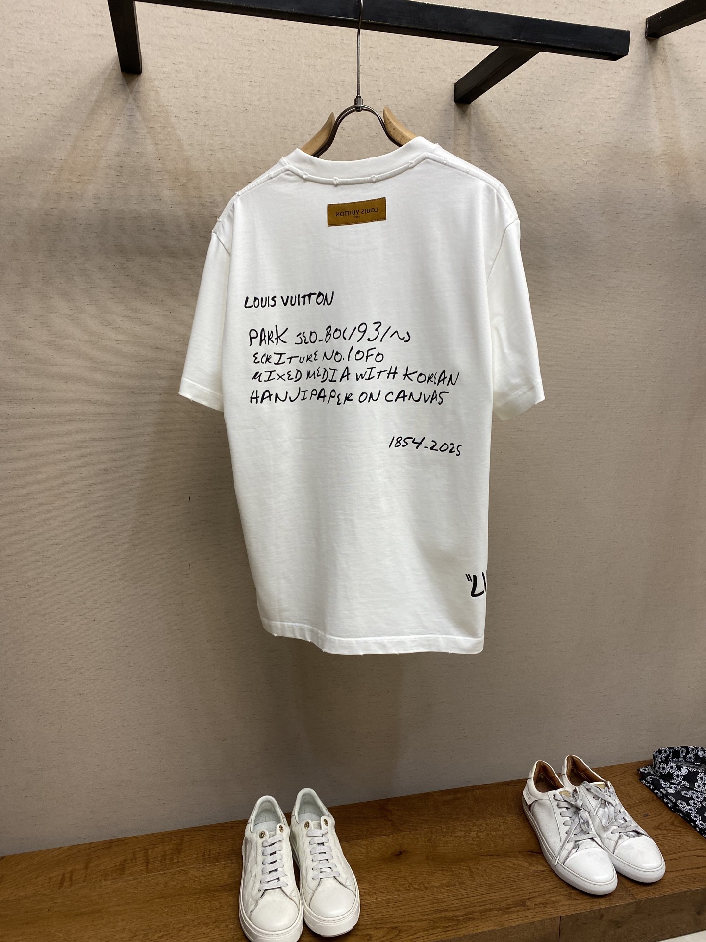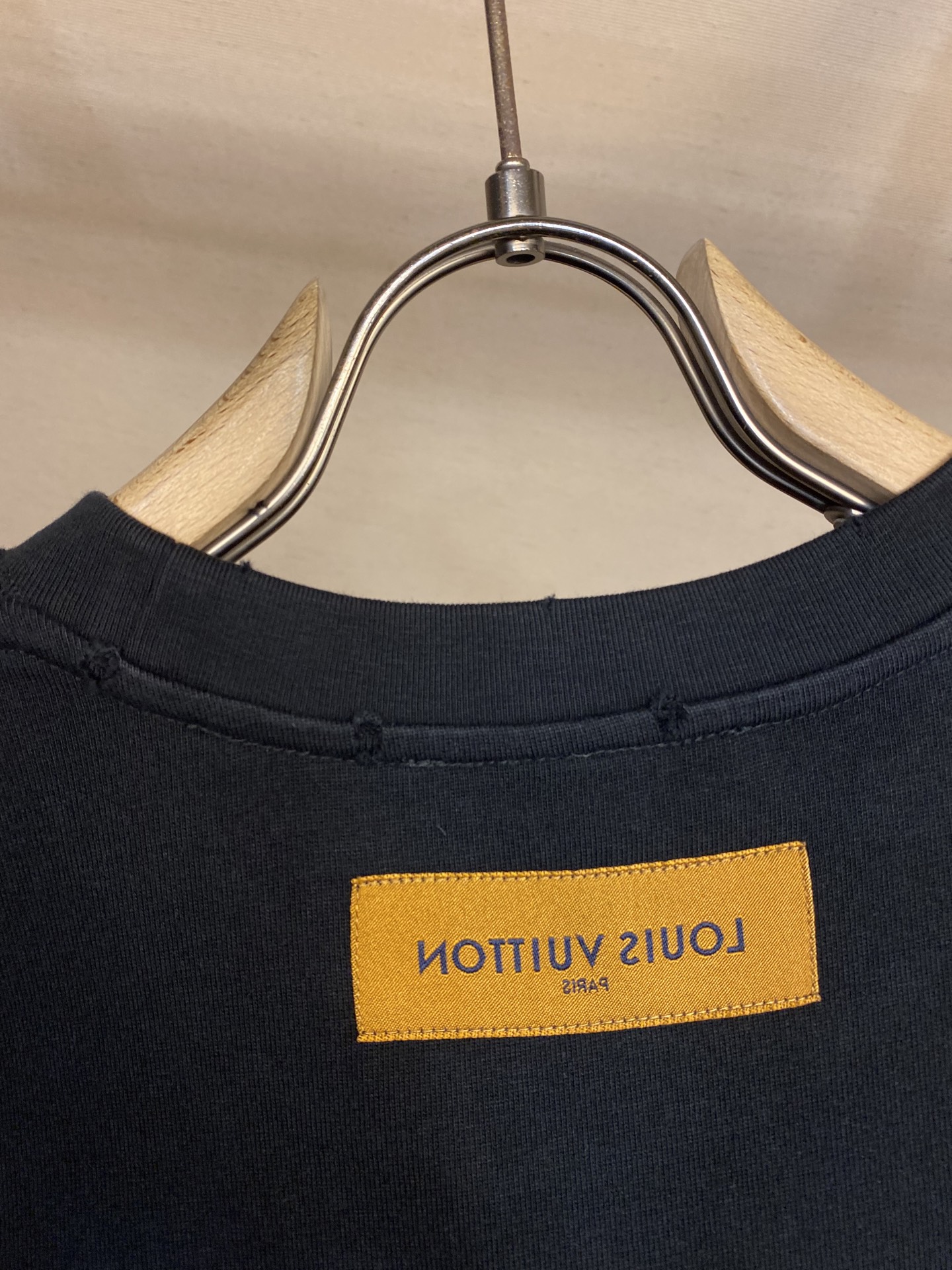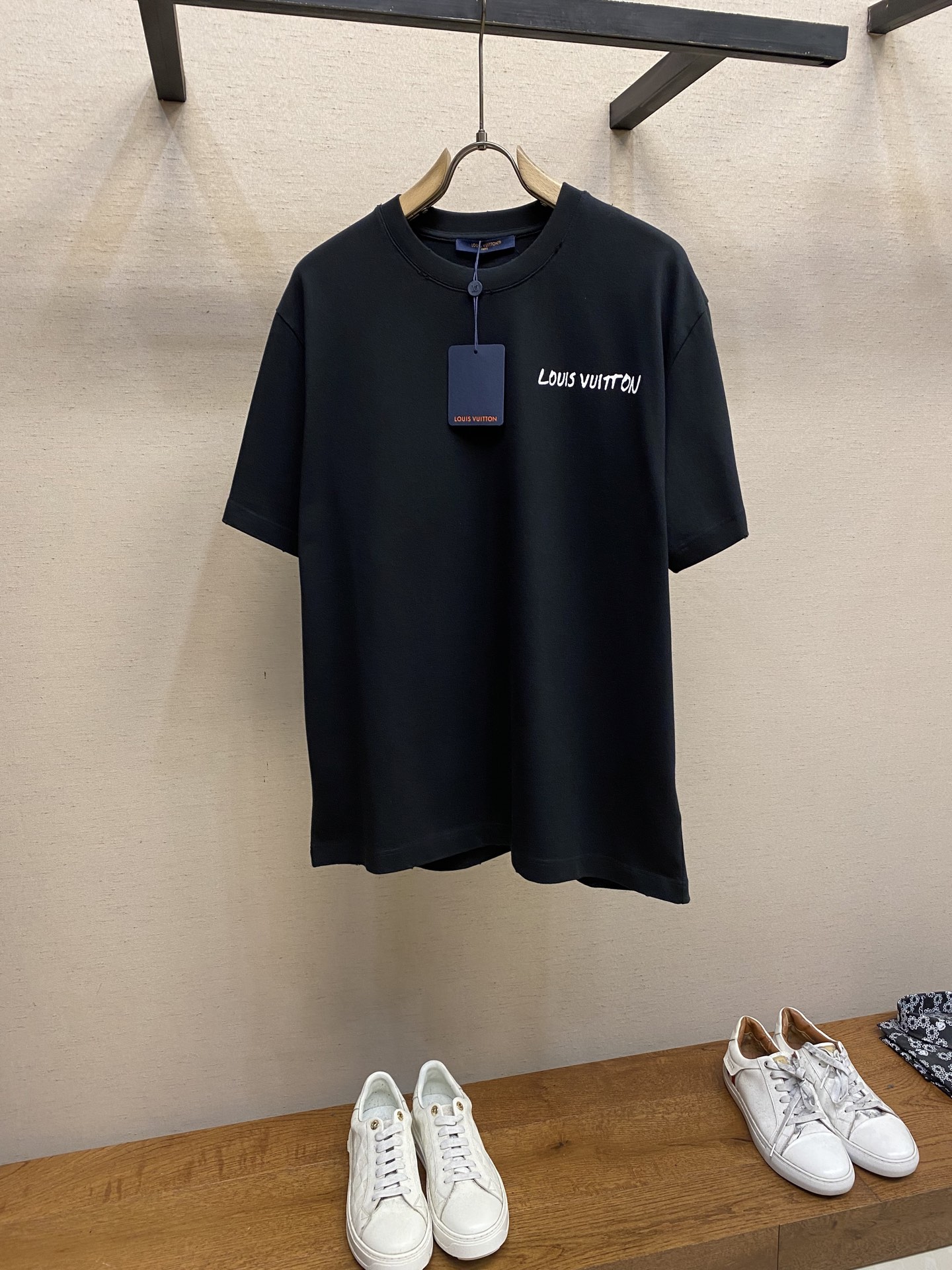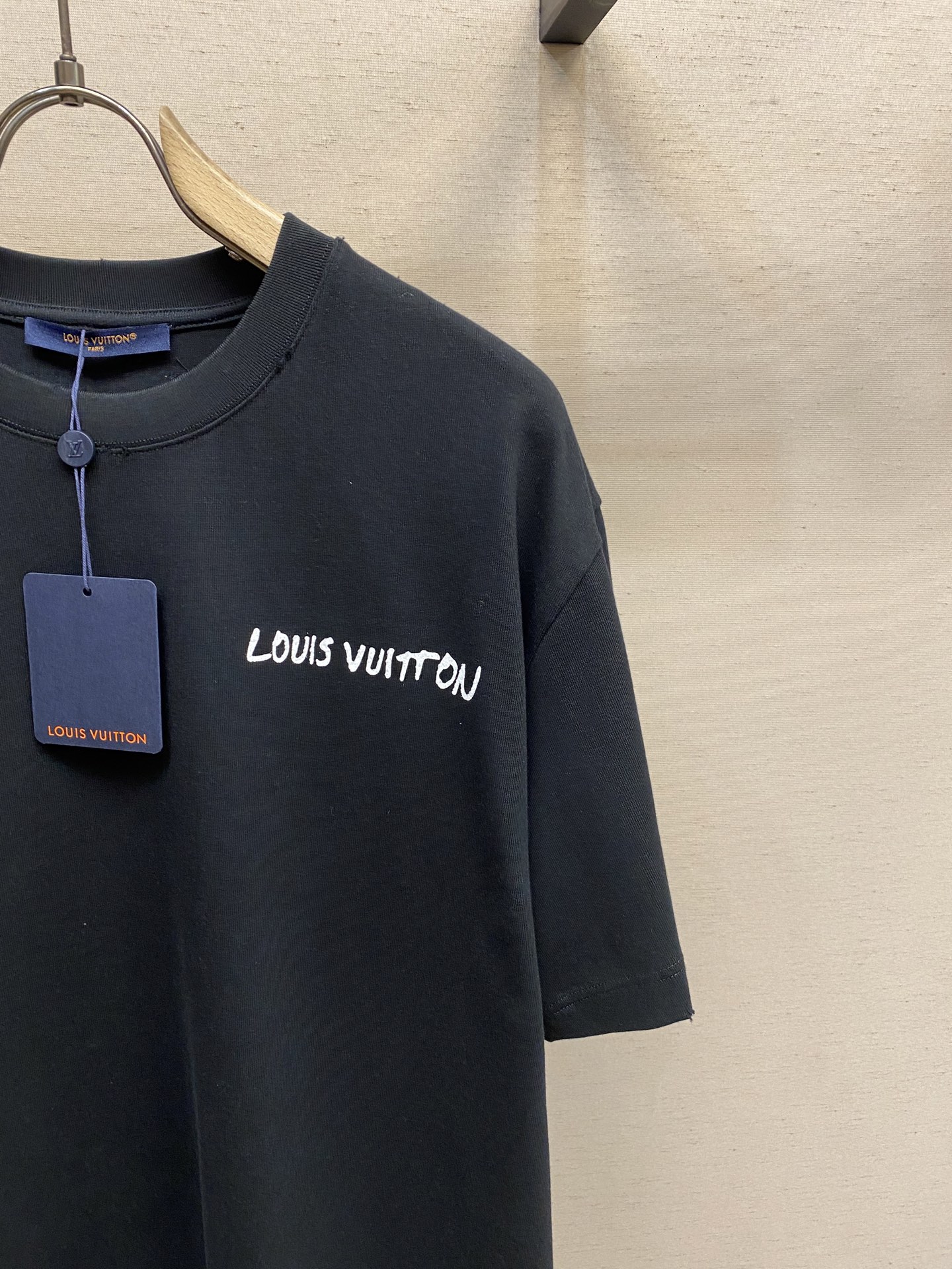 На груди футболки расположен аккуратный фирменный логотип Louis Vuitton в виде надписи, добавляющий стильный акцент и подчеркивающий принадлежность к легендарному бренду. Отлично сочетается с джинсами, брюками и кедами, подходит как для повседневных образов, так и для более стильных комбинаций.