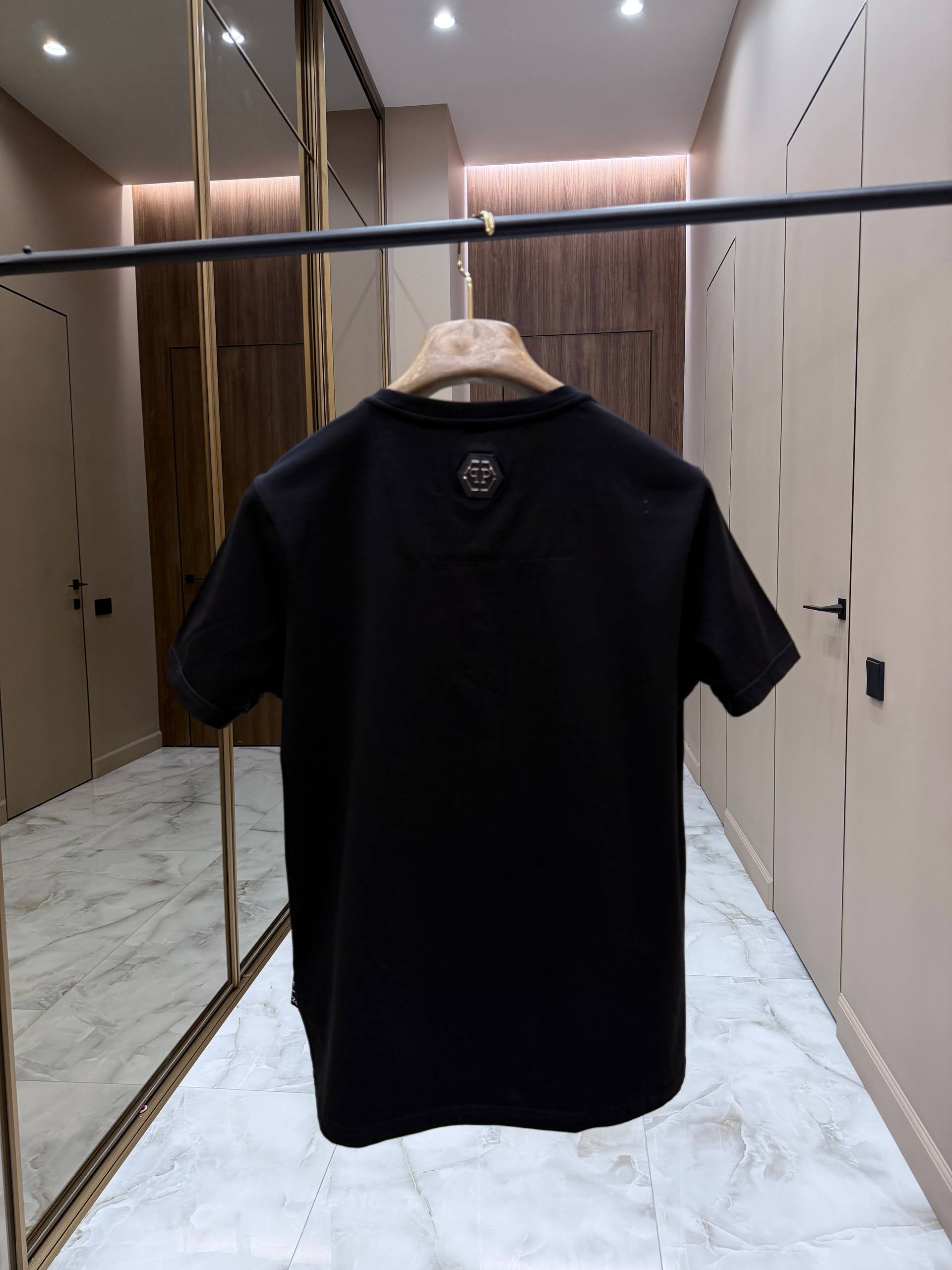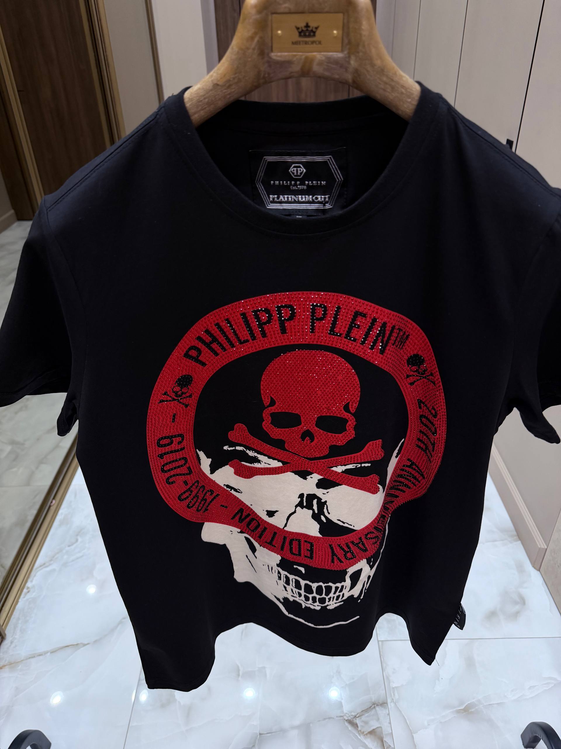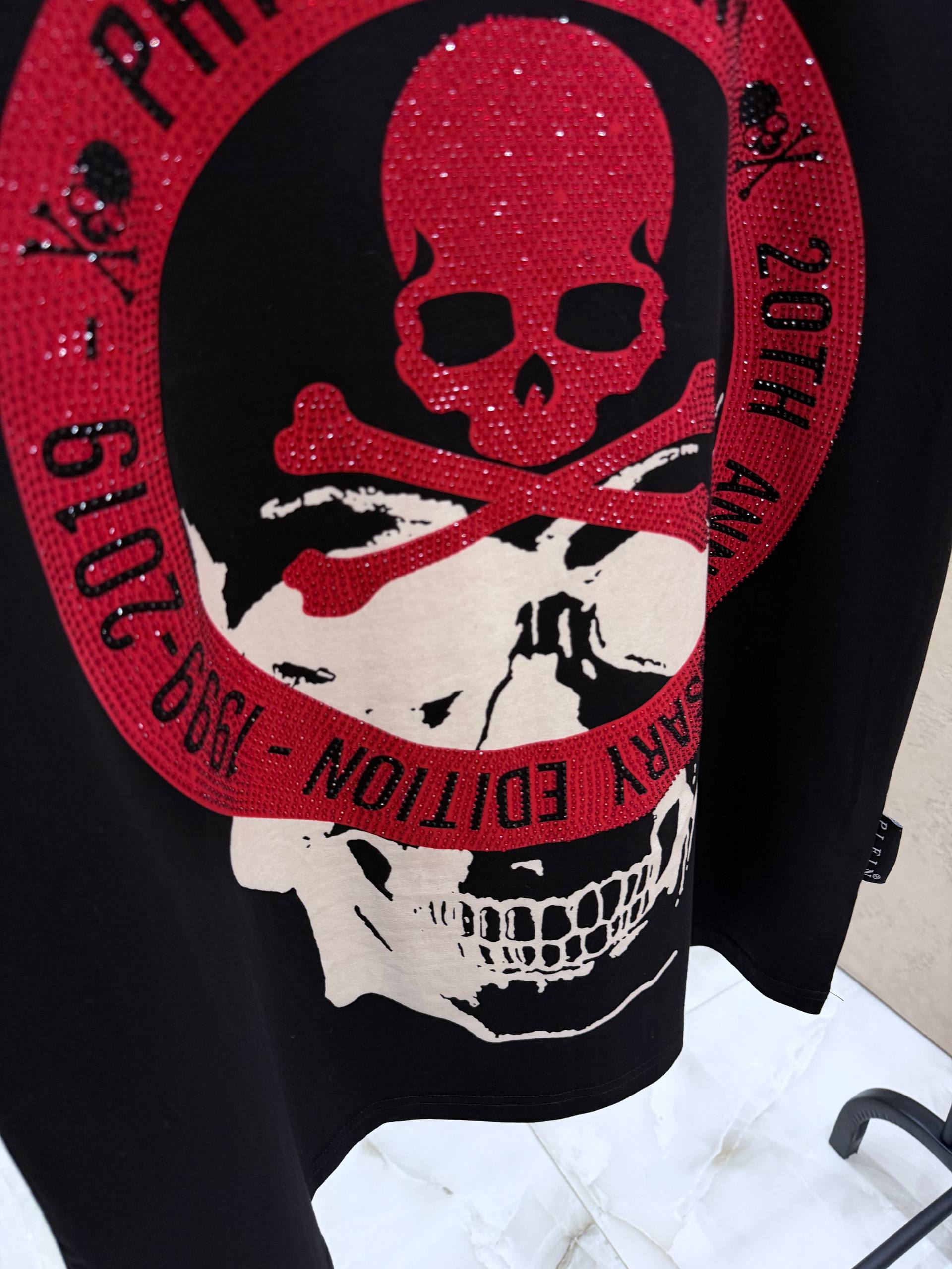 Стильная мужская футболка PHILIPP PLEIN — минималистичный по крою базовый силуэт в сочетании с эффектным фирменным декором. Модель выполнена в классическом чёрном цвете с круглым вырезом и короткими рукавами. На передней части — крупный монохромный принт в виде черепа, поверх которого размещена яркая красная круглая эмблема с надписью PHILIPP PLEIN™ и юбилейной информацией. Эмблема визуально выделяется фактурной отделкой, что придаёт футболке глубину и динамику. Аккуратный прямой низ и аккуратная обработка горловины подчёркивают премиальный характер изделия.