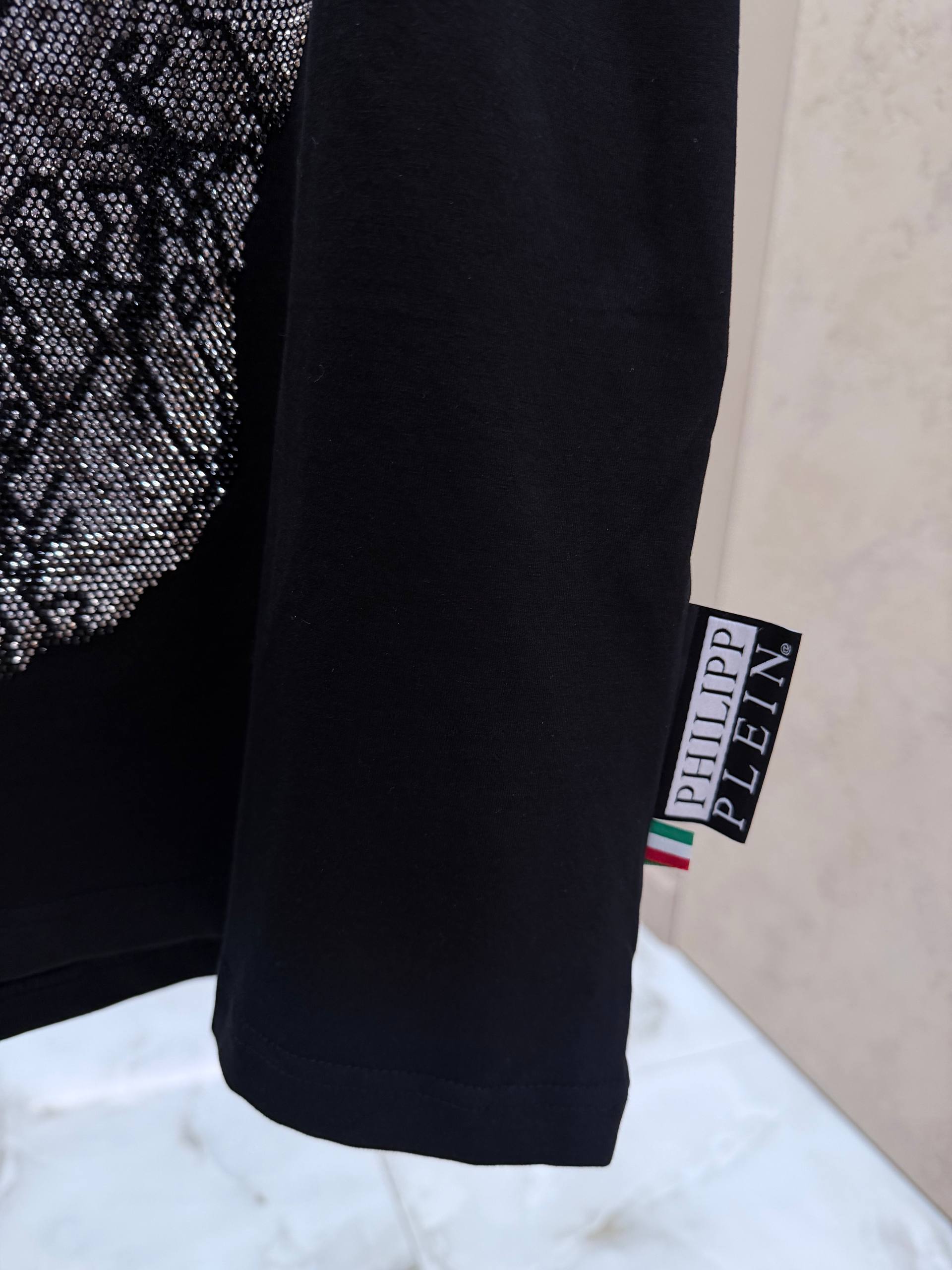 • Декор: крупный мотив черепа на передней панели, составленный из множества серебристых кристаллов/стразы, которые создают объемный мерцающий эффект; в верхней части мотива — фрагмент с фирменным шестигранным логотипом PHILIPP PLEIN.