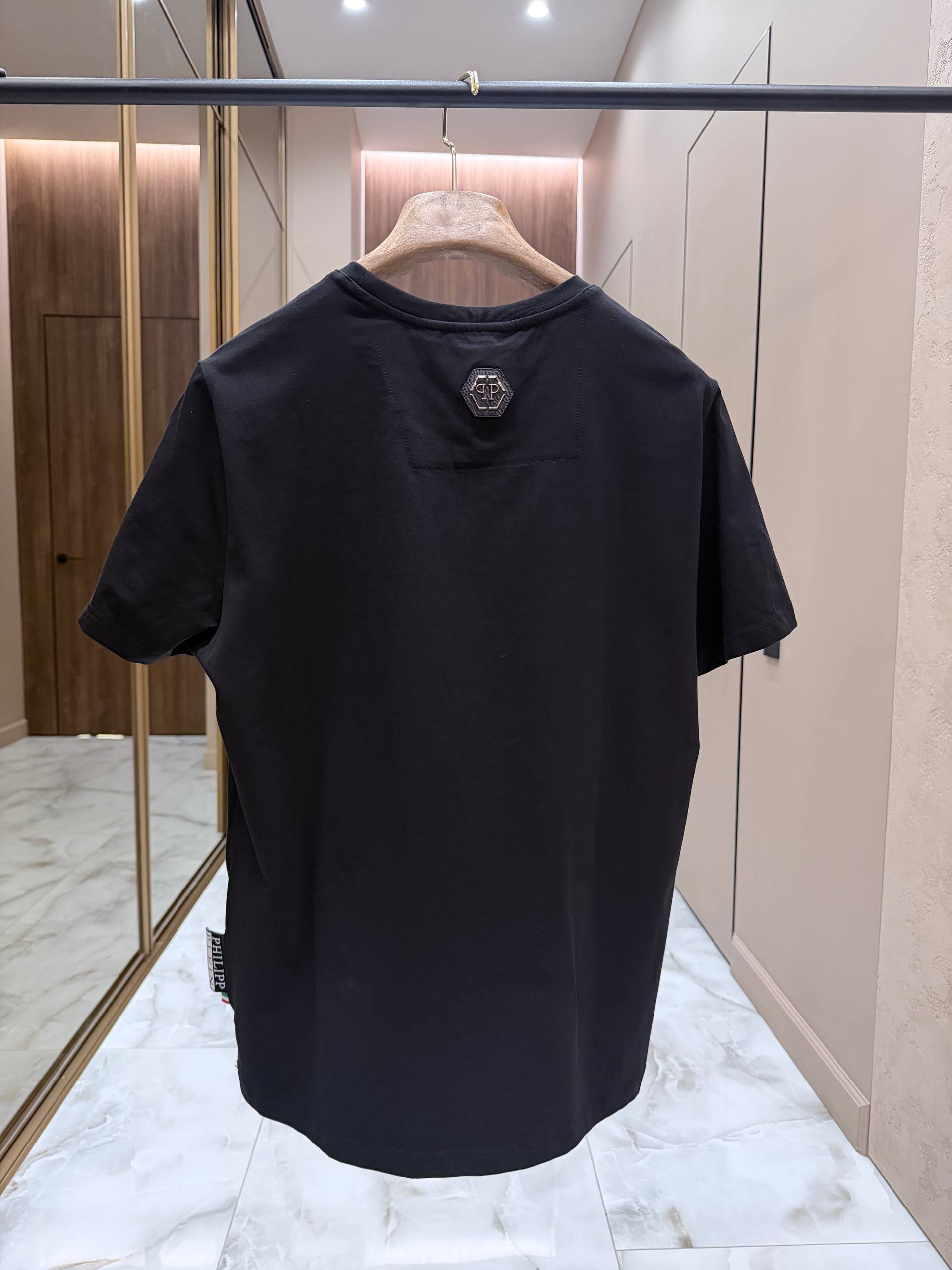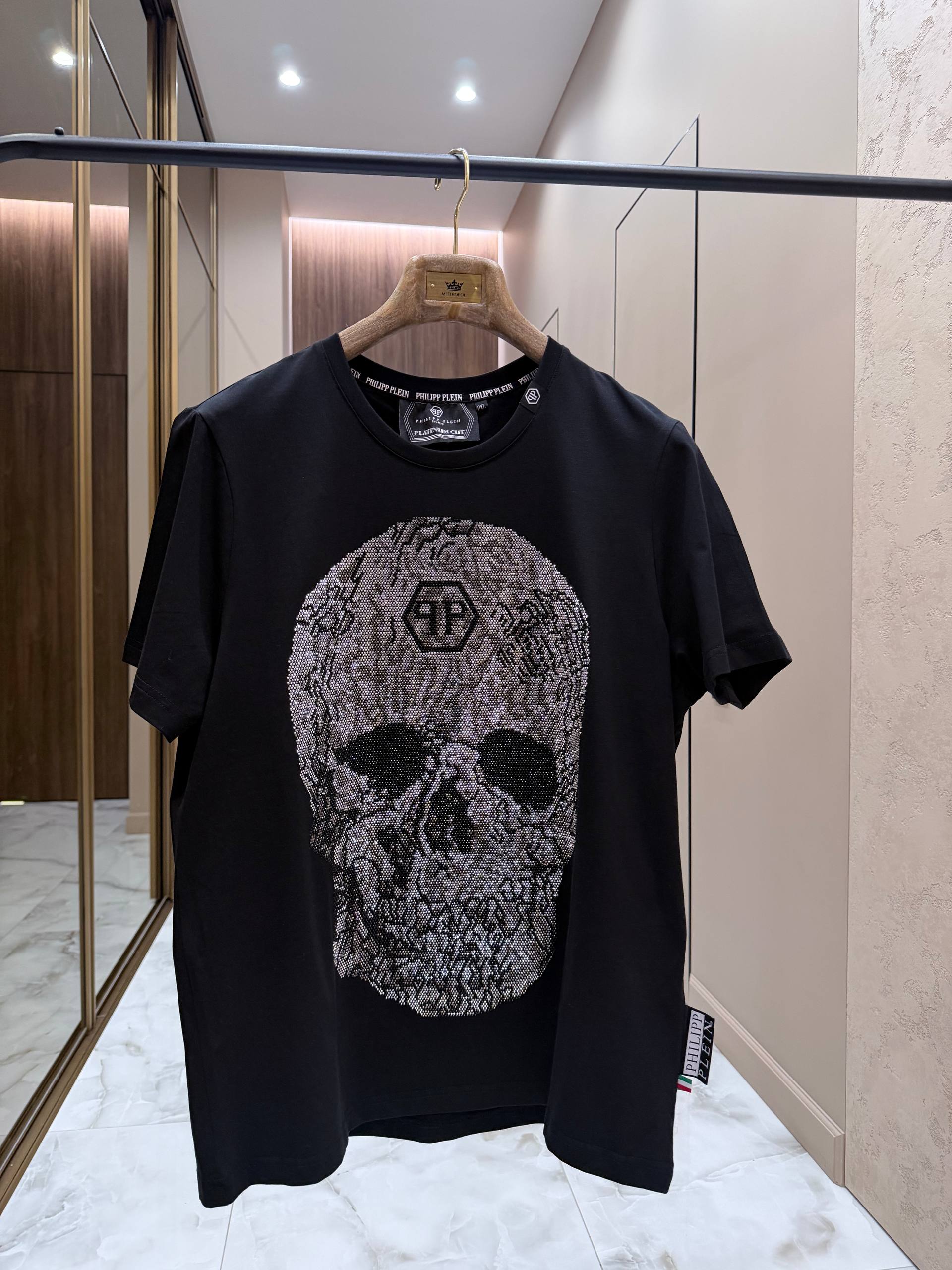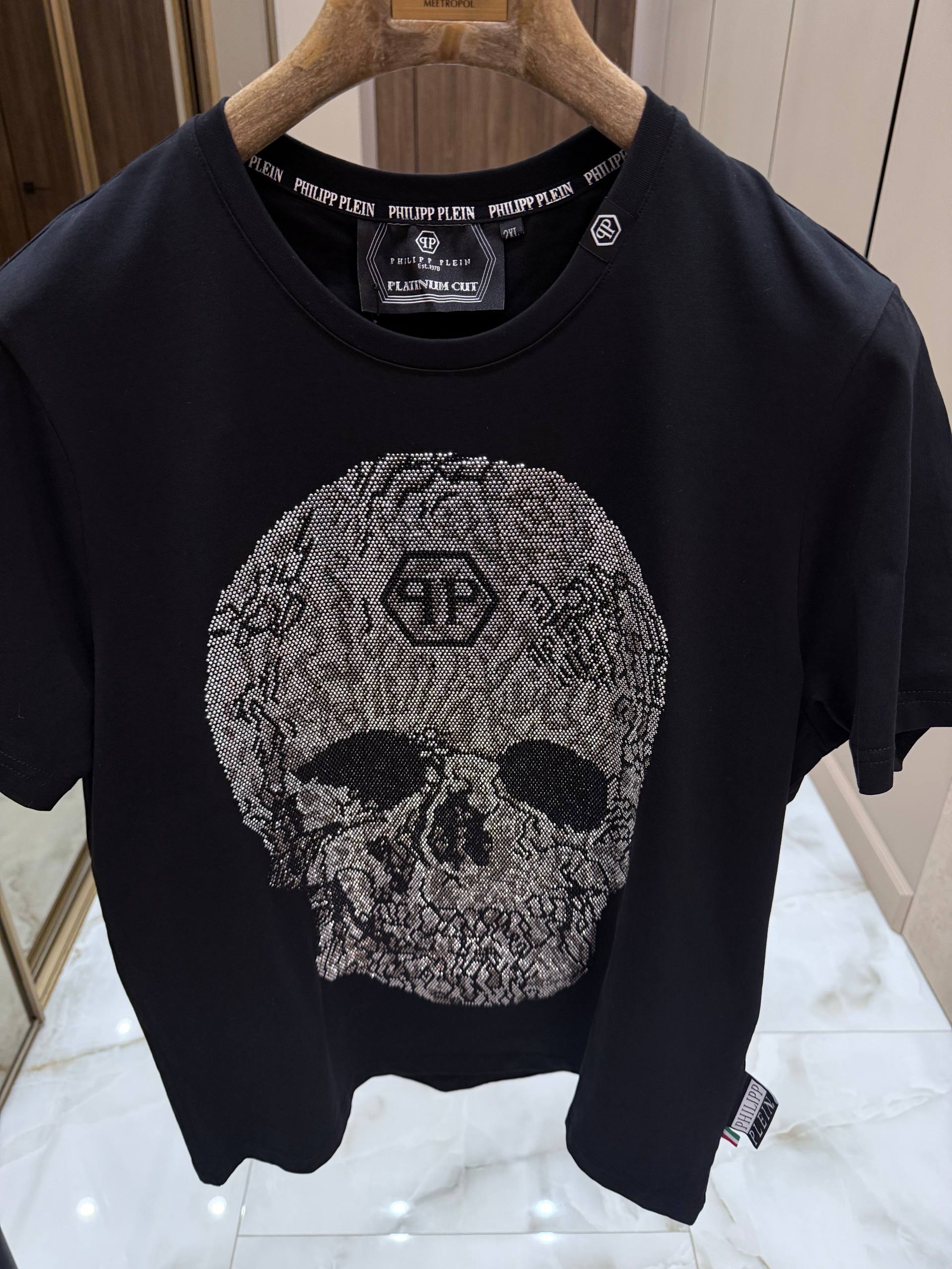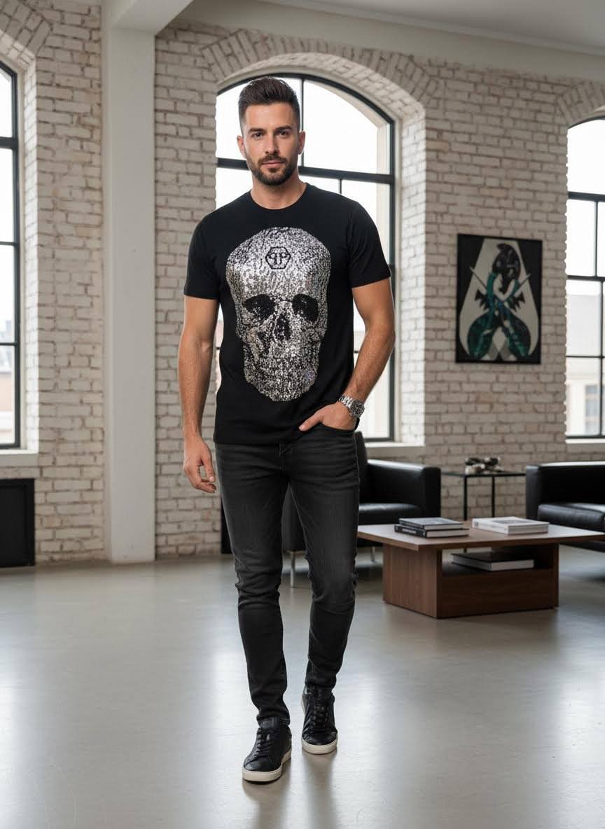 Стильная мужская футболка PHILIPP PLEIN черного цвета с выразительной фронтальной аппликацией в виде черепа, выполненной из блестящих микро-стразы/кристаллов. Минималистичный базовый силуэт в сочетании с роскошной декоративной отделкой — идеальный выбор для тех, кто ценит рокерскую эстетику и премиальный городской стиль.
