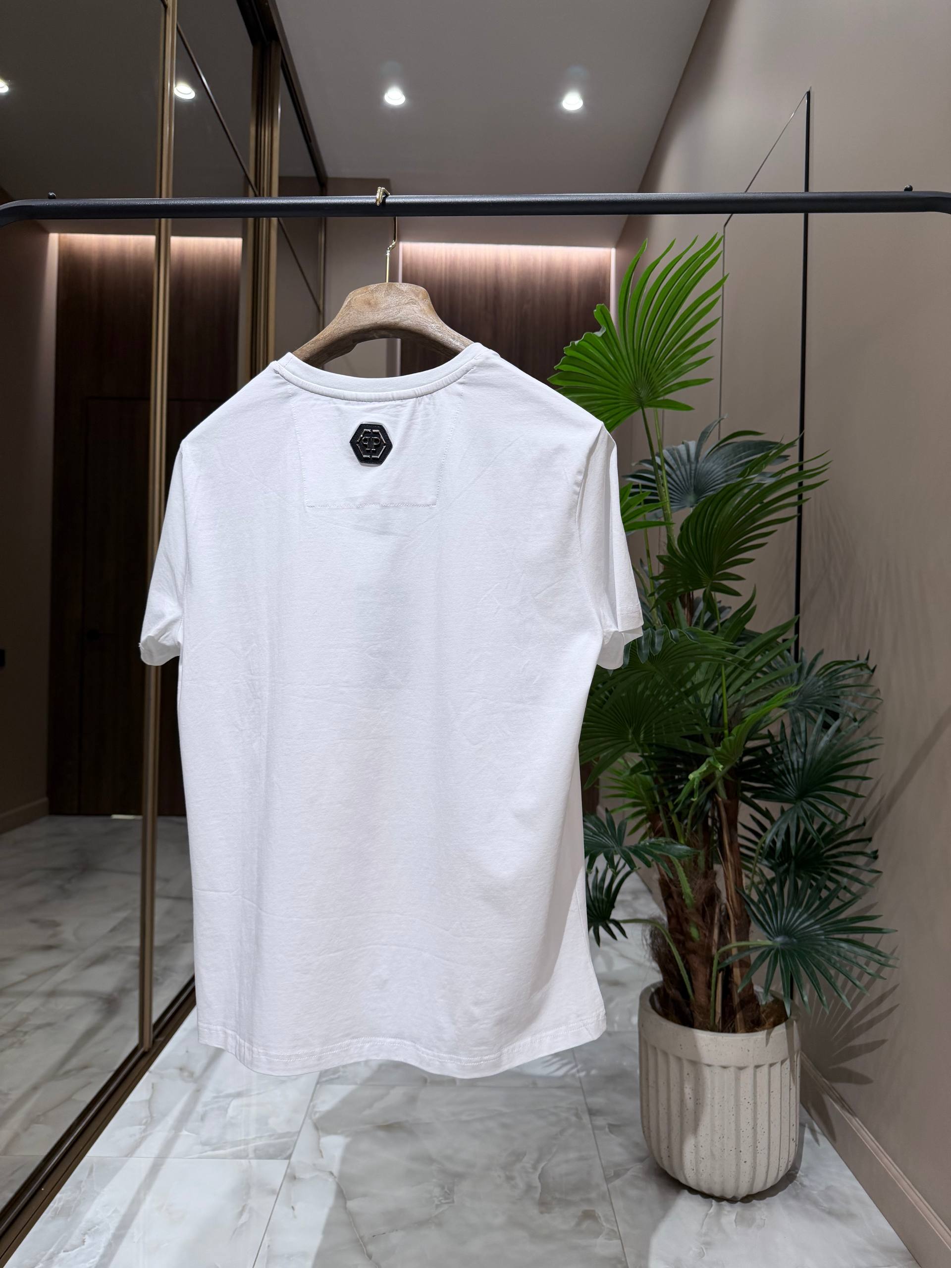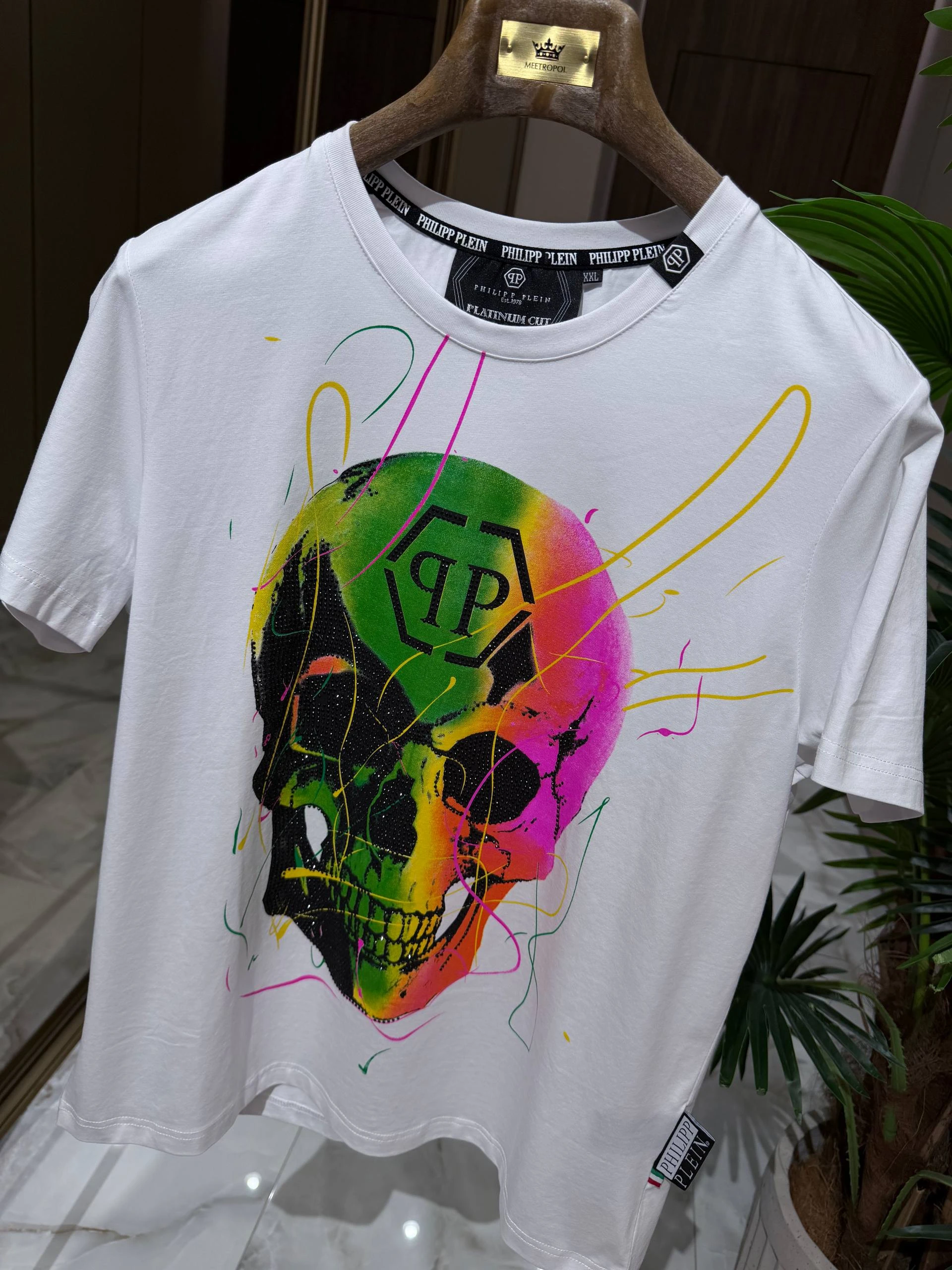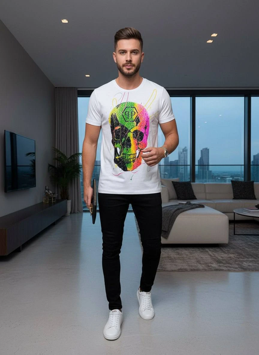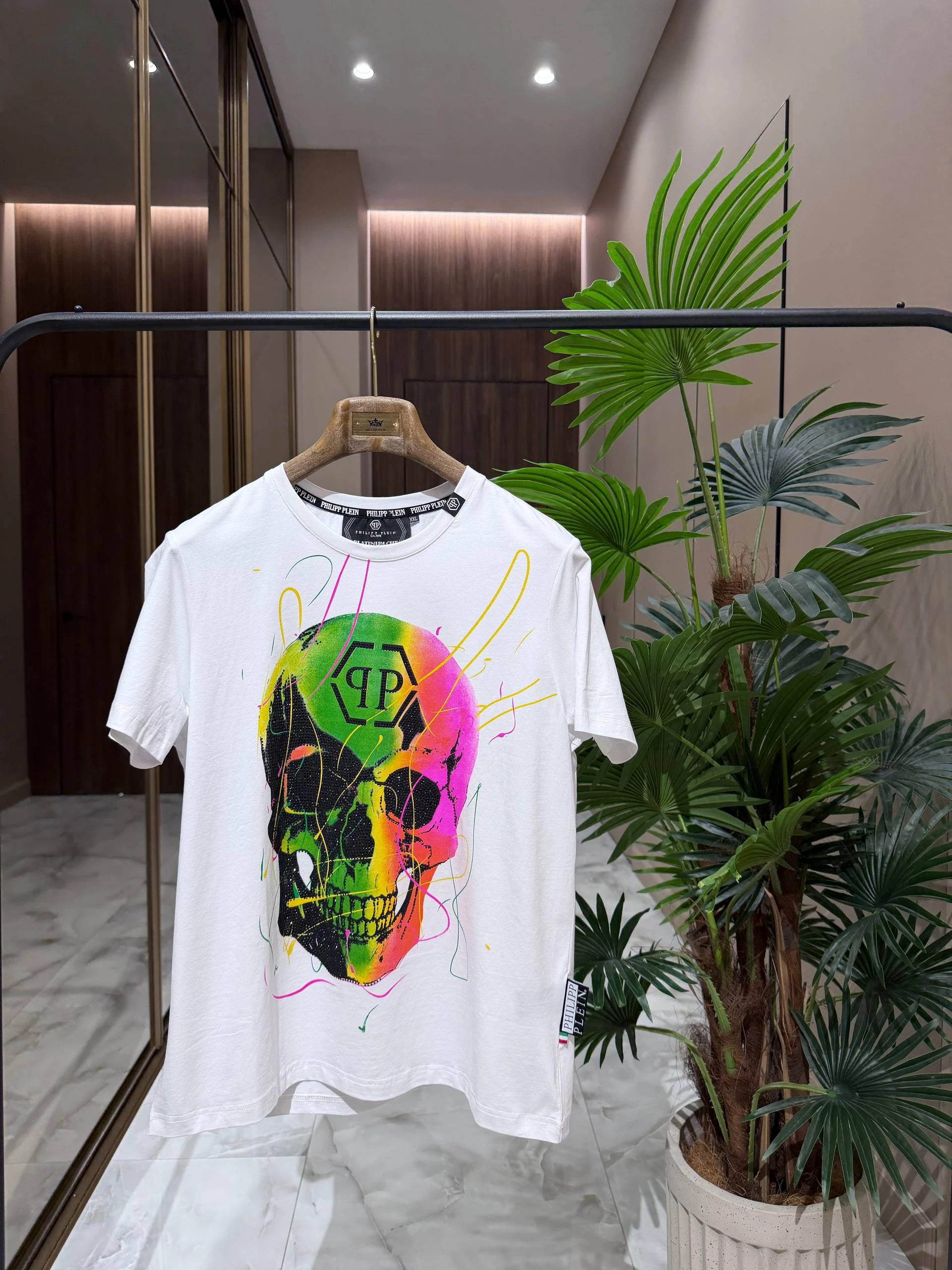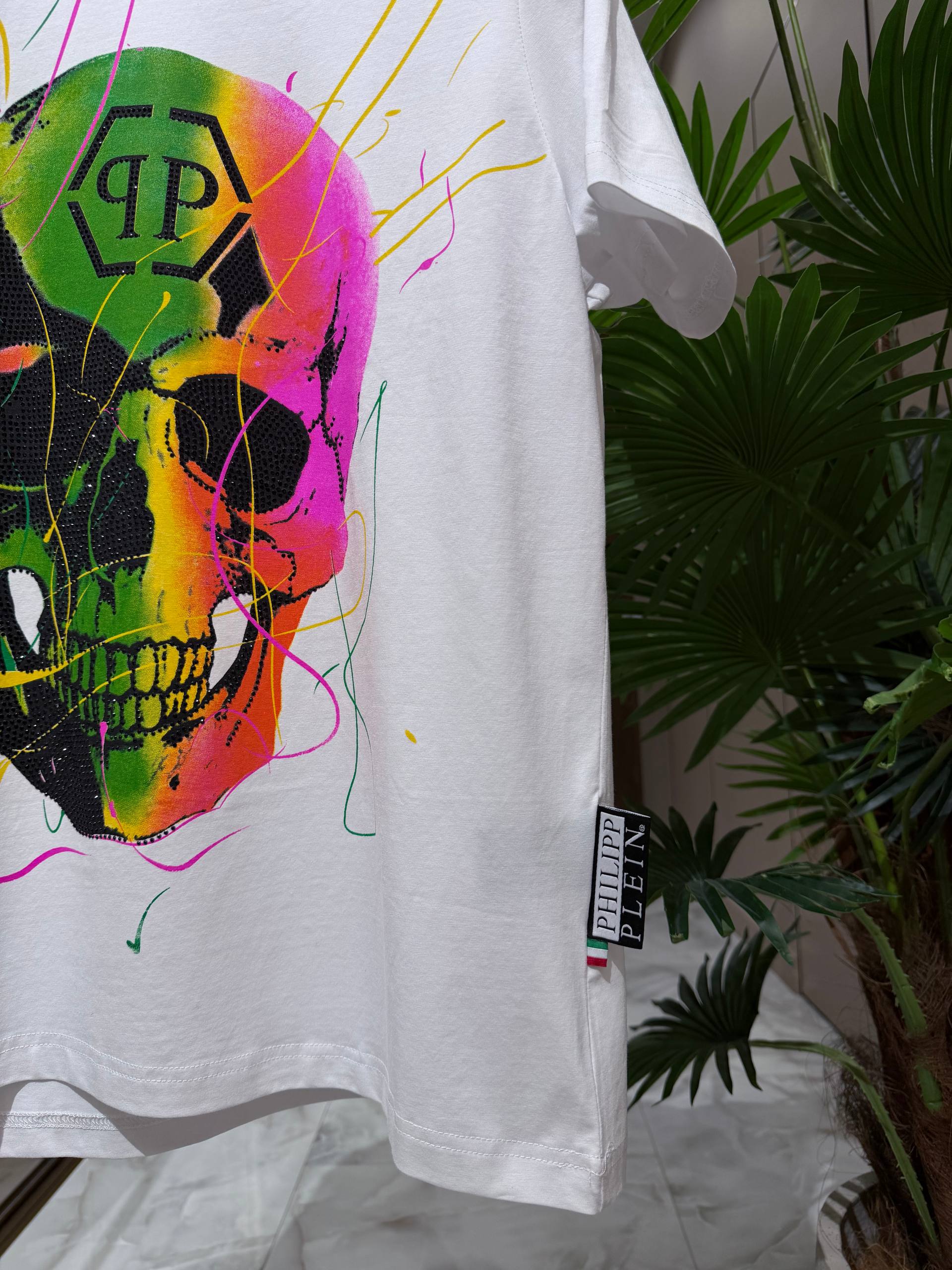 Белая футболка свободного прямого кроя с коротким рукавом и классическим круглым вырезом выполнена в минималистичном базовом стиле и дополнена крупным ярким принтом в центре. Главный декоративный элемент — стилизованный череп, выполненный в неоновой палитре: насыщенные зелёные, розовые и жёлтые акценты наложены на чёрную графику, создавая эффект спрея и динамичных мазков. На лбу черепа видна геометрическая монограмма в тон принта, а по краям рисунка — тонкие линии и брызги краски, подчёркивающие современный граффити-стиль.
