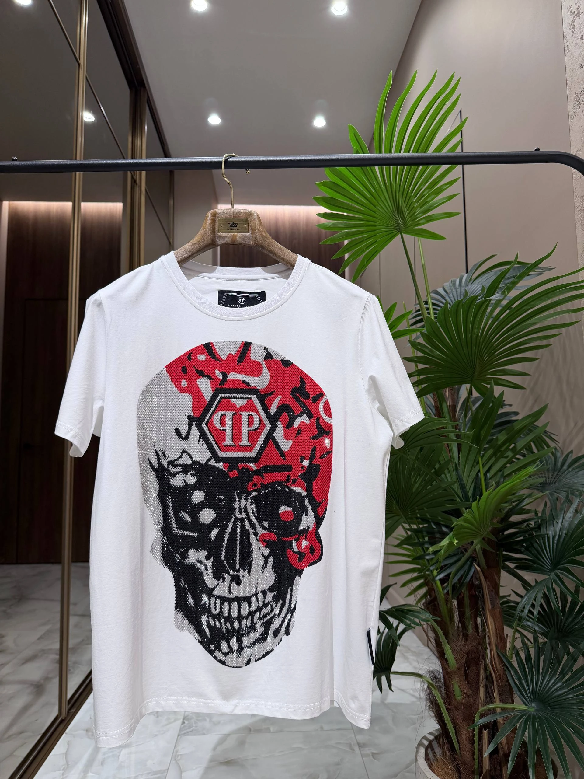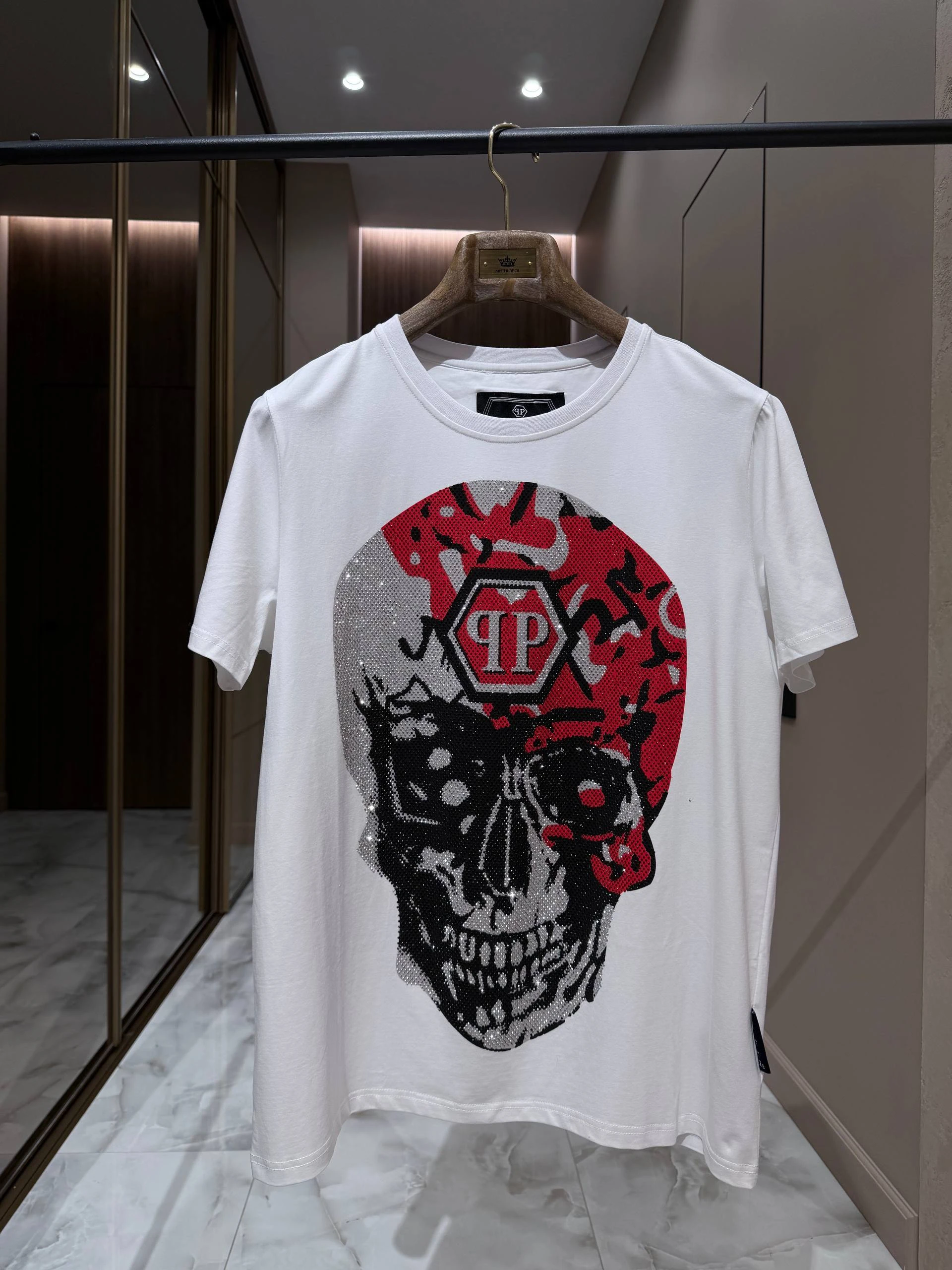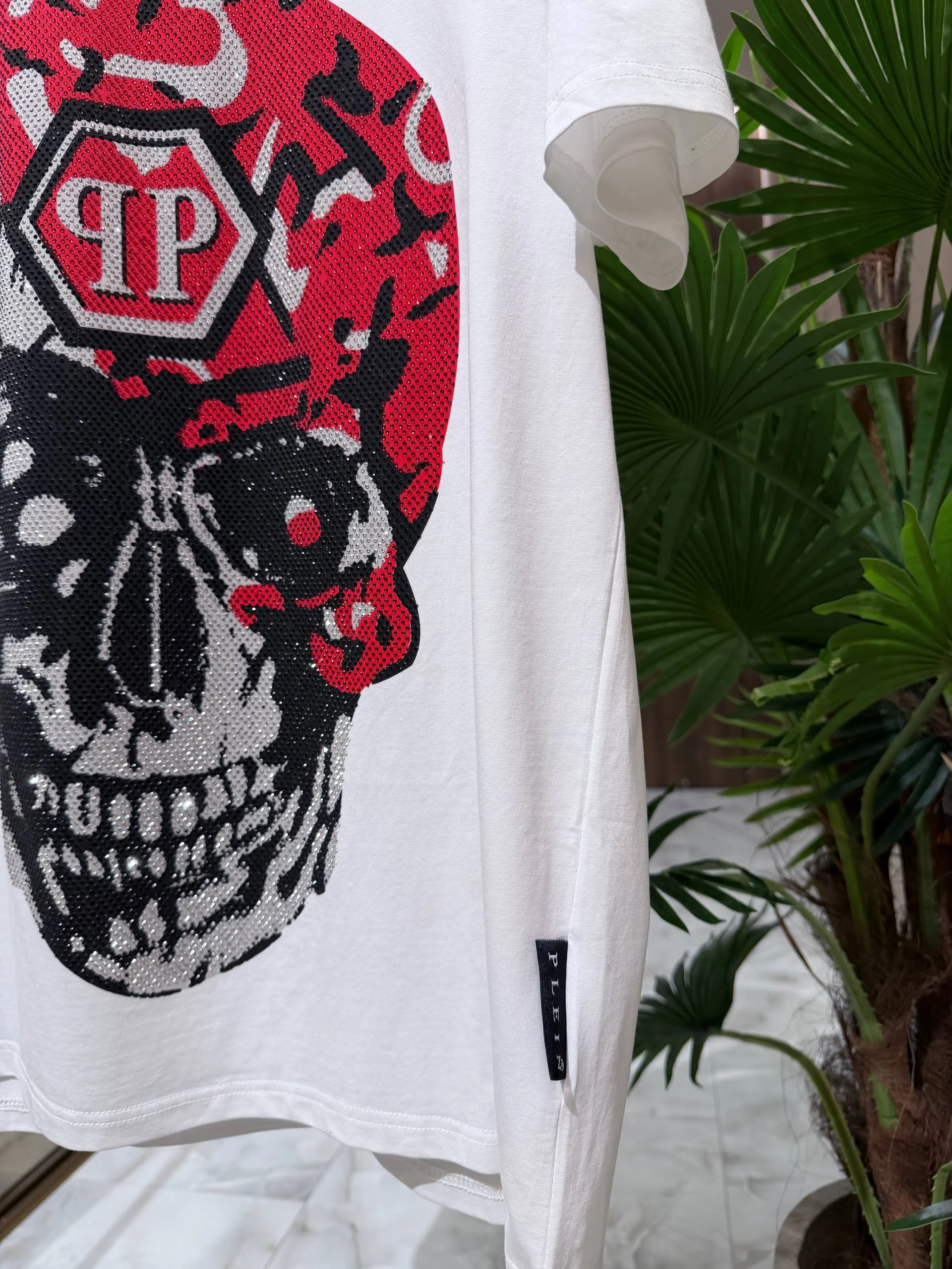 Белая хлопковая футболка с классическим круглым вырезом и короткими рукавами. Центральный акцент — крупный графический принт в виде черепа с красно‑чёрным камуфляжным мотивом и фирменной шестиугольной эмблемой PP. Детали декорированы сверкающими стразами, которые добавляют изделию люксового характера.