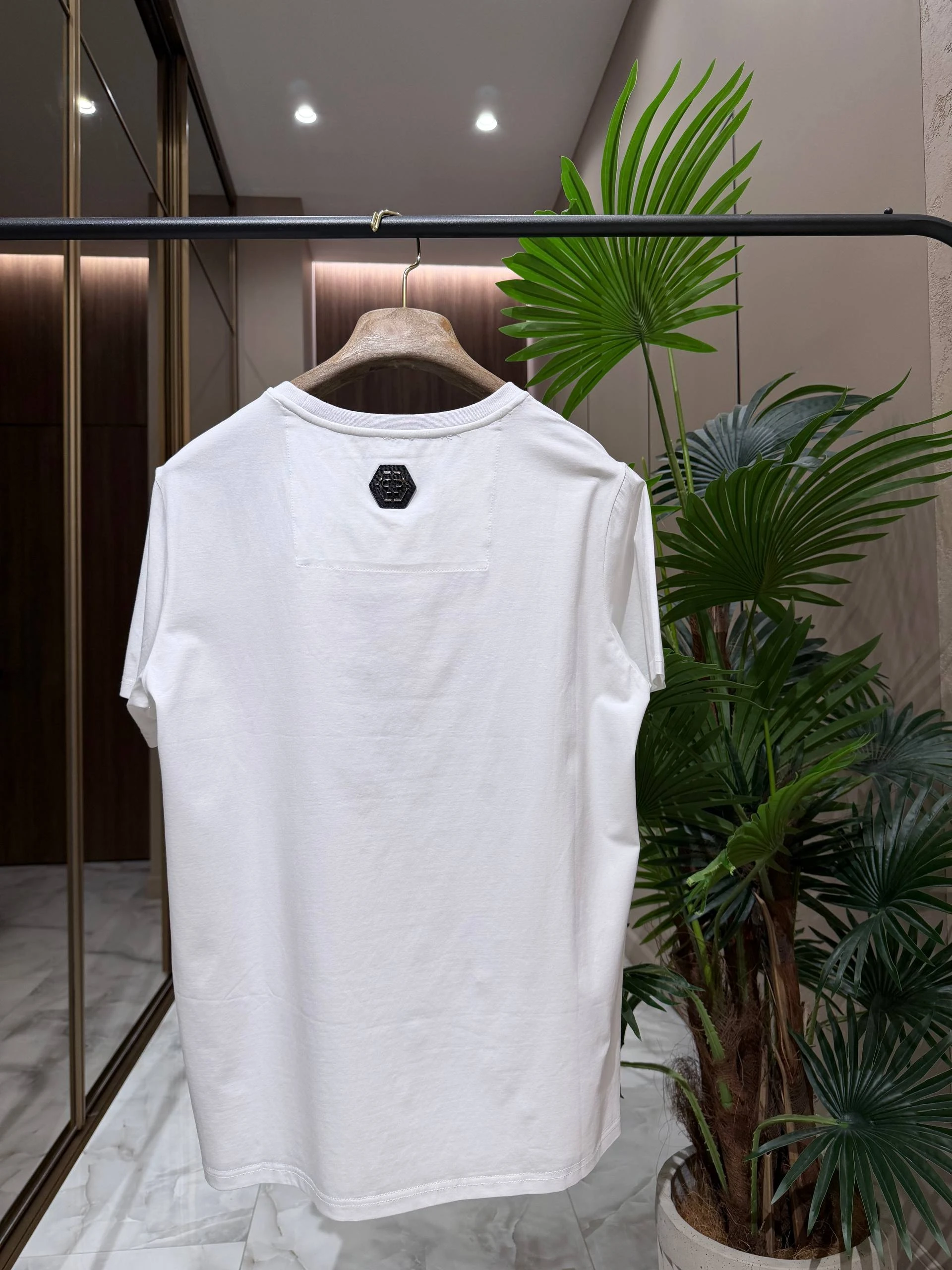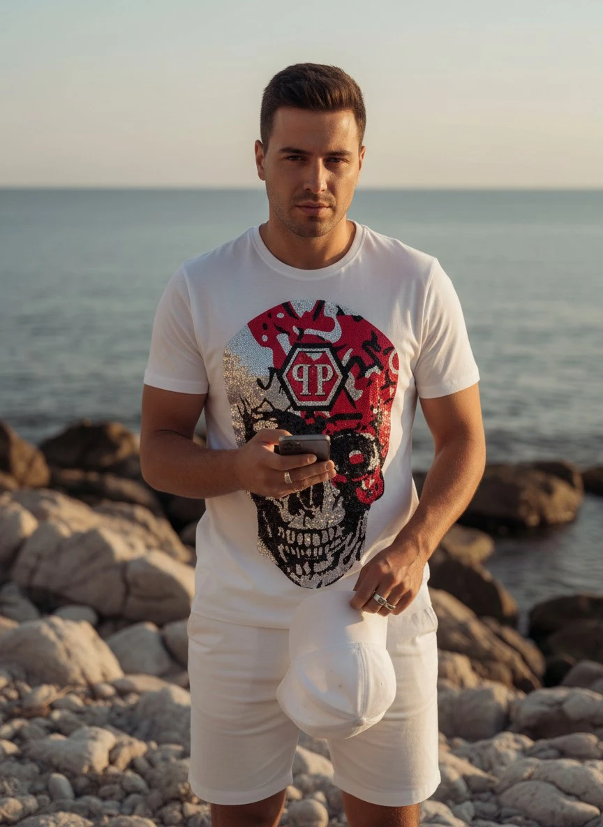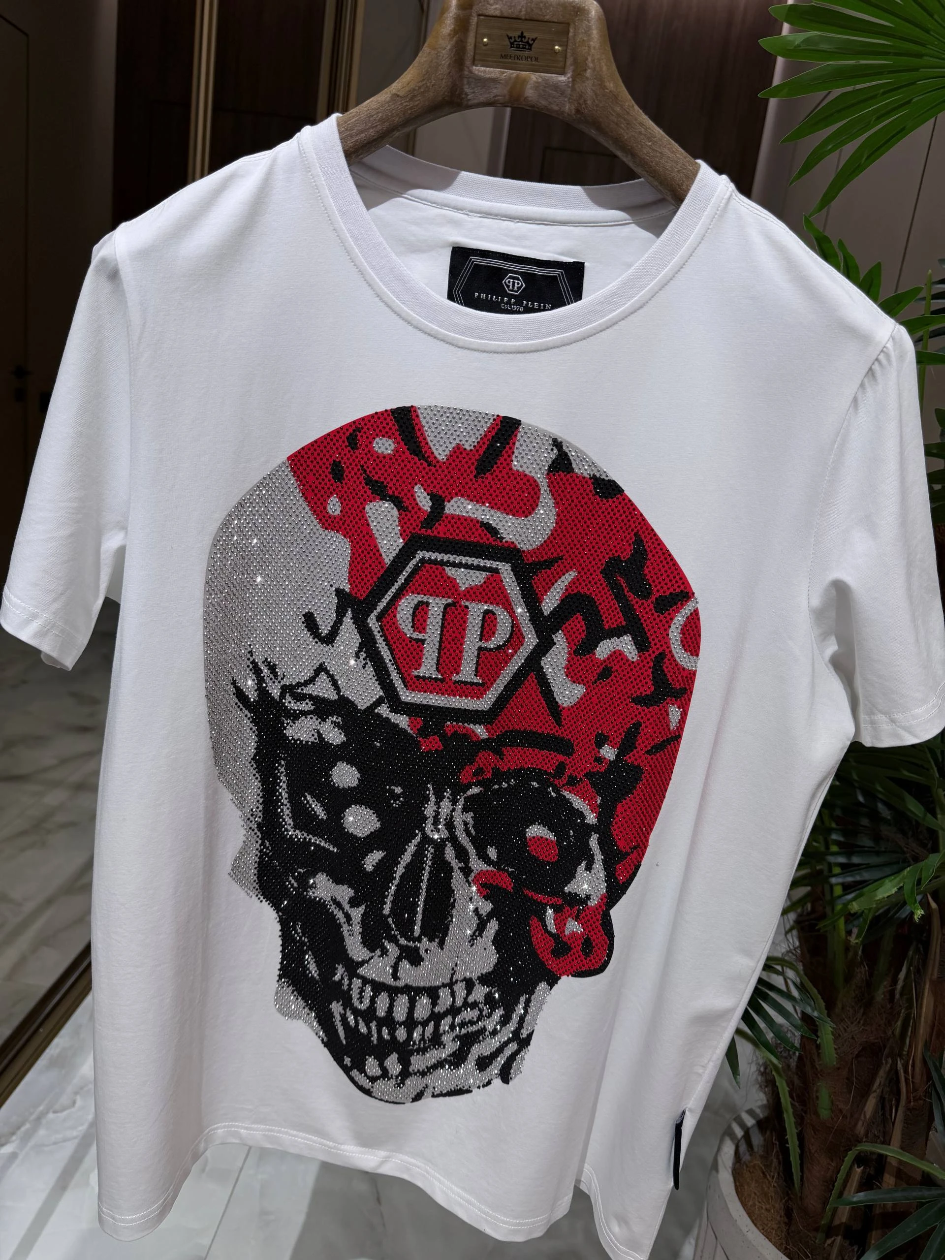 Белая хлопковая футболка с классическим круглым вырезом и короткими рукавами. Центральный акцент — крупный графический принт в виде черепа с красно‑чёрным камуфляжным мотивом и фирменной шестиугольной эмблемой PP. Детали декорированы сверкающими стразами, которые добавляют изделию люксового характера.