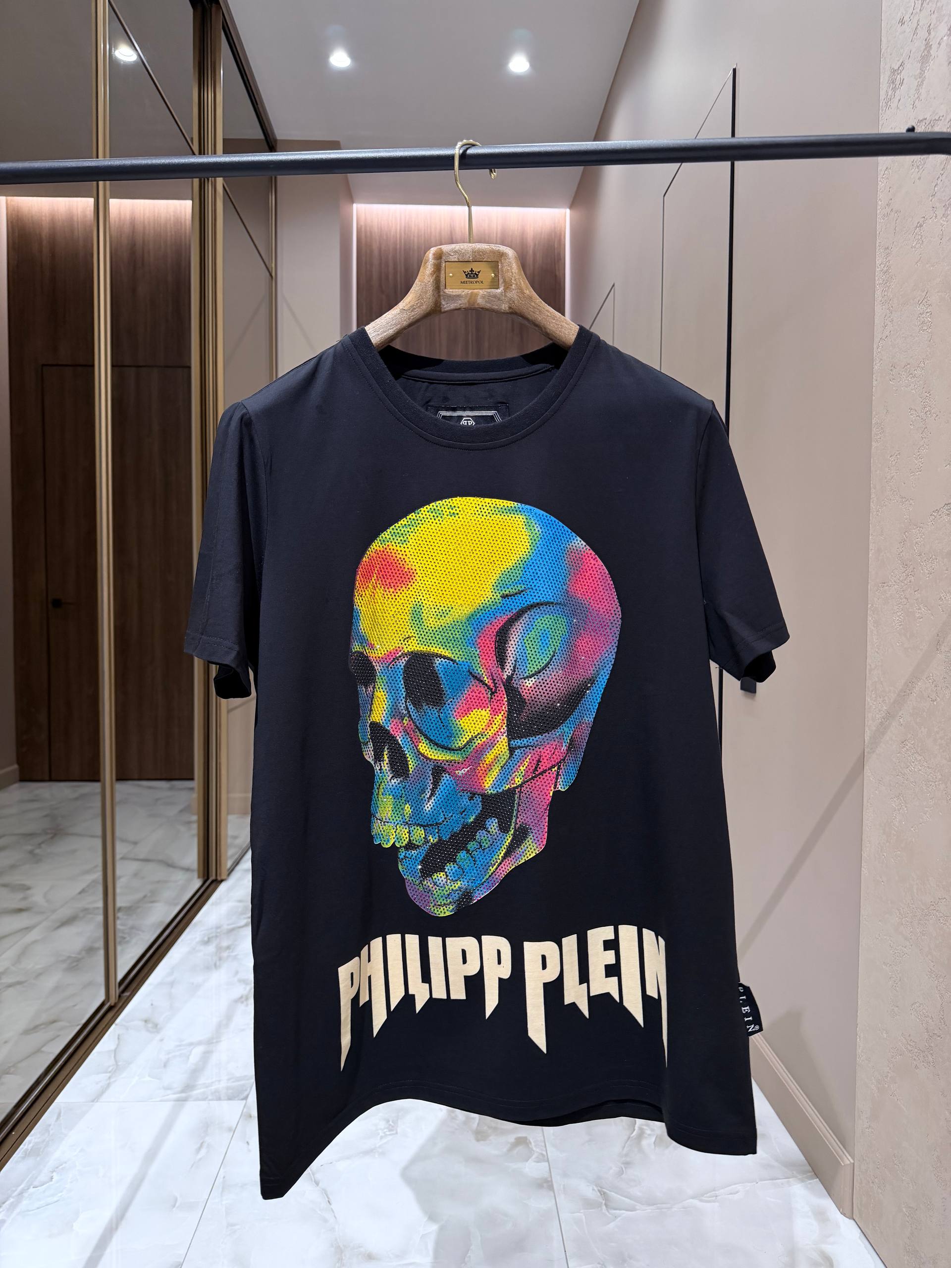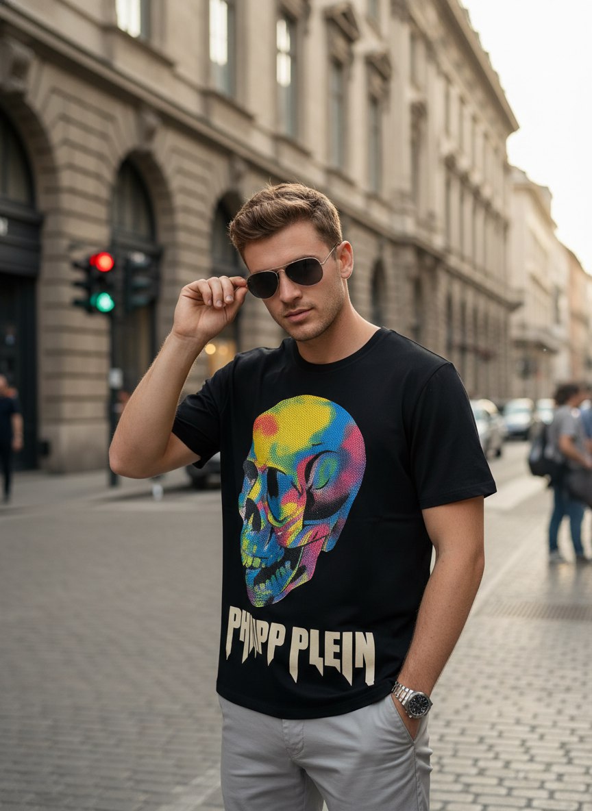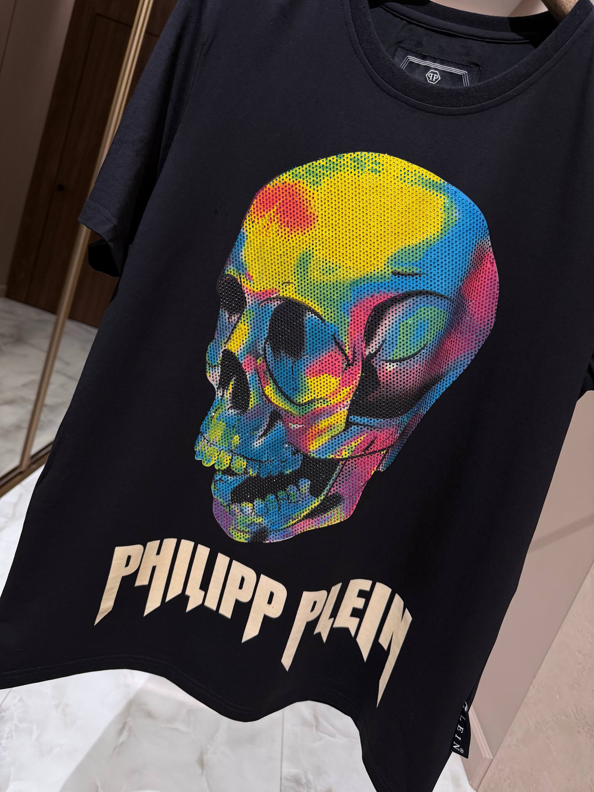 • Дизайн: однотонная черная база подчеркнута большим центральным графическим принтом — стилизованный череп, выполненный в яркой палитре с полутоновой текстурой, придающей изображению глубину и винтажную нотку. Под принтом — массивная контрастная надпись PHILIPP PLEIN в фирменном стиле.