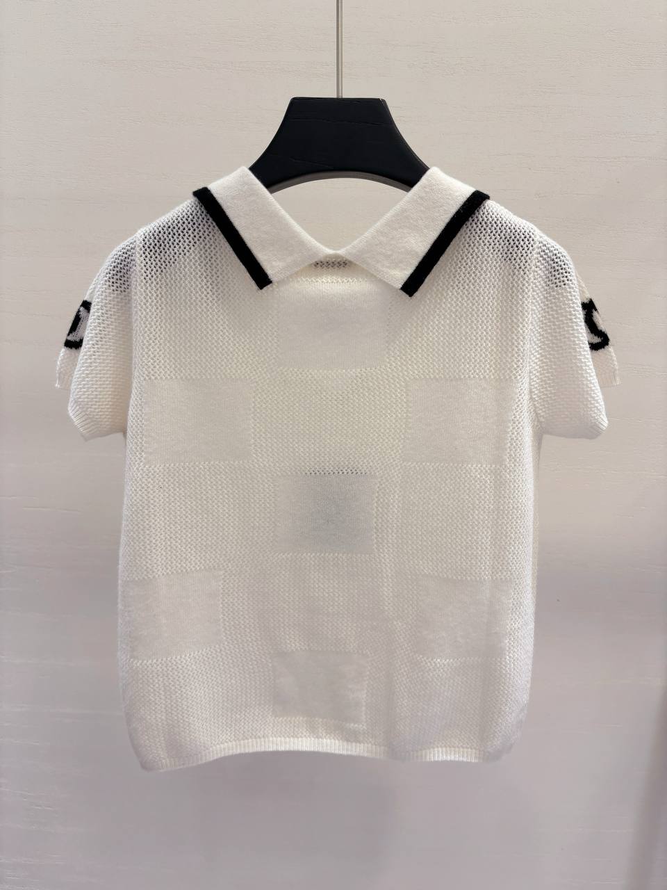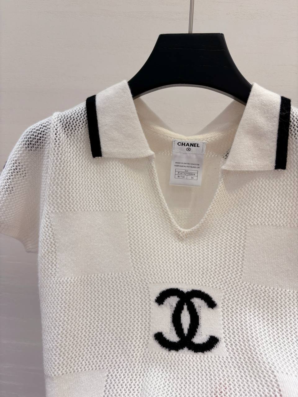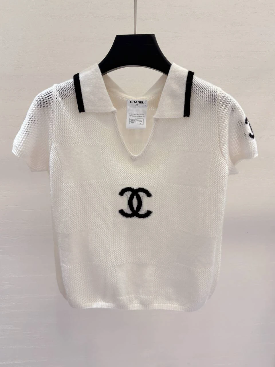 Элегантная футболка от культового бренда CHANEL – идеальный выбор для ценителей утонченного стиля и комфорта. Модель выполнена из премиального трикотажа в чисто белом цвете, что дарит образу свежесть и легкость. Футболка оформлена фактурной вязкой с мелкой сетчатой структурой, которая добавляет изящества и воздушности. Акцентом дизайна служит узнаваемая эмблема CHANEL – двойная "C" черного цвета, расположенная на груди. Воротник-рубашка, выполненный из плотного материала, украшен контрастной черной полоской, что создает стильное обрамление лицу и подчеркивает индивидуальность модели.
