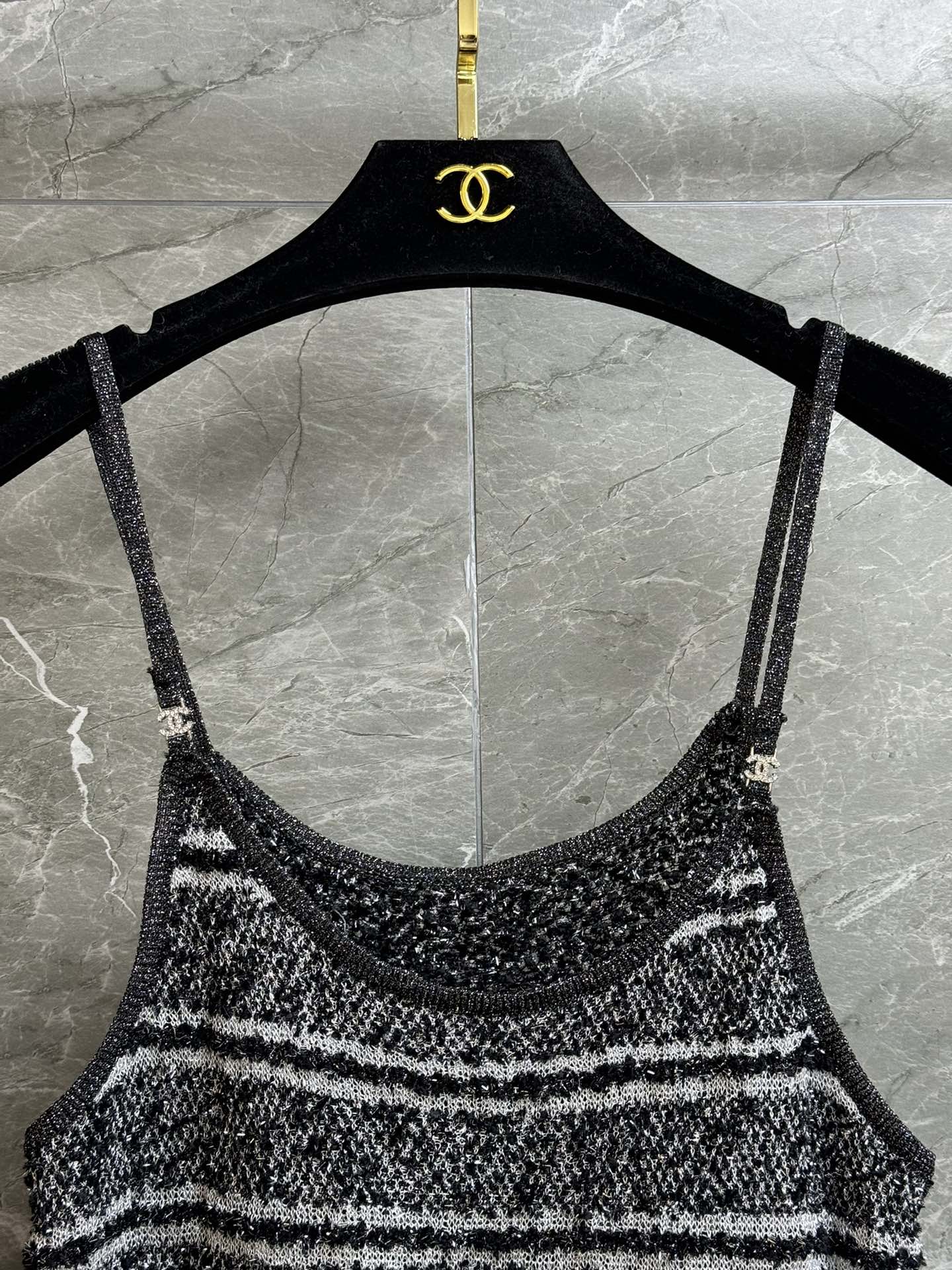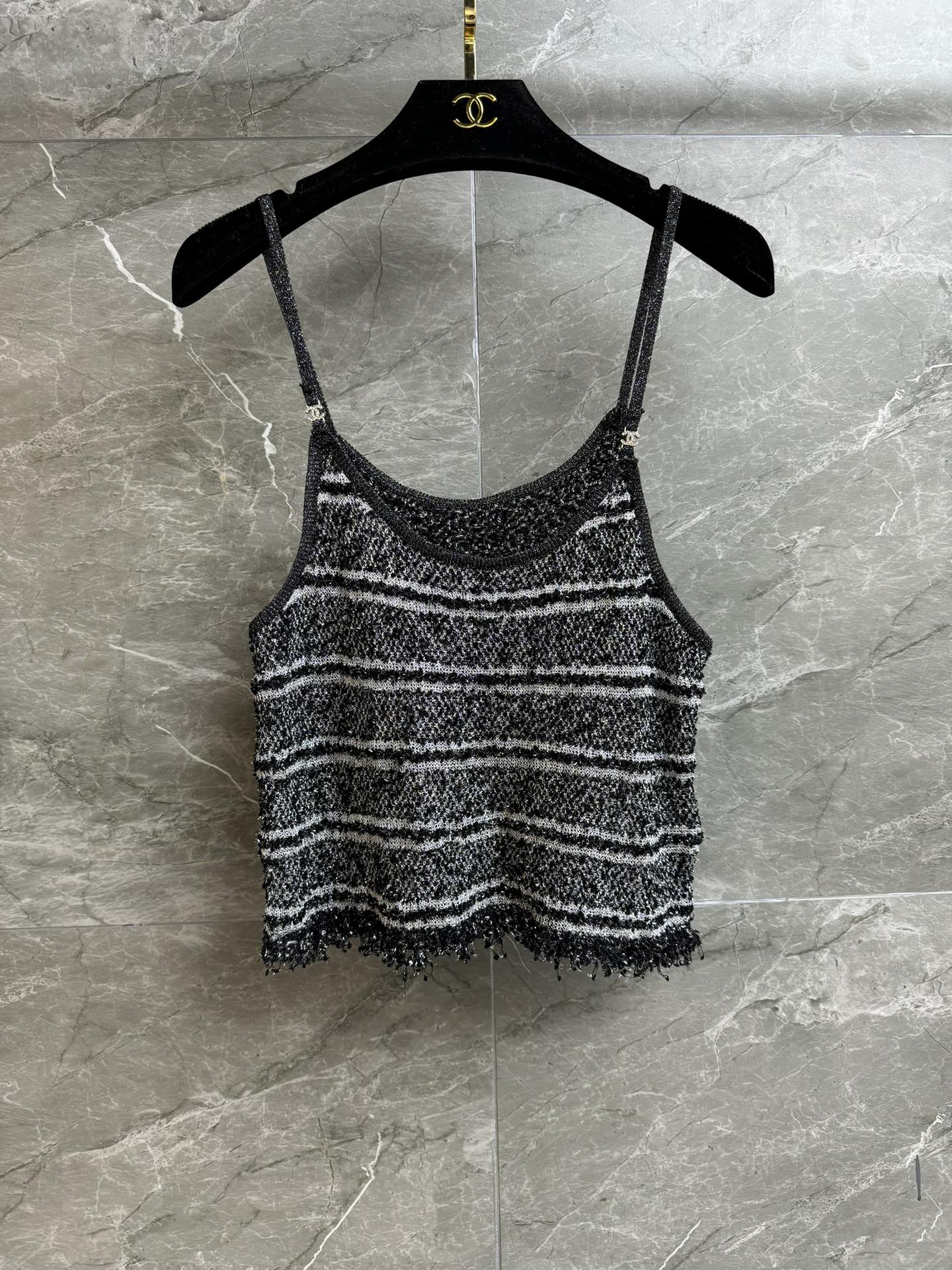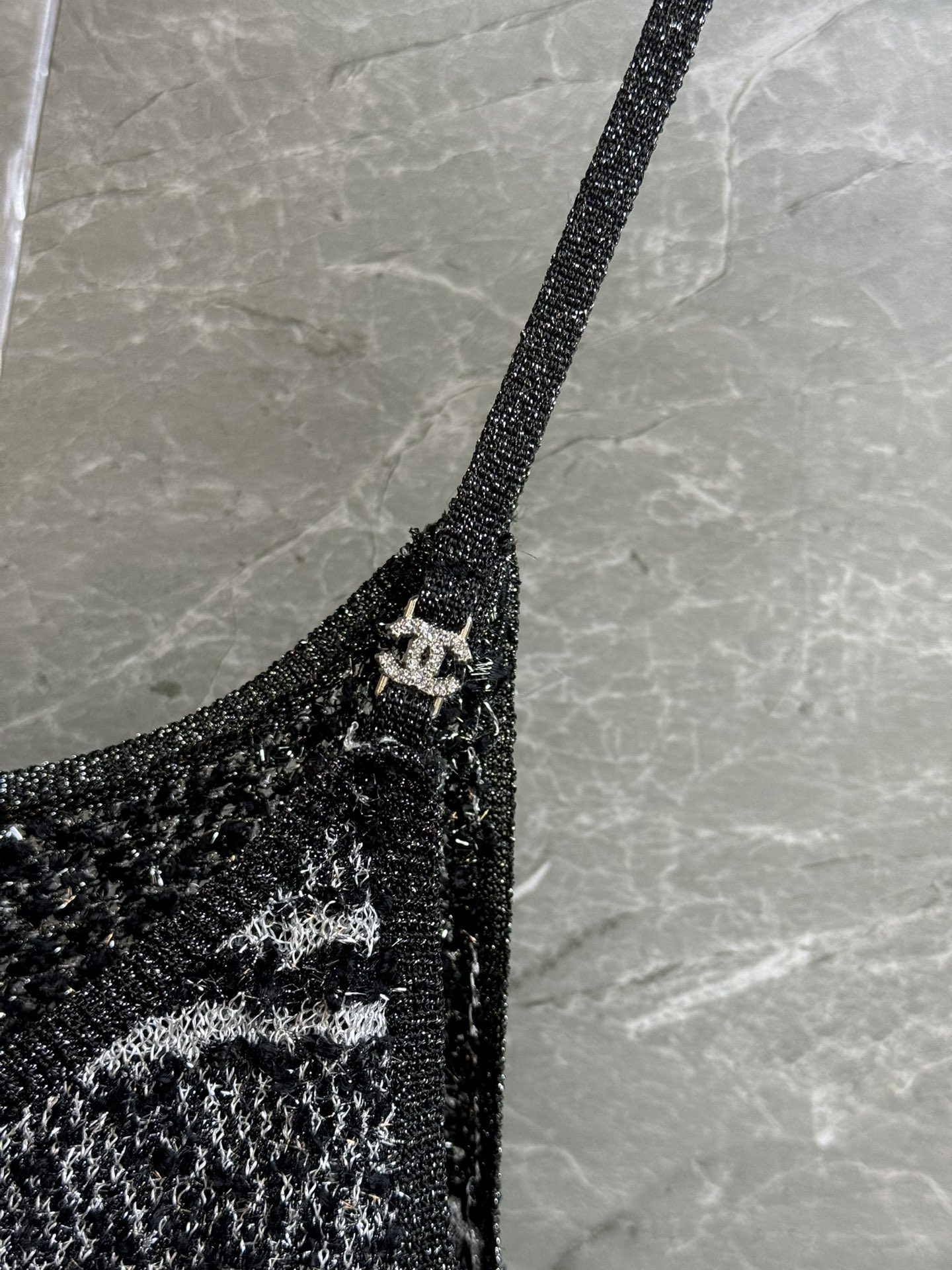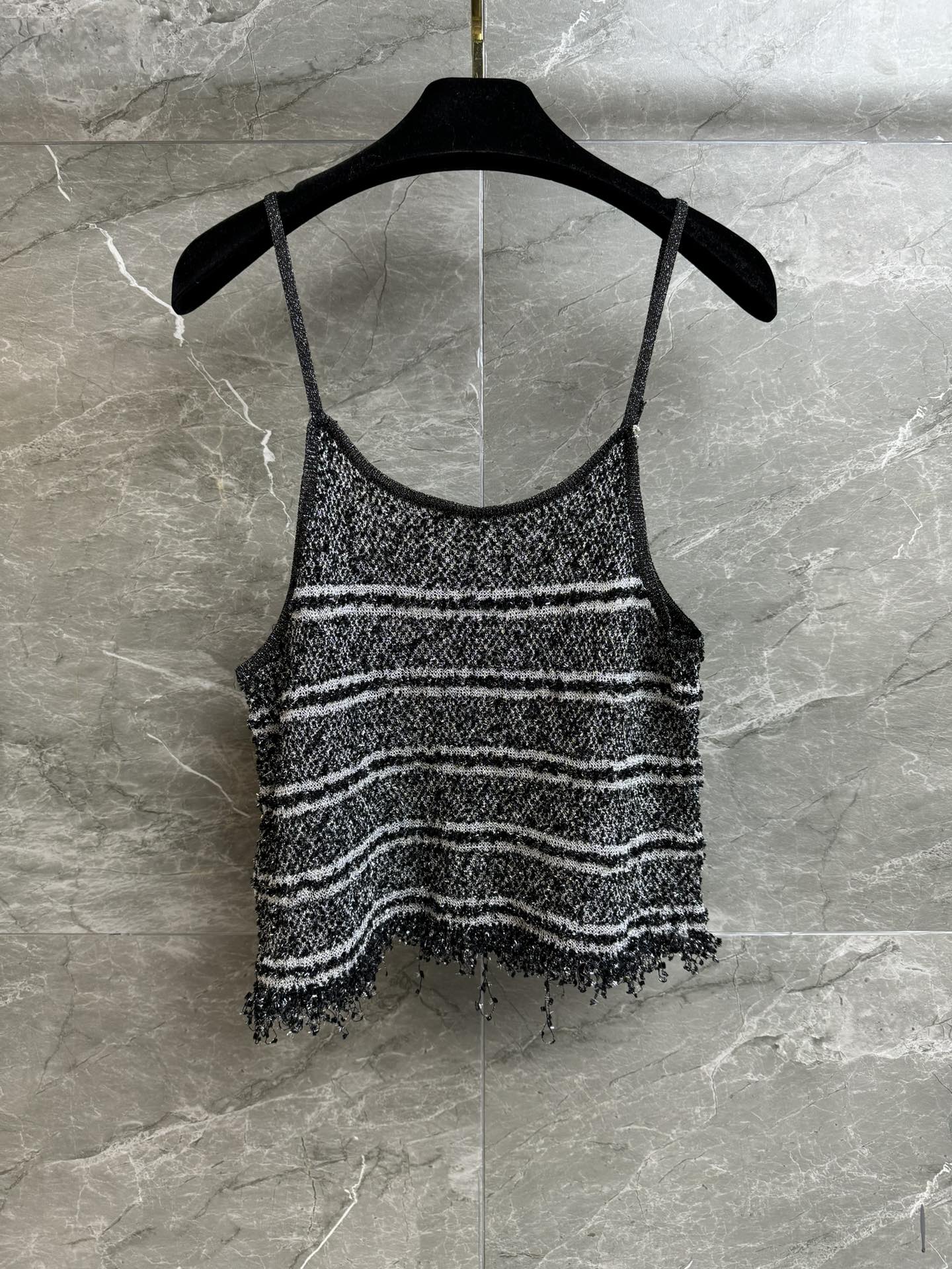 Короткий топ в текстурной твидовой вязке с тонкими бретелями и изящной бахромой из стекляруса. Элегантная монохромная палитра и аккуратный силуэт — идеальный акцент для вечернего и городского образа. Женский топ выполнен в текстурной вязке, напоминающей твид: сочетание чёрных, серых и белых нитей создаёт благородную, слегка мерцающую поверхность. Модель с тонкими регулируемыми бретелями, округлым вырезом по груди и укороченной длиной, которая подчёркивает талию. Нижний срез украшен деликатной бахромой из мелкого стекляруса и нитей — она придаёт движению лёгкость и тонкий вечерний блеск. Строгая полосатая структура рисунка придаёт топу аккуратный графичный характер, который легко сочетается с классическими жакетами и универсальными брюками или юбками.