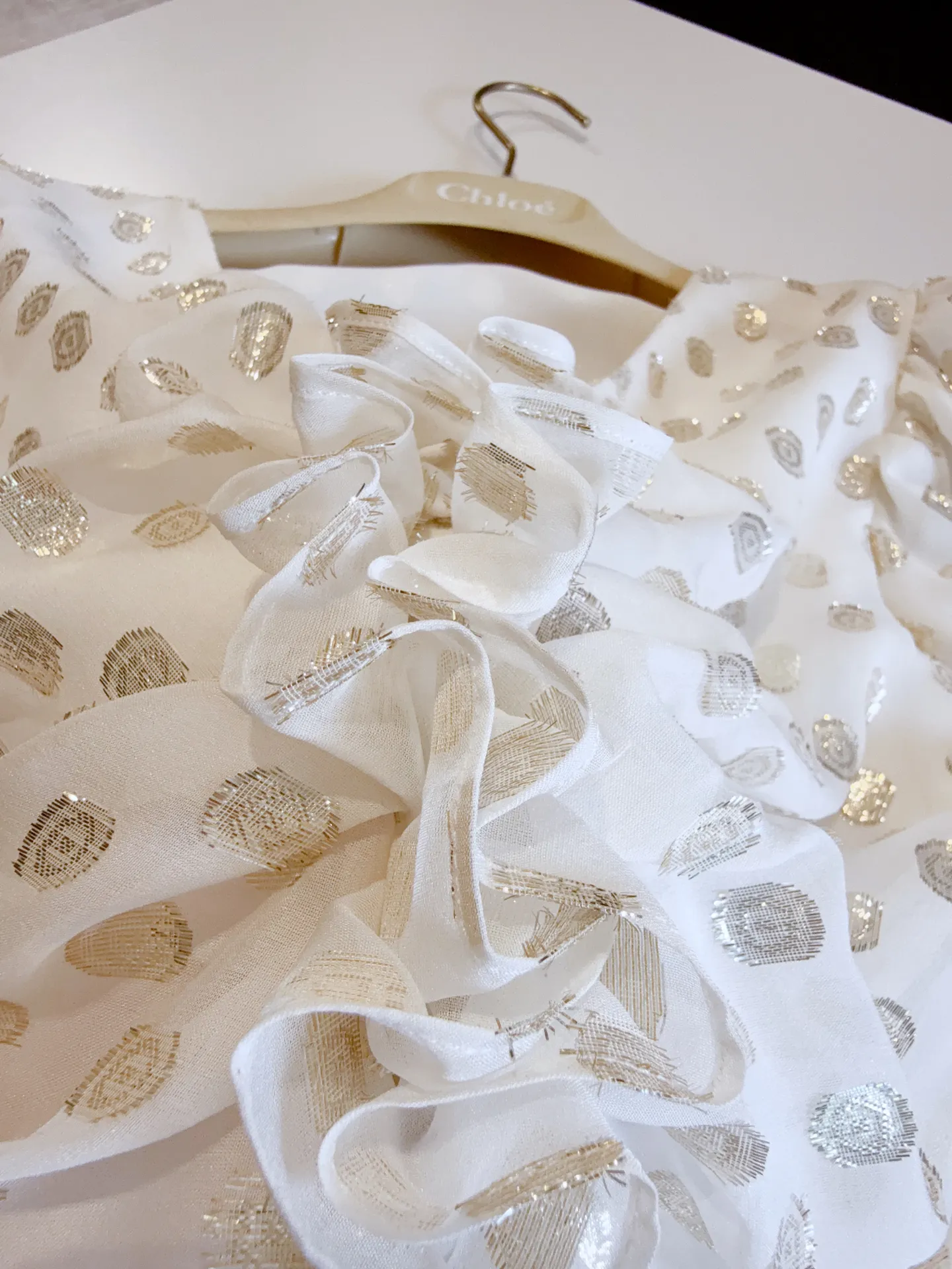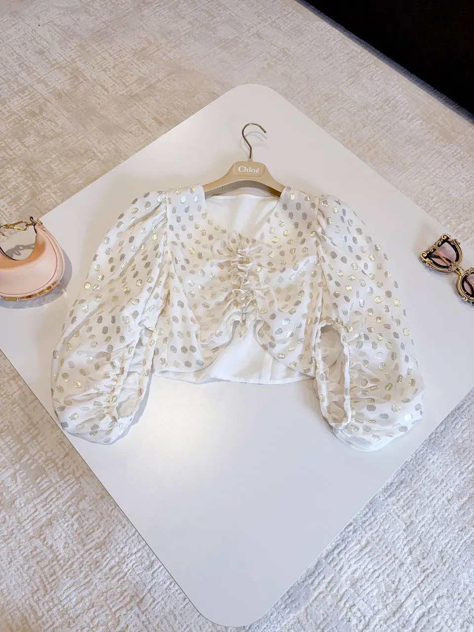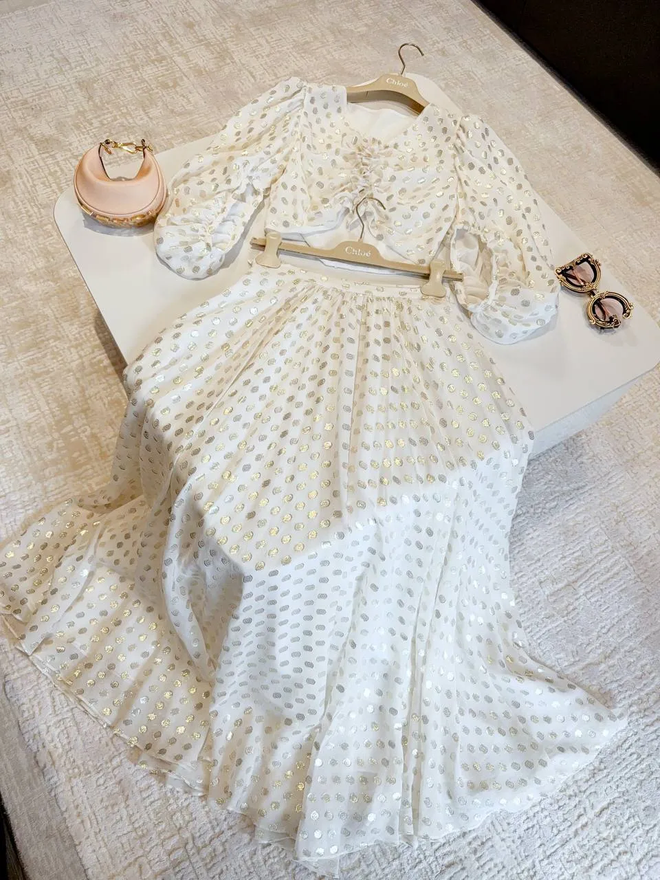 Шелковый топ цвета слоновой кости с рукавами-фонариками и металлическими горошинами, безусловно, будет выделяться в весенне-летнем сезоне. Мягкие складки и сочетание с юбкой оверсайз придают наряду легкость и изящество. Такое сочетание идеально подходит для создания стильного и нарядного образа, которое может быть уместно как на повседневных мероприятиях, так и на особых случаях.