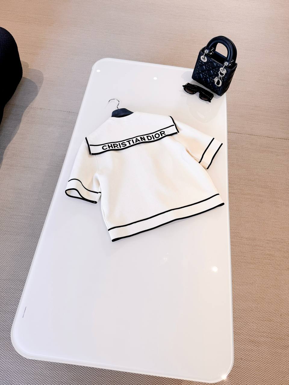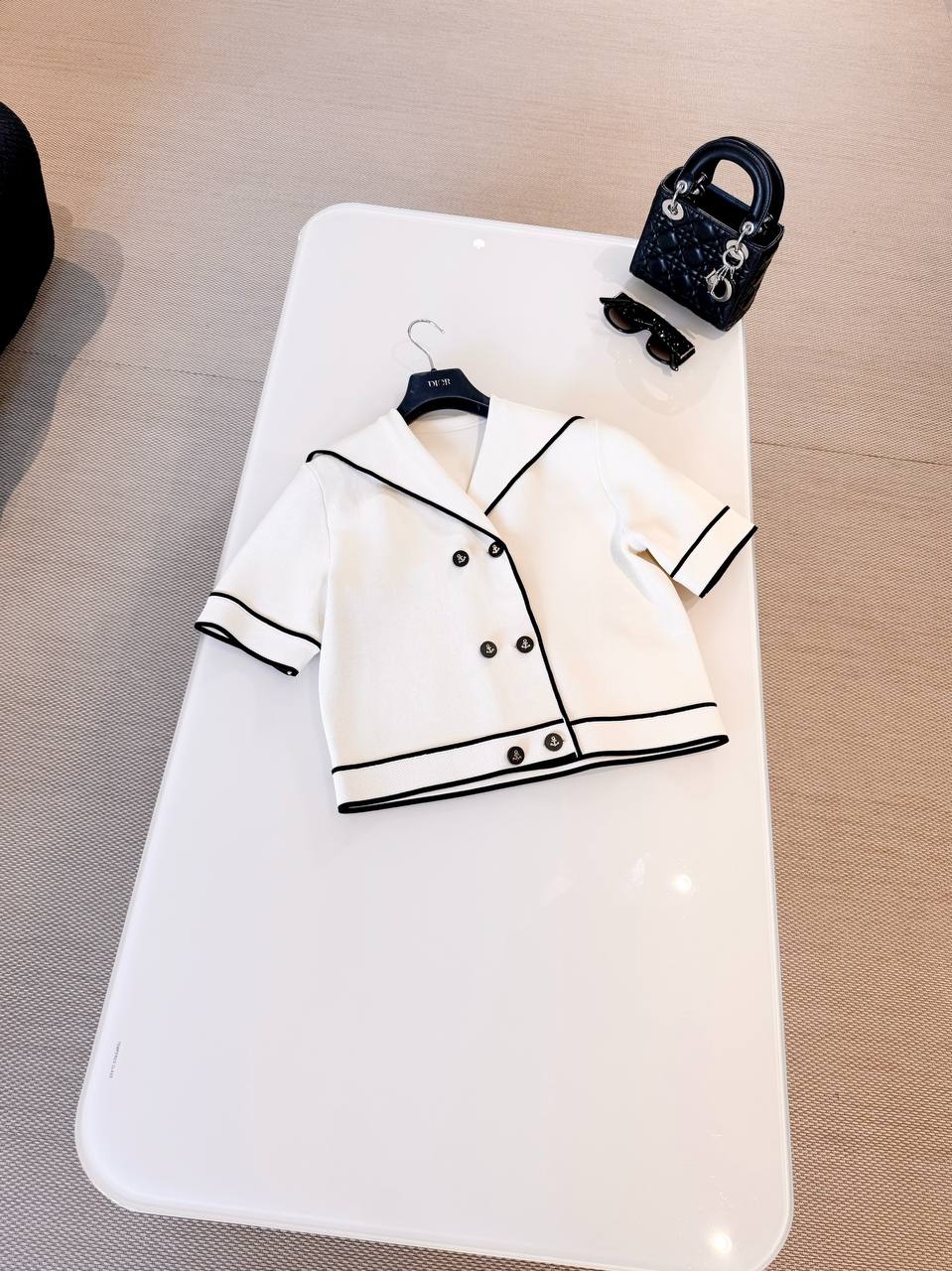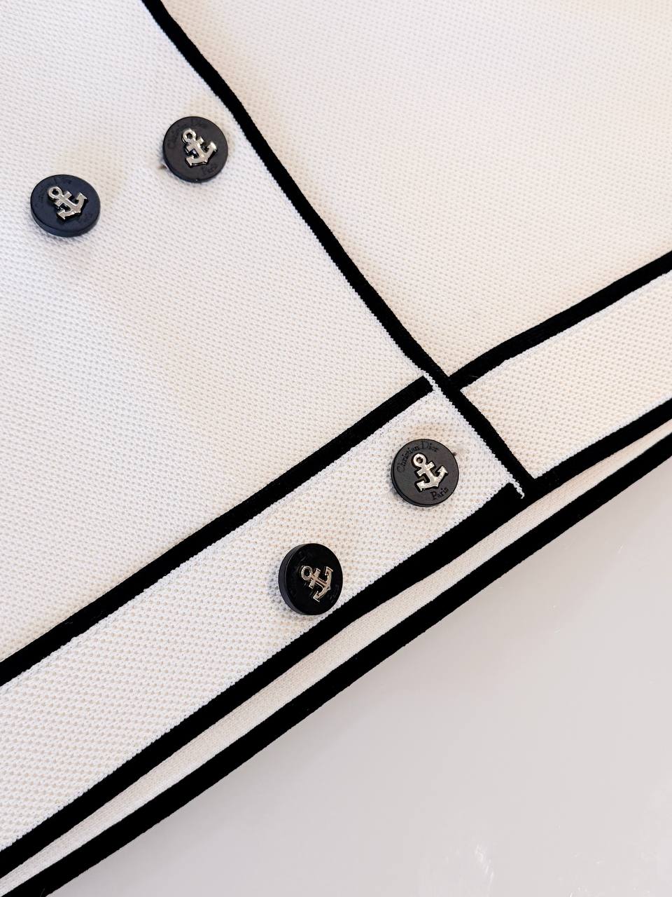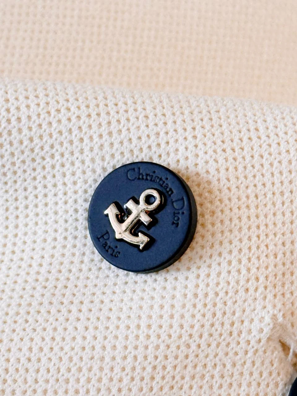 Элегантная женская футболка от CHRISTIAN DIOR, выполненная в лаконичном морском стиле: молочно‑белый фон и графичная чёрная окантовка подчёркивают строгую, но женственную силуэтную форму. Двубортный перед, небольшой лацканный воротник и аккуратные короткие рукава создают эффект жакета при комфорте трикотажной вещи.