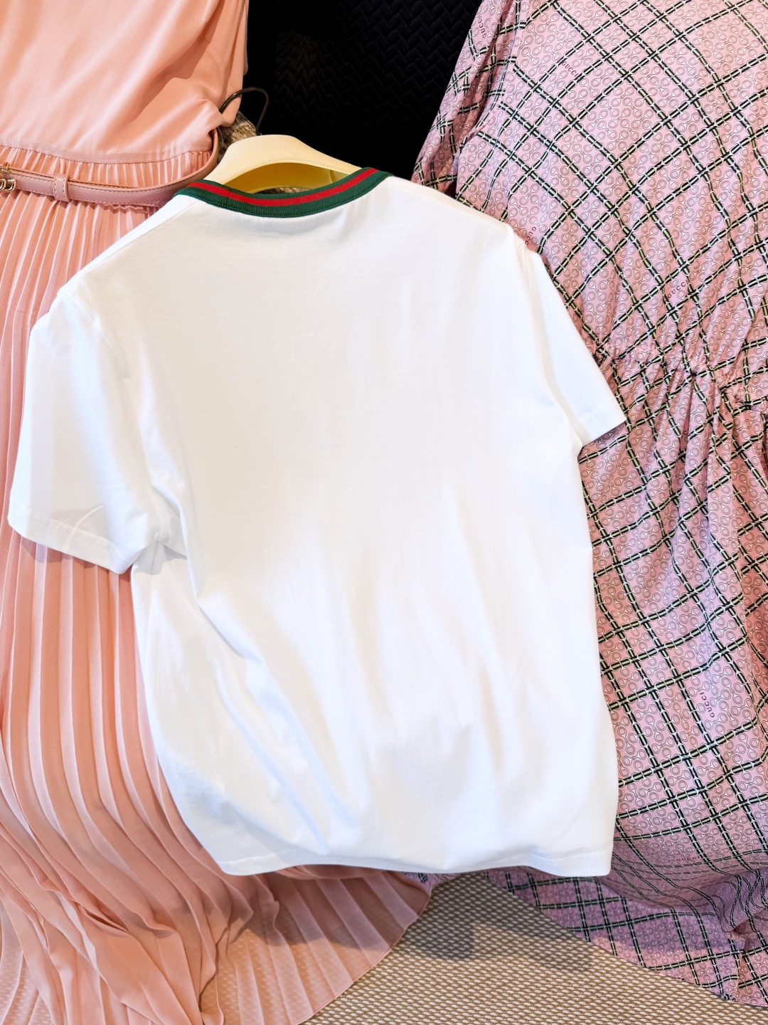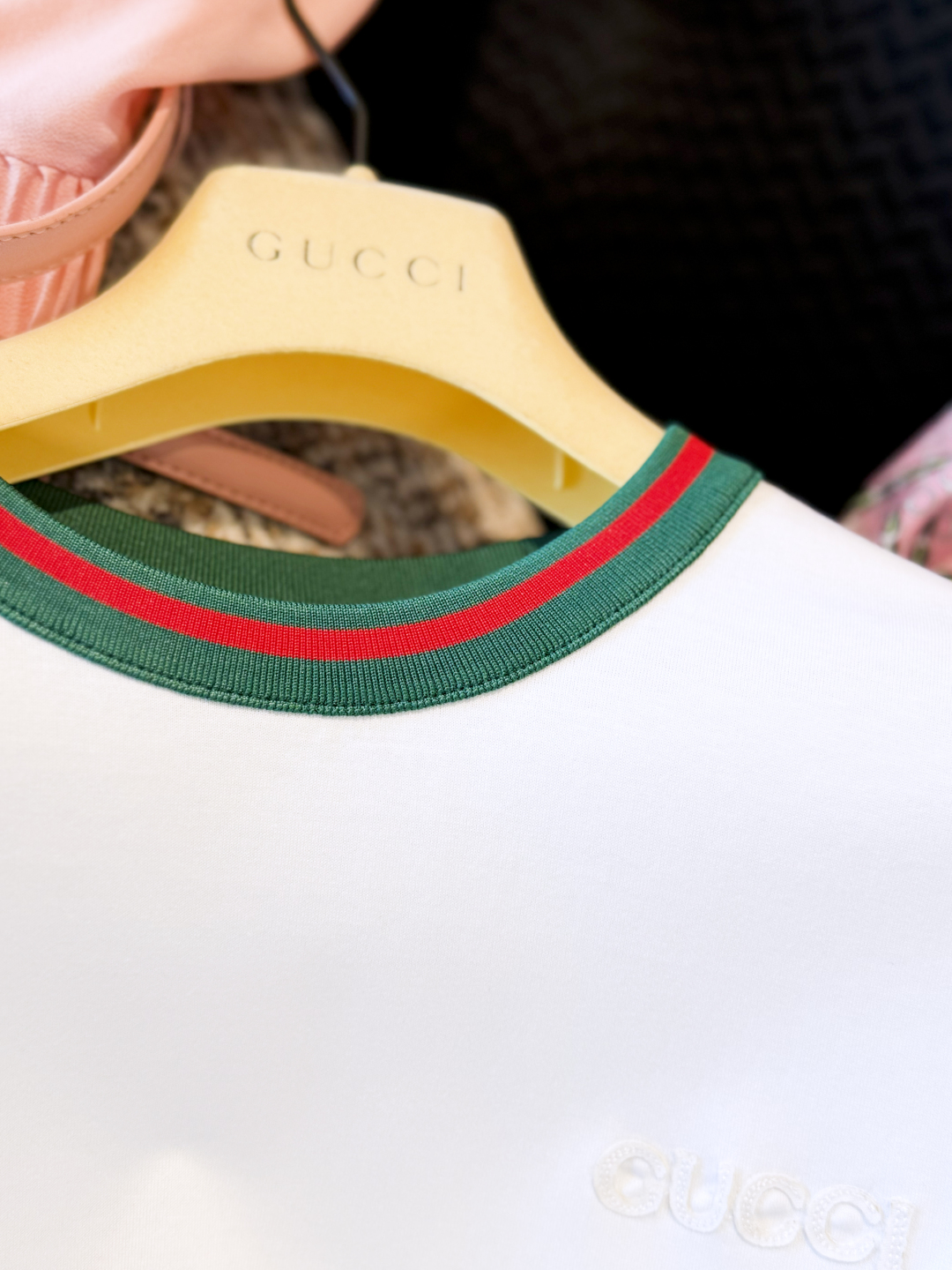 Акцентом служит контрастный ворот с фирменной зеленой и красной полоской, а также вышивка логотипа на груди, что придаёт изделию изысканный и узнаваемый вид. Такая футболка идеально сочетается с джинсами, юбками или пиджаками, добавляя Вашему образу нотку итальянской роскоши.