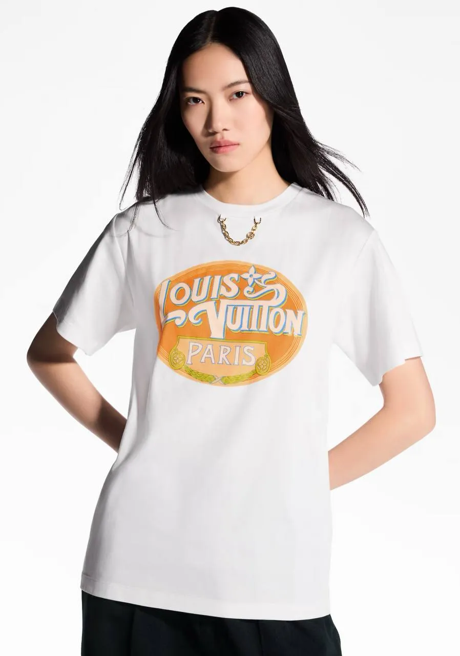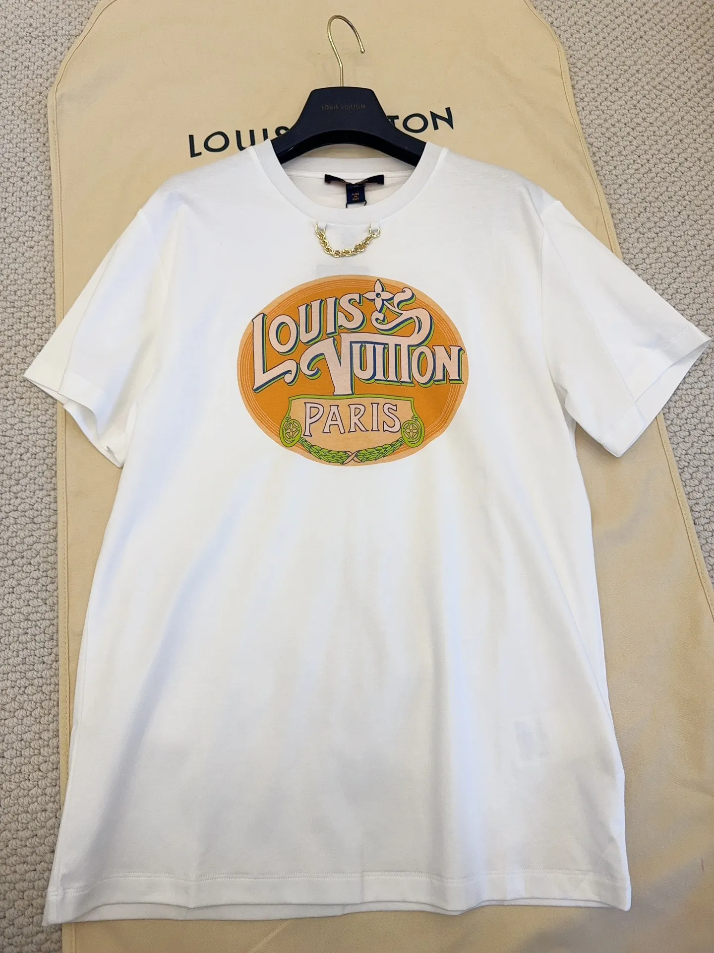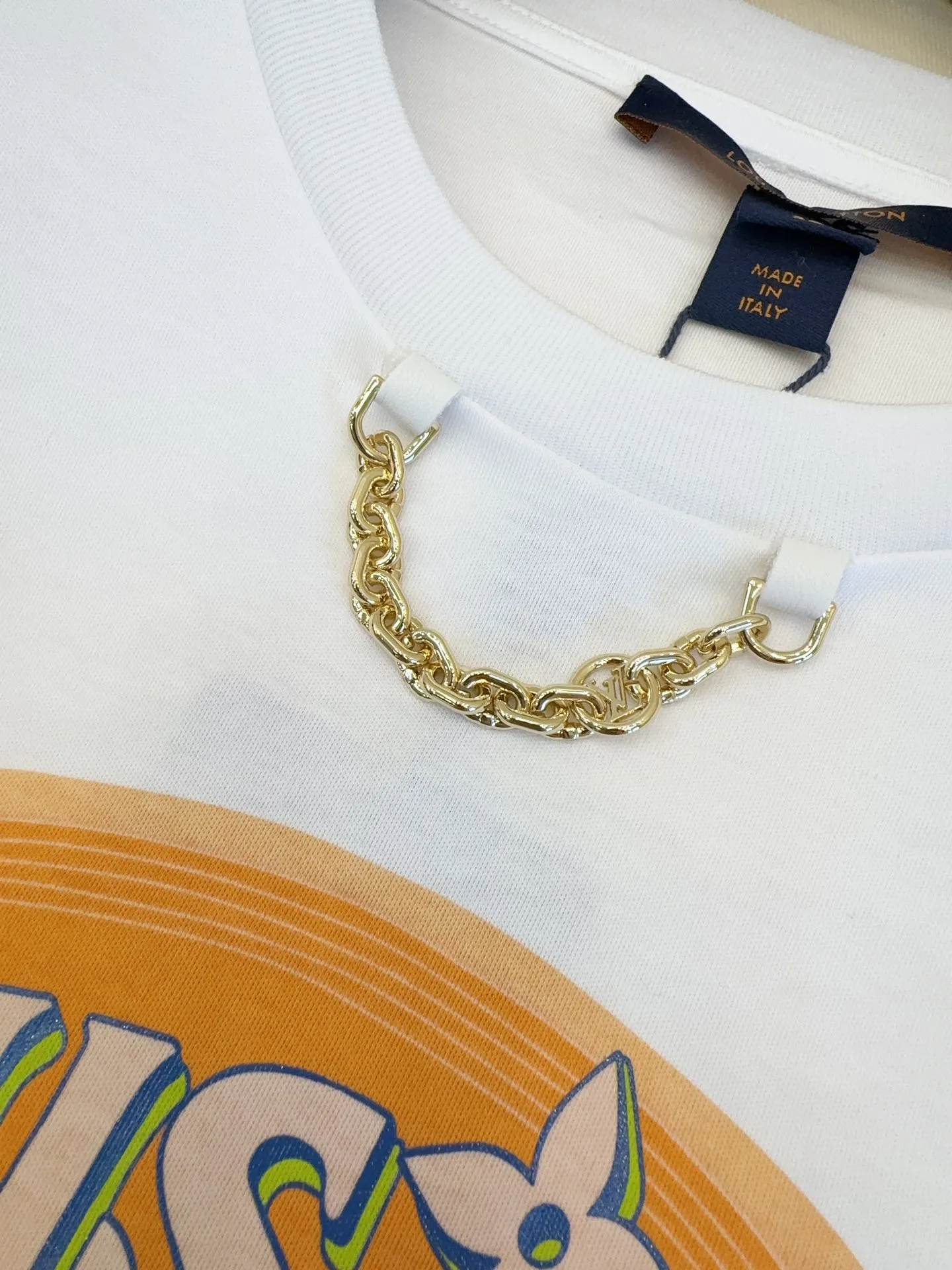 Подчеркните свой стиль с новой футболкой LV2025. Дерзкий принт в виде штампа с надписью на груди приковывает взгляды и подчеркивает вашу индивидуальность. Цепочка с логотипом добавляет изысканный штрих и узнаваемость бренду. Свободный крой с круглым вырезом обеспечивает свободу движений и подходит для любого типа фигуры.
