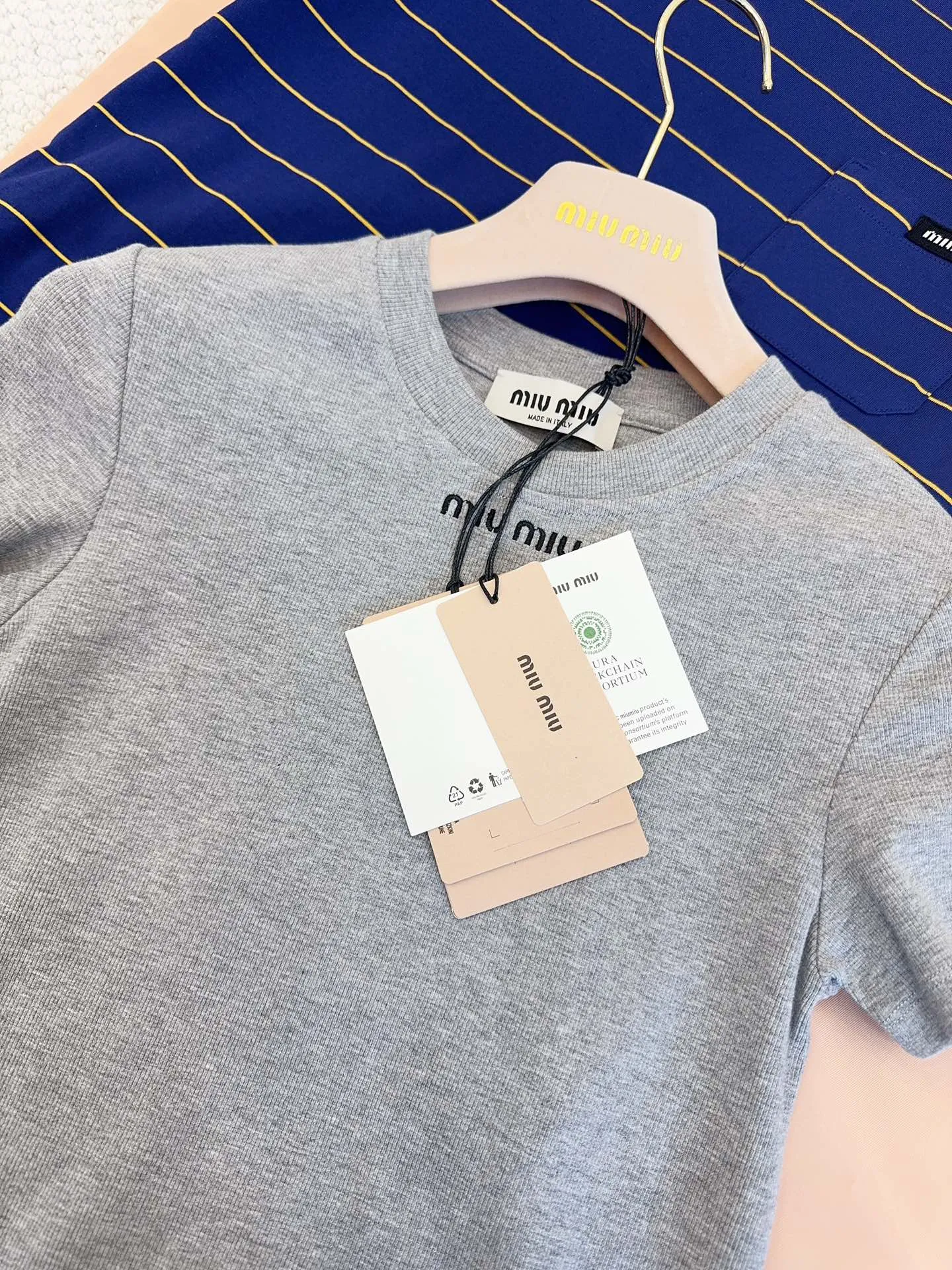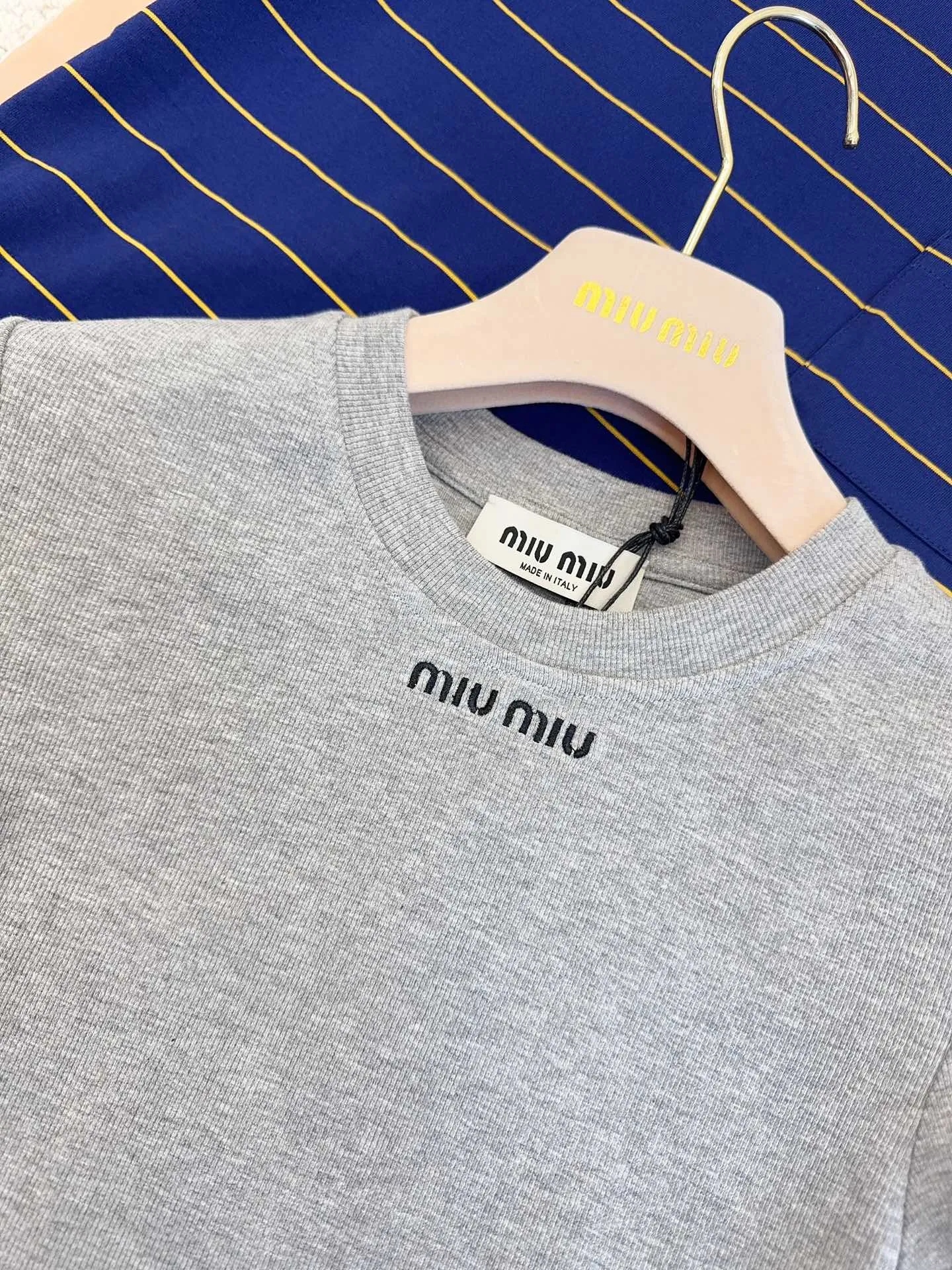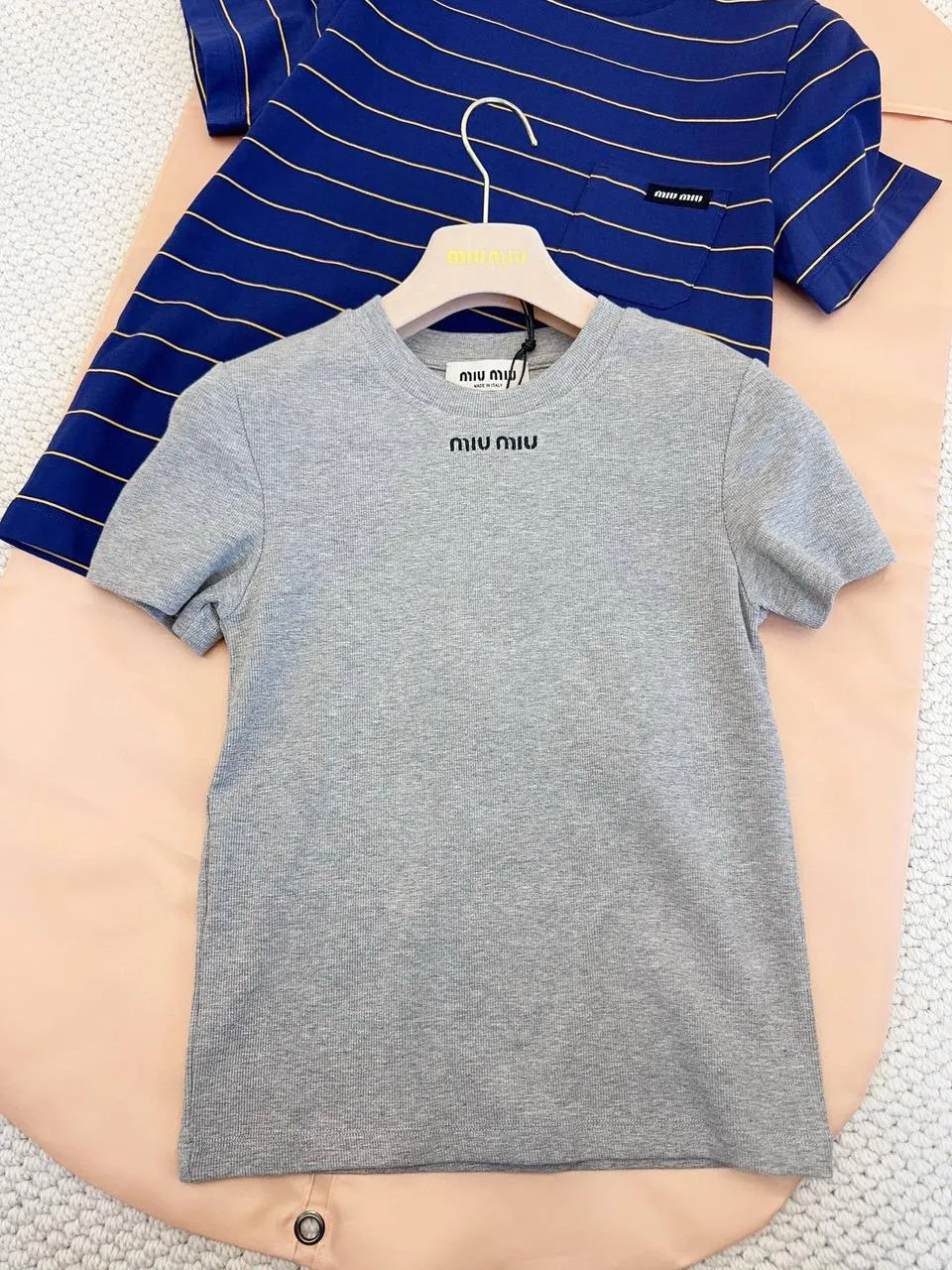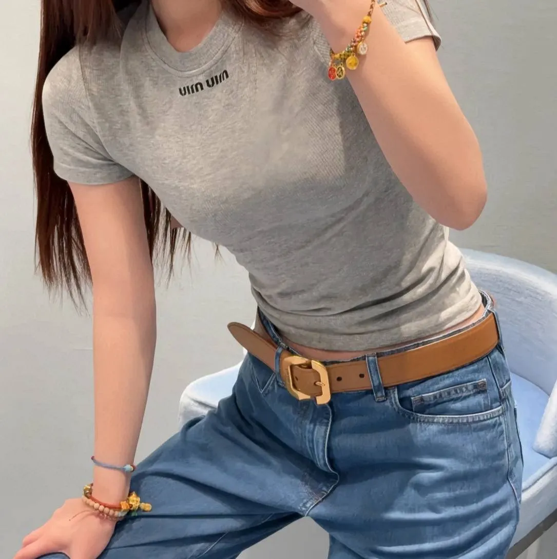 Представляем новую базовую серую футболку от Miu Miu 2025, идеально сочетающую в себе минимализм и узнаваемый стиль бренда. Облегающий крой подчеркивает достоинства фигуры, создавая элегантный и женственный силуэт. Мягкая эластичная трикотажная ткань из хлопка обеспечивает исключительный комфорт и свободу движений.