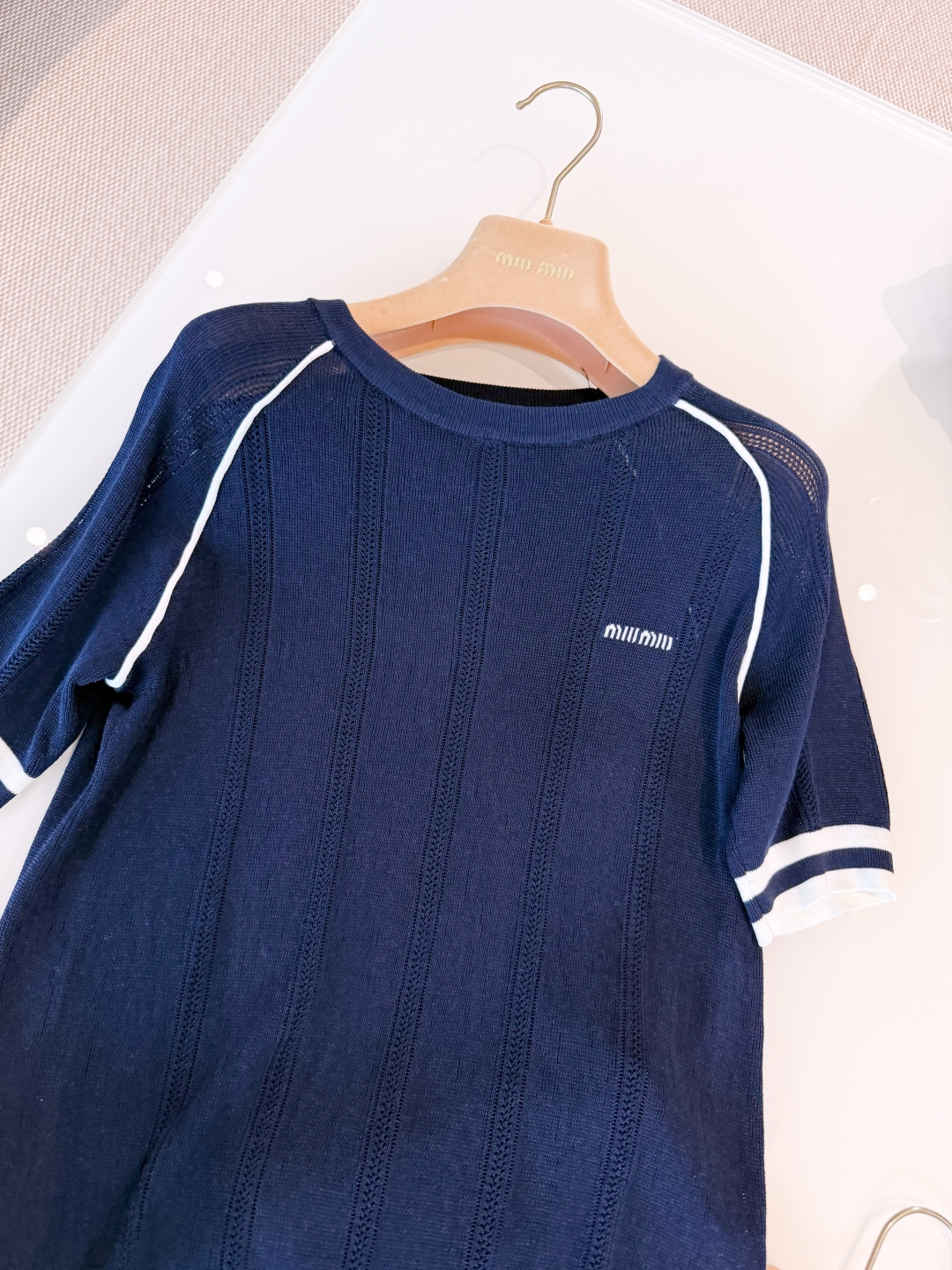 Стильная женская футболка MIU MIU выполнена из мягкой фактурной ткани глубокого синего цвета. Дизайн украшен контрастными белыми полосами на рукавах и плечах, а также фирменной вышивкой логотипа MIU MIU на груди. Модель отличается круглым вырезом и короткими рукавами, которые обеспечивают комфорт даже в теплую погоду. Лаконичный и элегантный крой идеально подойдет как для повседневных образов, так и для сочетания с более формальной одеждой.