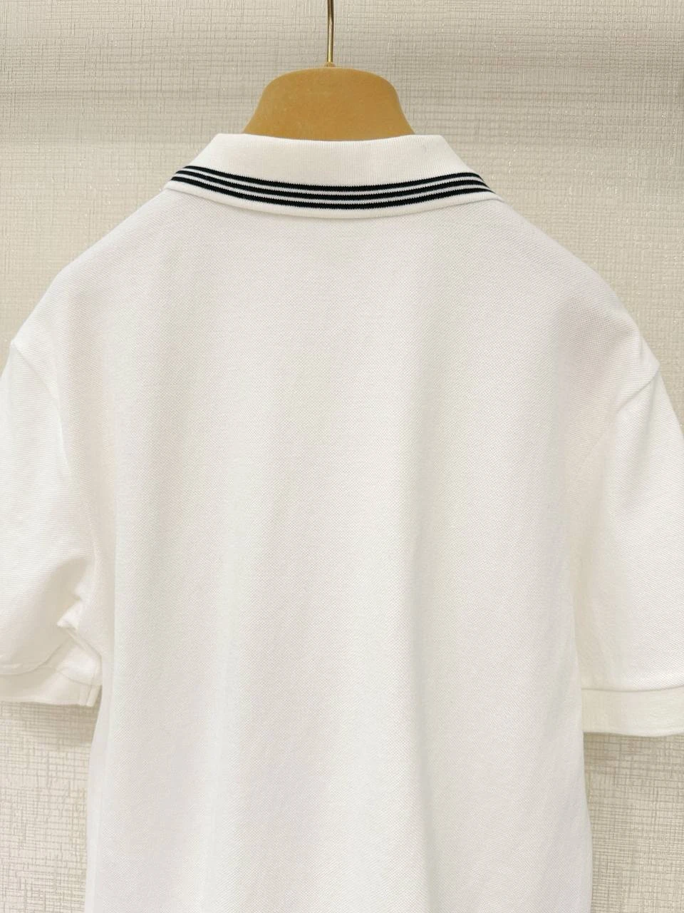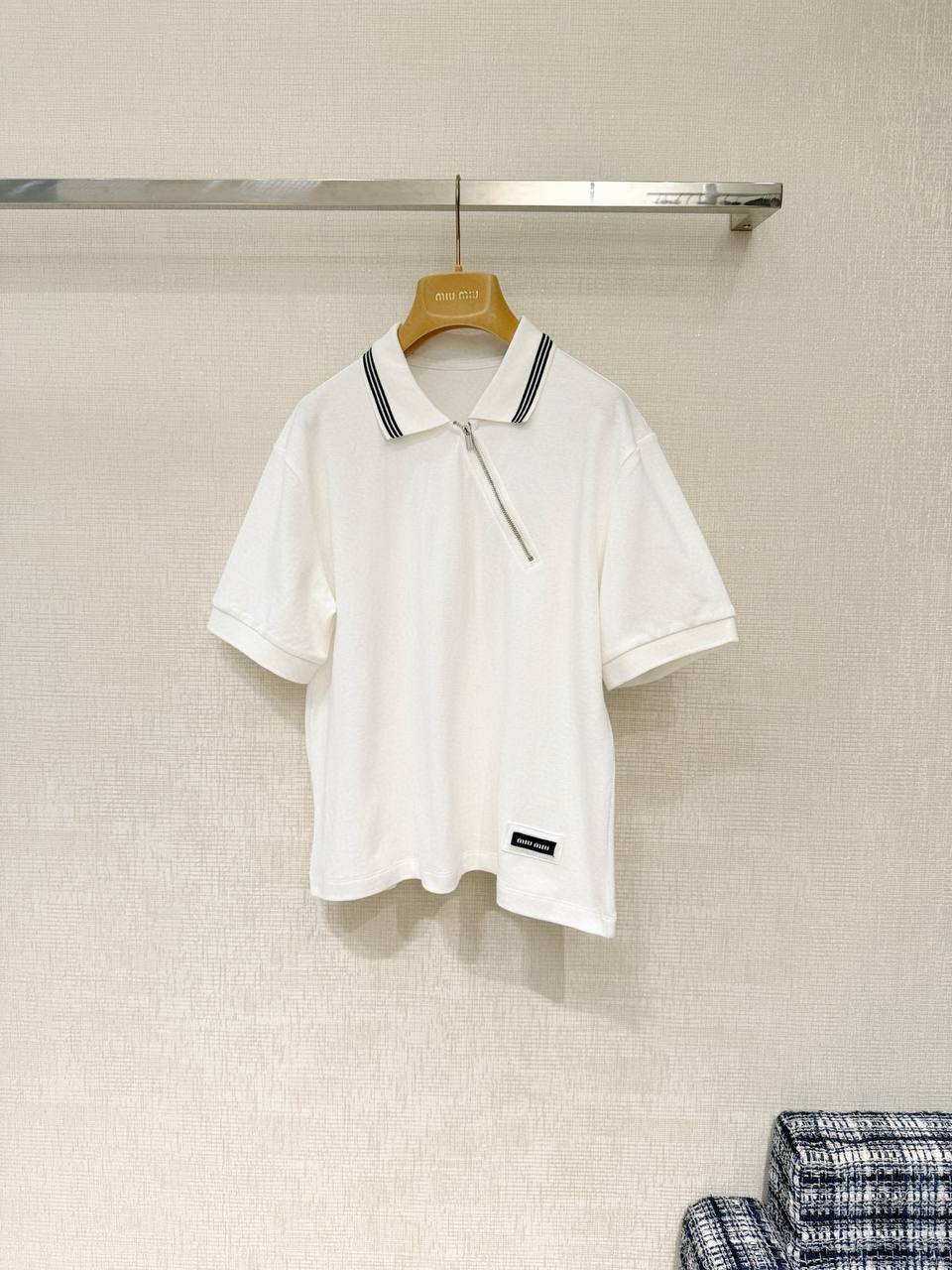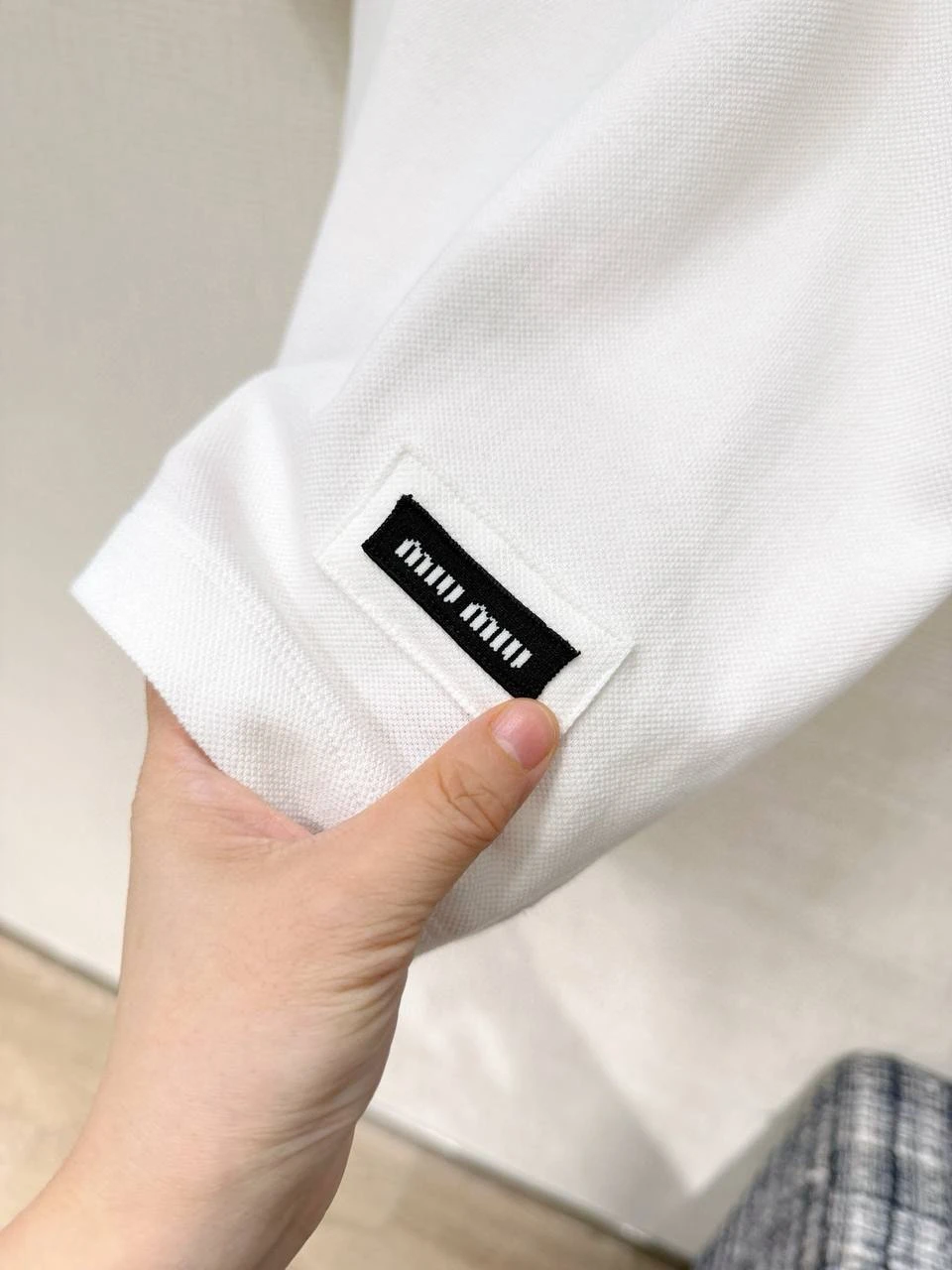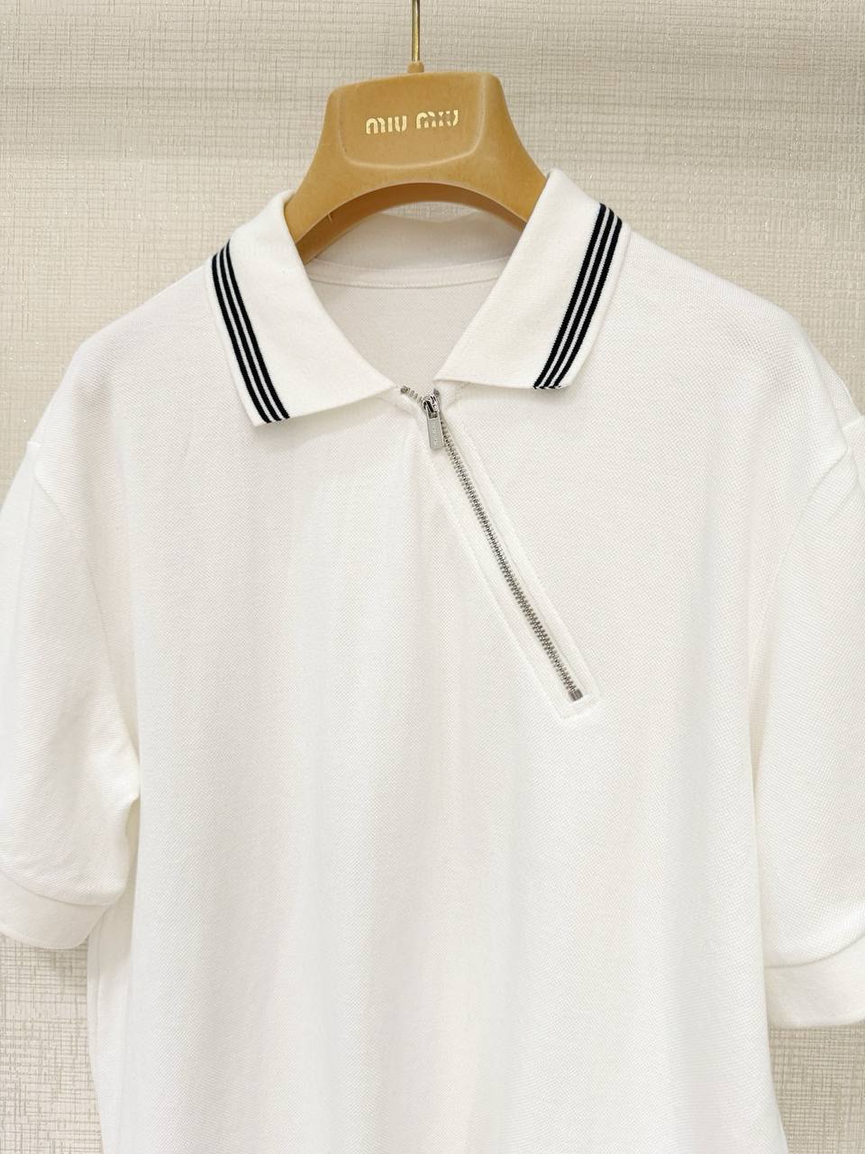 Стильное и минималистичное поло MIU MIU в базовом белом цвете, выполненное из хлопкового полотна с лёгкой фактурой. Отличается лаконичным силуэтом, аккуратным воротником с тёмными полосками и оригинальной диагональной молнией — современная интерпретация классического поло с дизайнерской деталью.