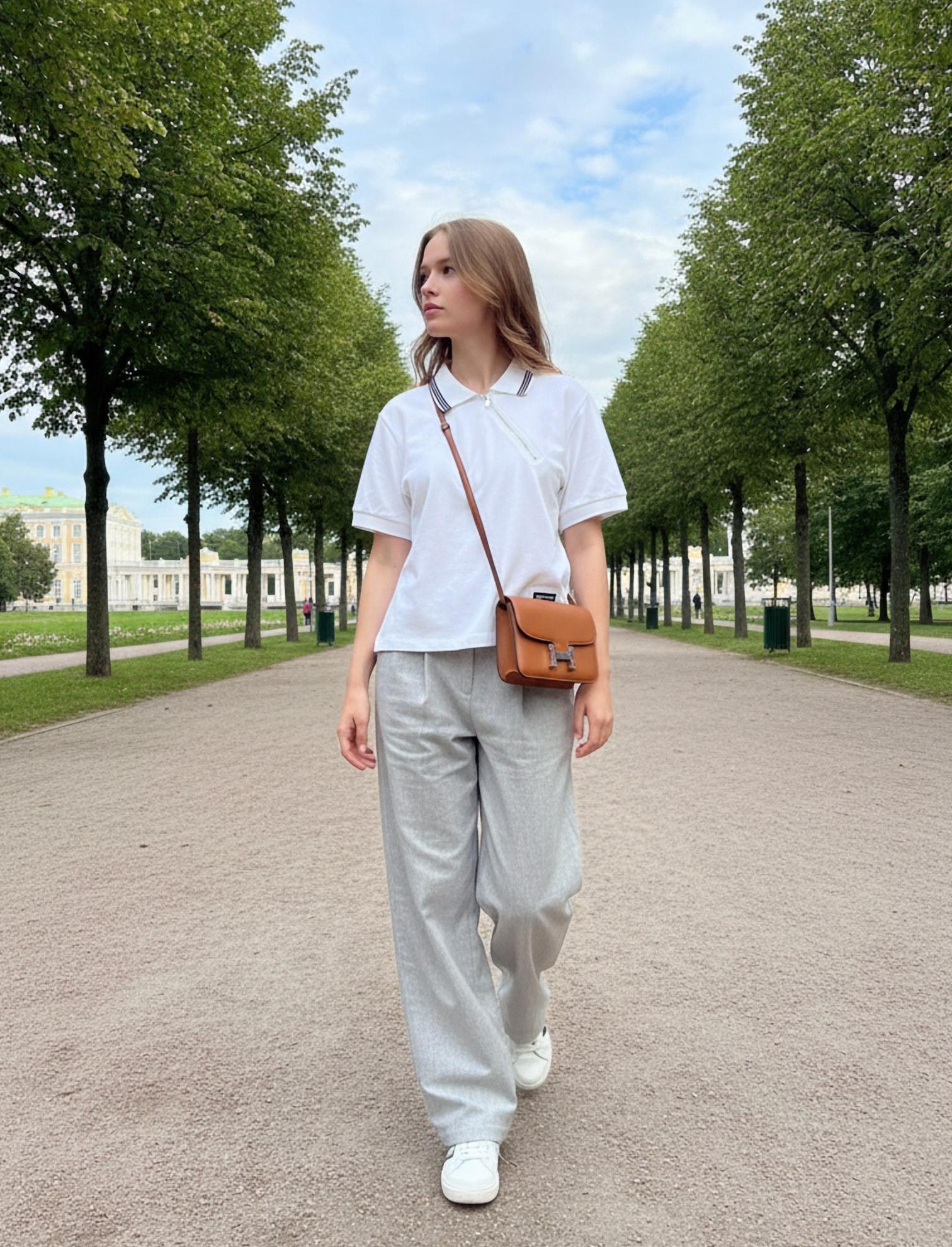 • Воротник: классический отложной поло с двумя тонкими тёмными полосками по краю.