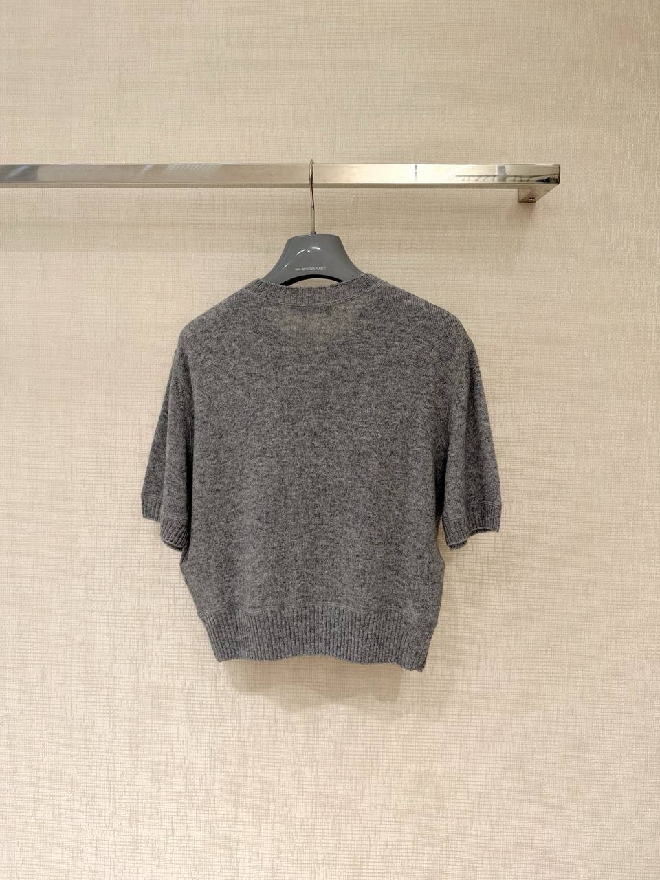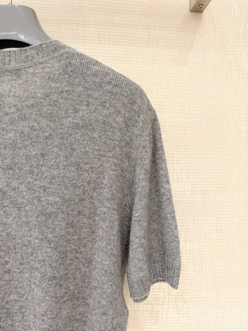 Модель объединяет комфорт трикотажа и утонченность роскошного материала — кашемира. Мягкая ворсистая фактура приятна на ощупь и обеспечивает естественную терморегуляцию, делая вещь идеальной для межсезонья и прохладного лета. Укороченная длина и свободный, чуть укороченный рукав придают образу лёгкую расслабленность и современный городской характер. Центральная графика — герб и надпись PRADA MILANO, выполненные в бордовом оттенке — аккуратно вплетены в полотно и подчёркивают принадлежность к дому моды, не перегружая силуэт.