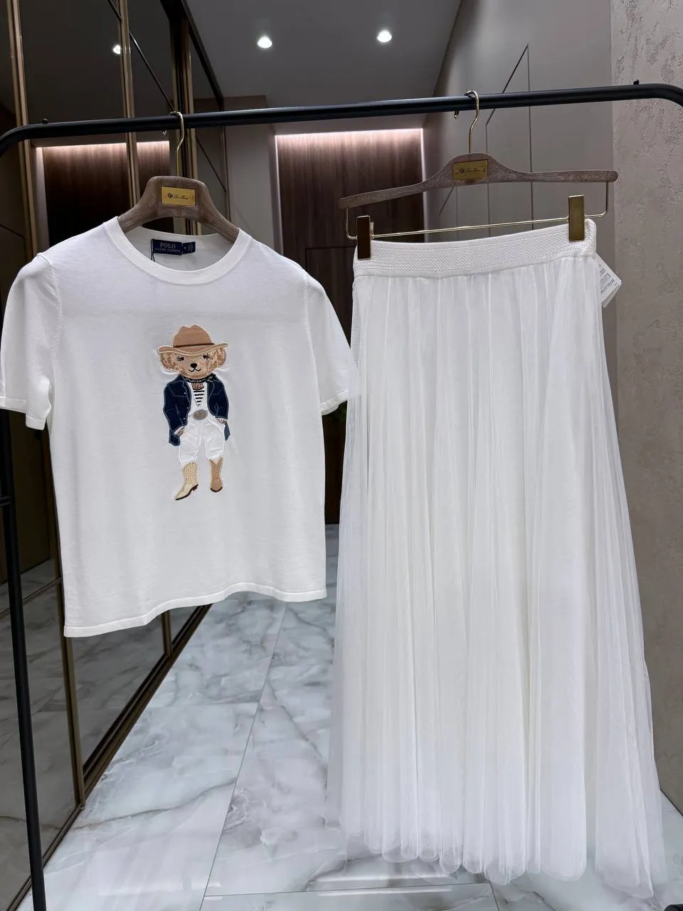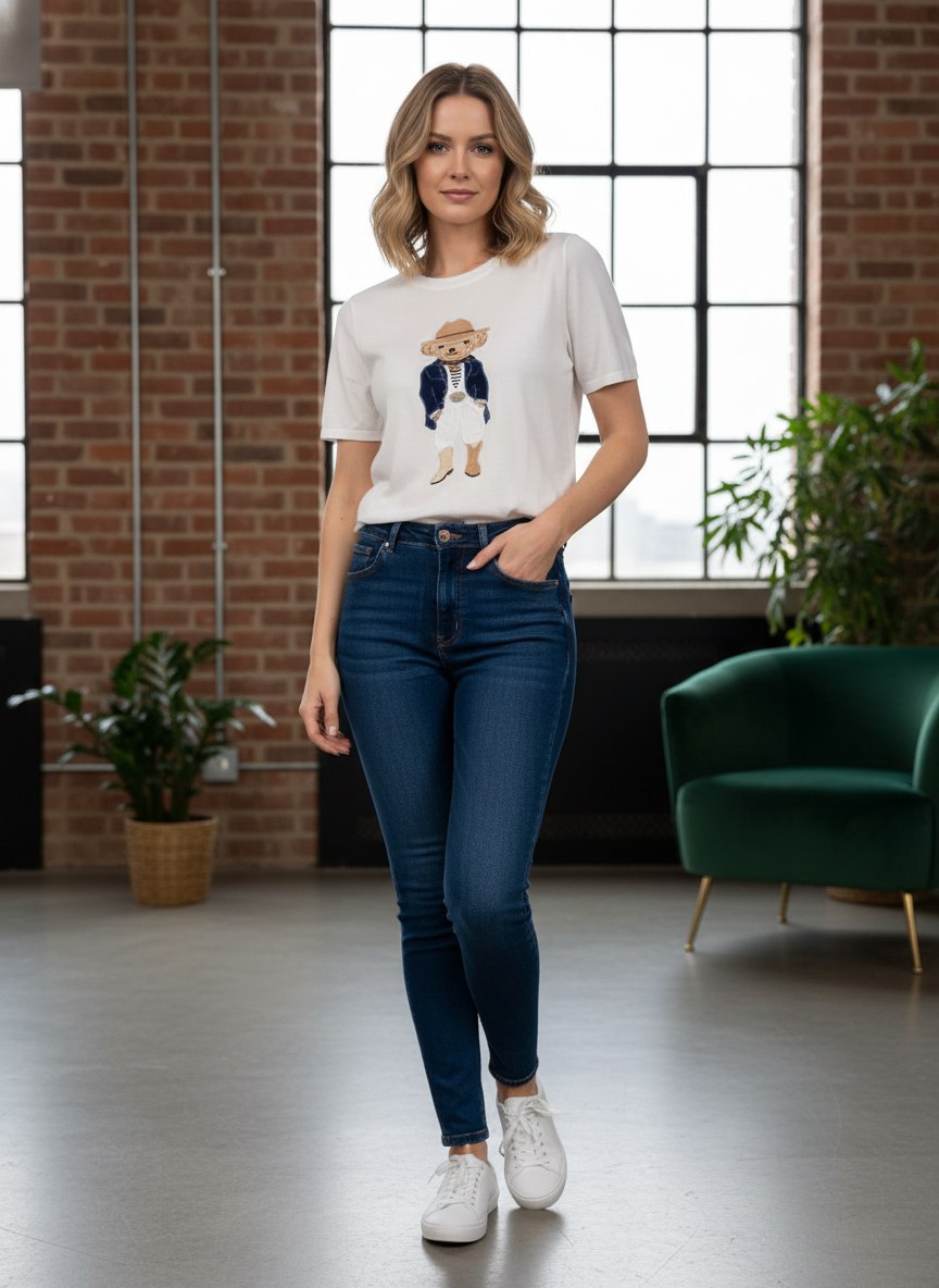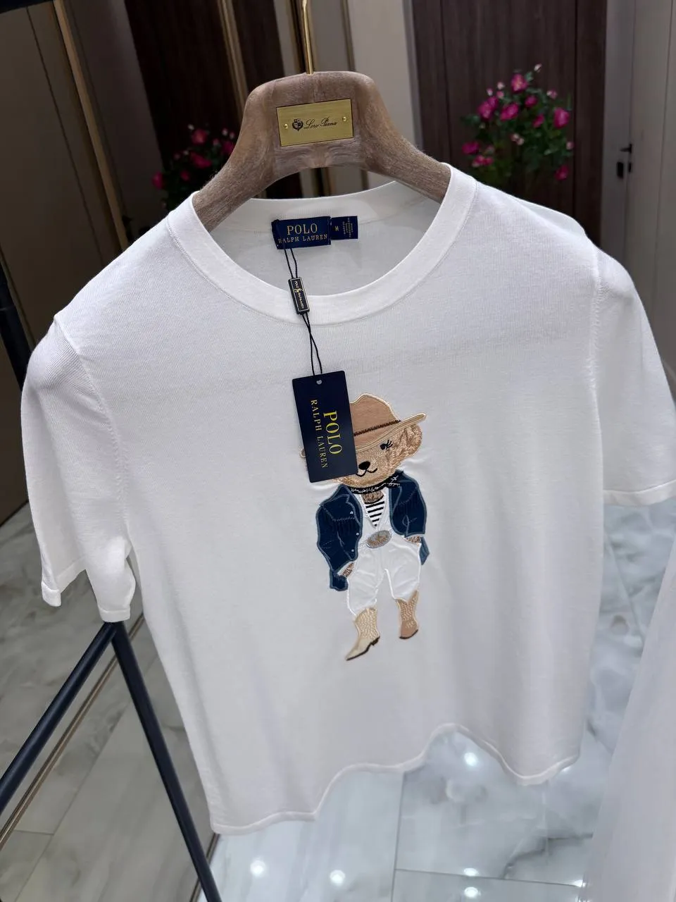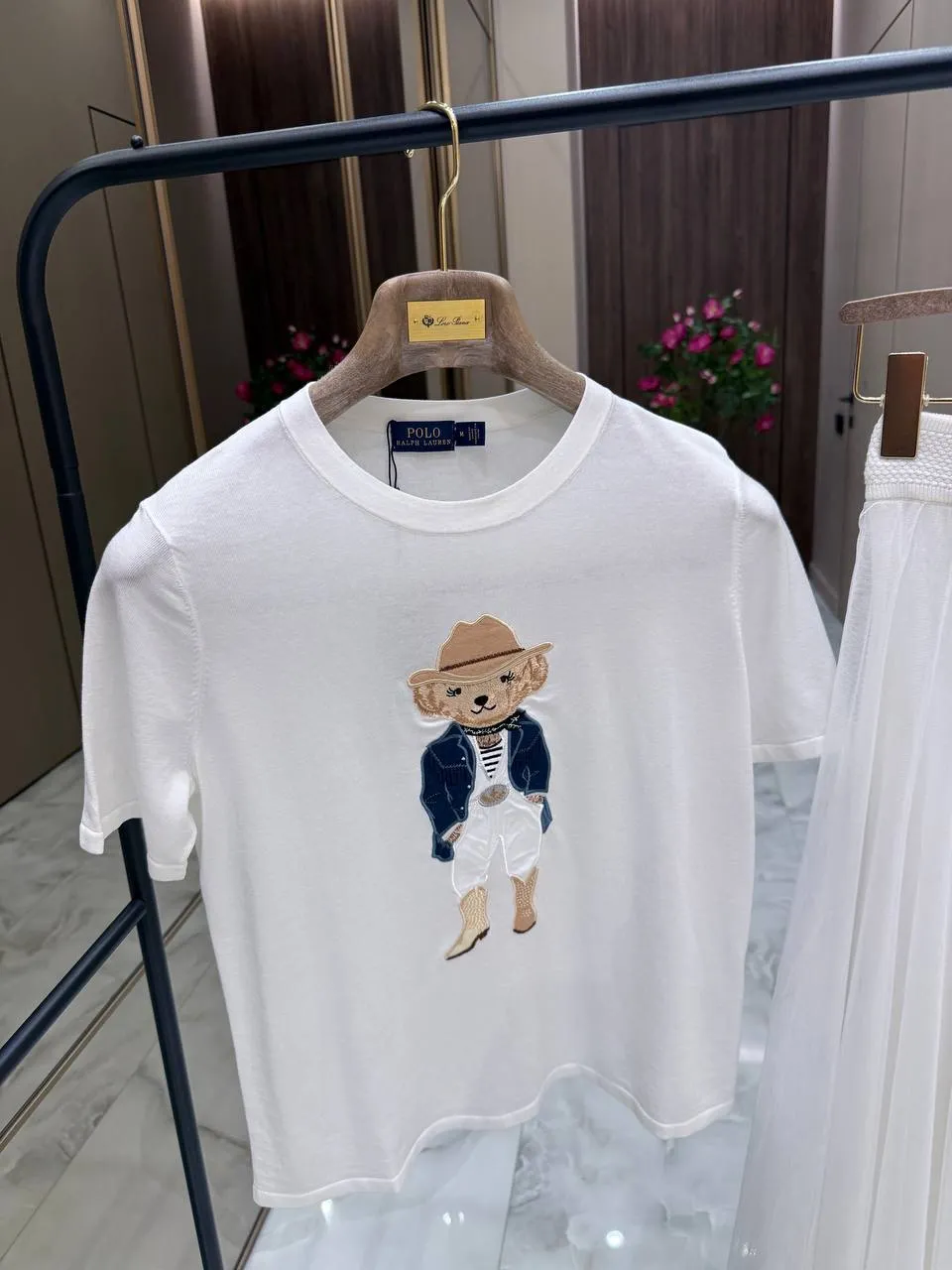 Стильная женская футболка от Ralph Lauren выполнена из мягкого хлопка белого цвета. Основной акцент — фирменный вышитый медведь в пиджаке, рубашке, шортах, казаках и шляпе, что придаёт изделию игривость и узнаваемый шик бренда.