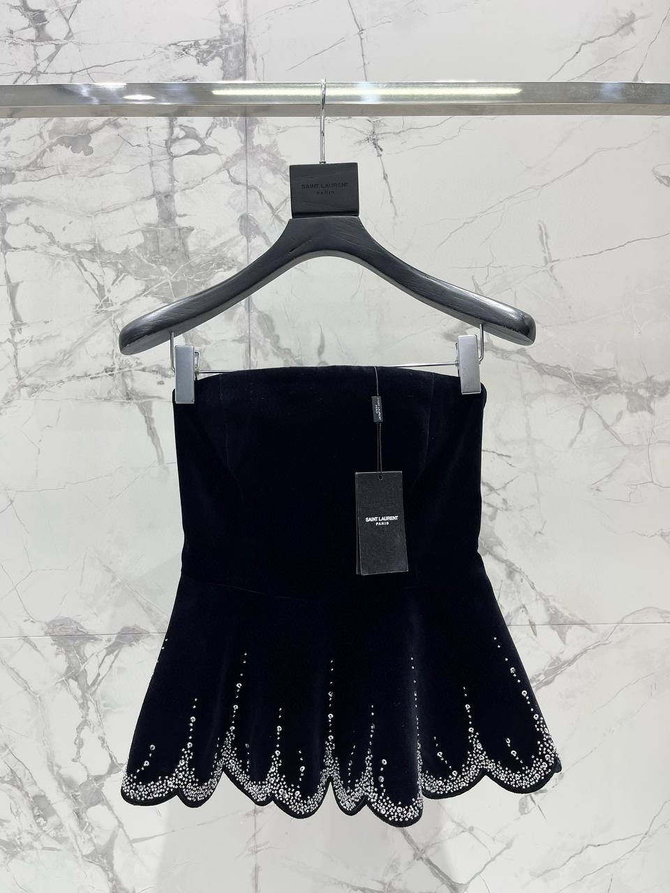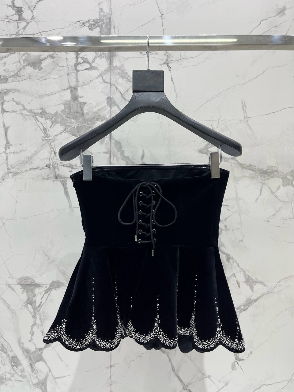 Элегантный вечерний топ из глубокого черного бархата — ультраженственная и в то же время графичная модель без бретелей. Плотный корсетный верх подчеркивает линию талии, а слегка расклешённый низ с волнистым (scalloped) краем украшен мерцающими аппликациями, создающими эффект «звездной россыпи». Идеальный выбор для торжественных выходов и вечерних образов.