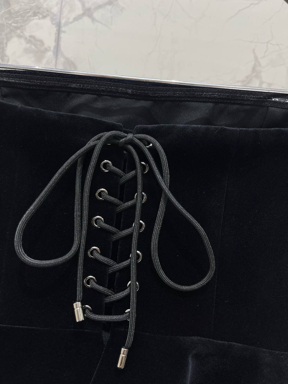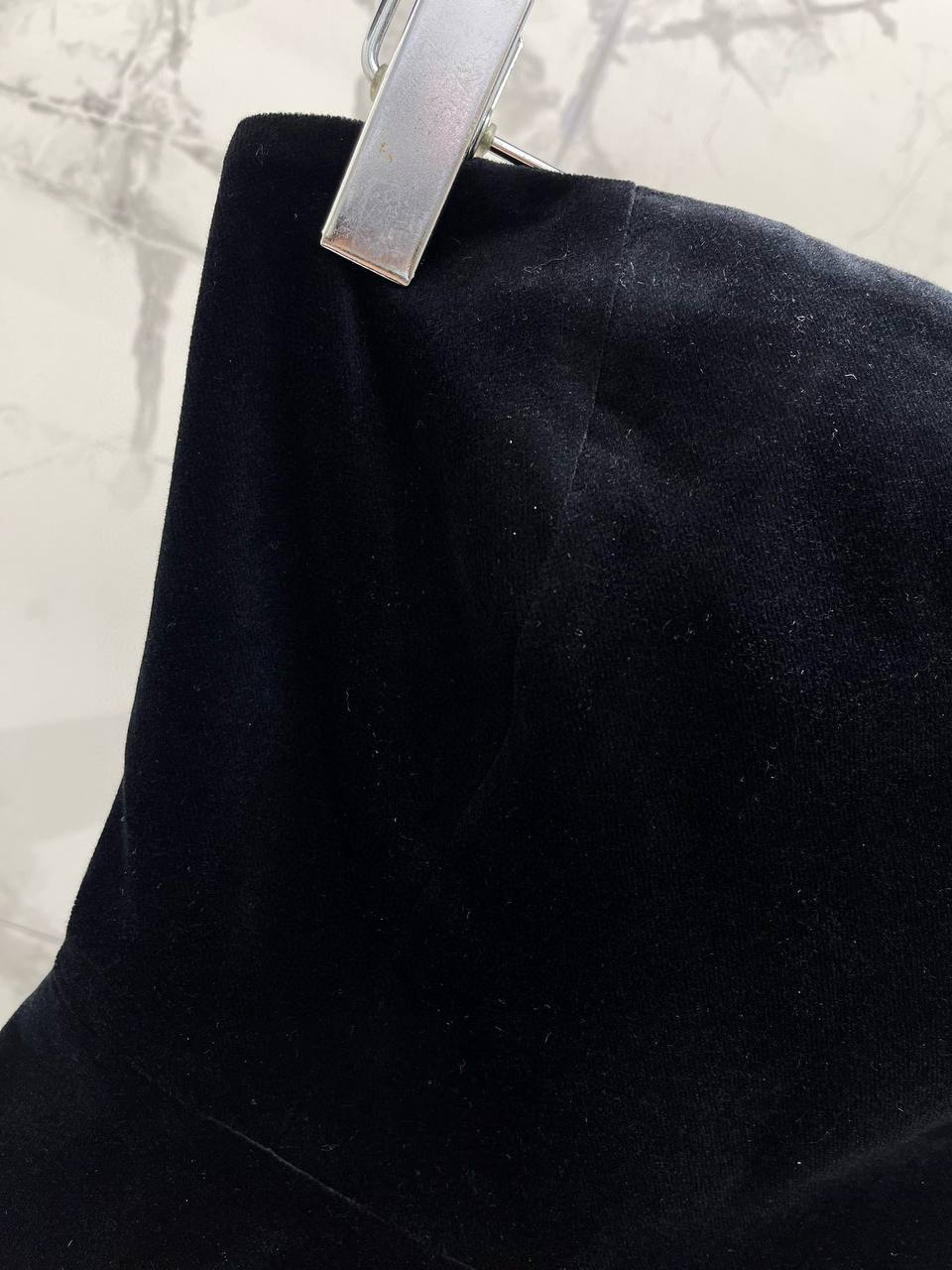 • Ткань: роскошный бархат насыщенного черного оттенка, мягкий на ощупь, с благородным блеском.