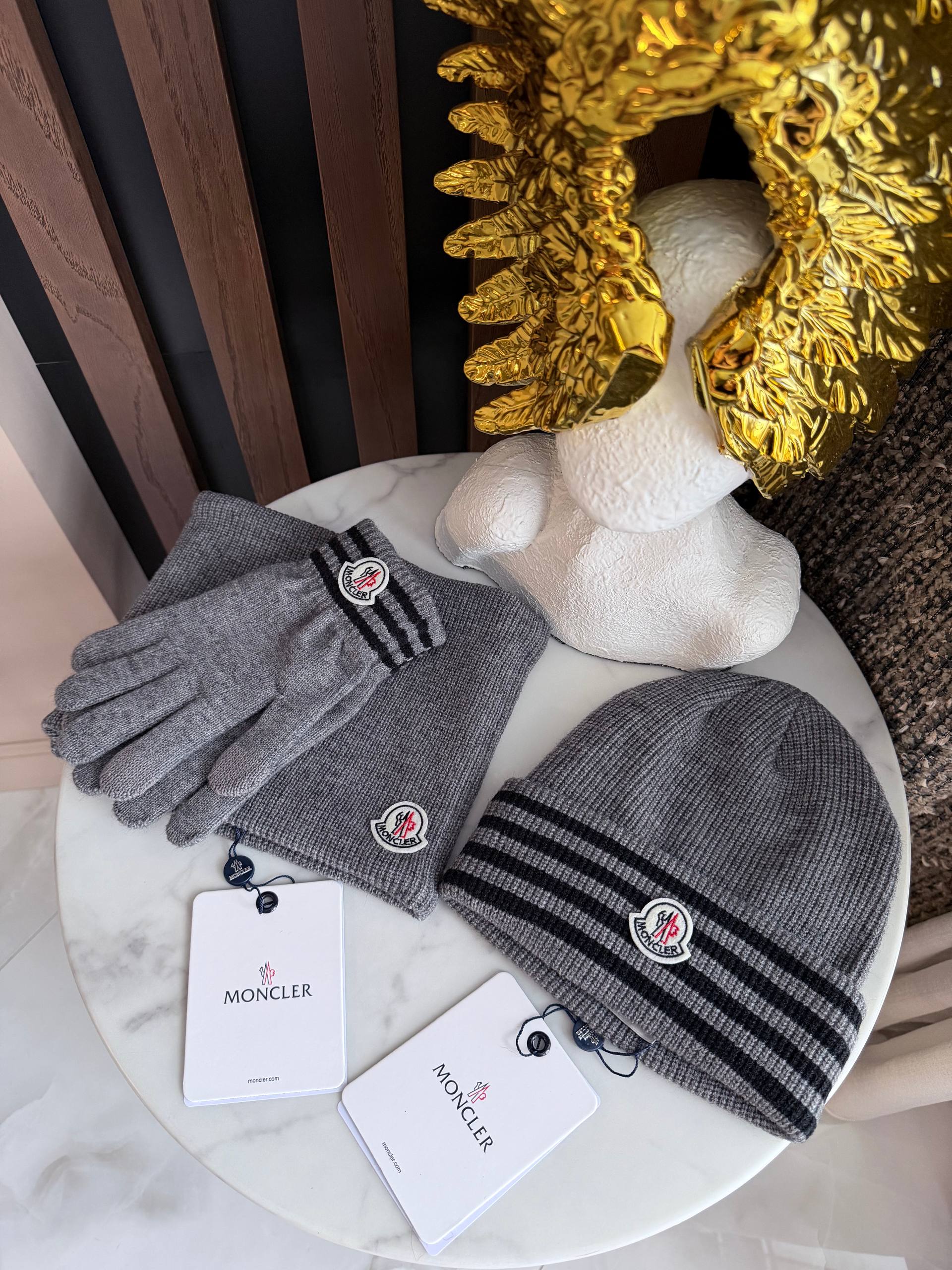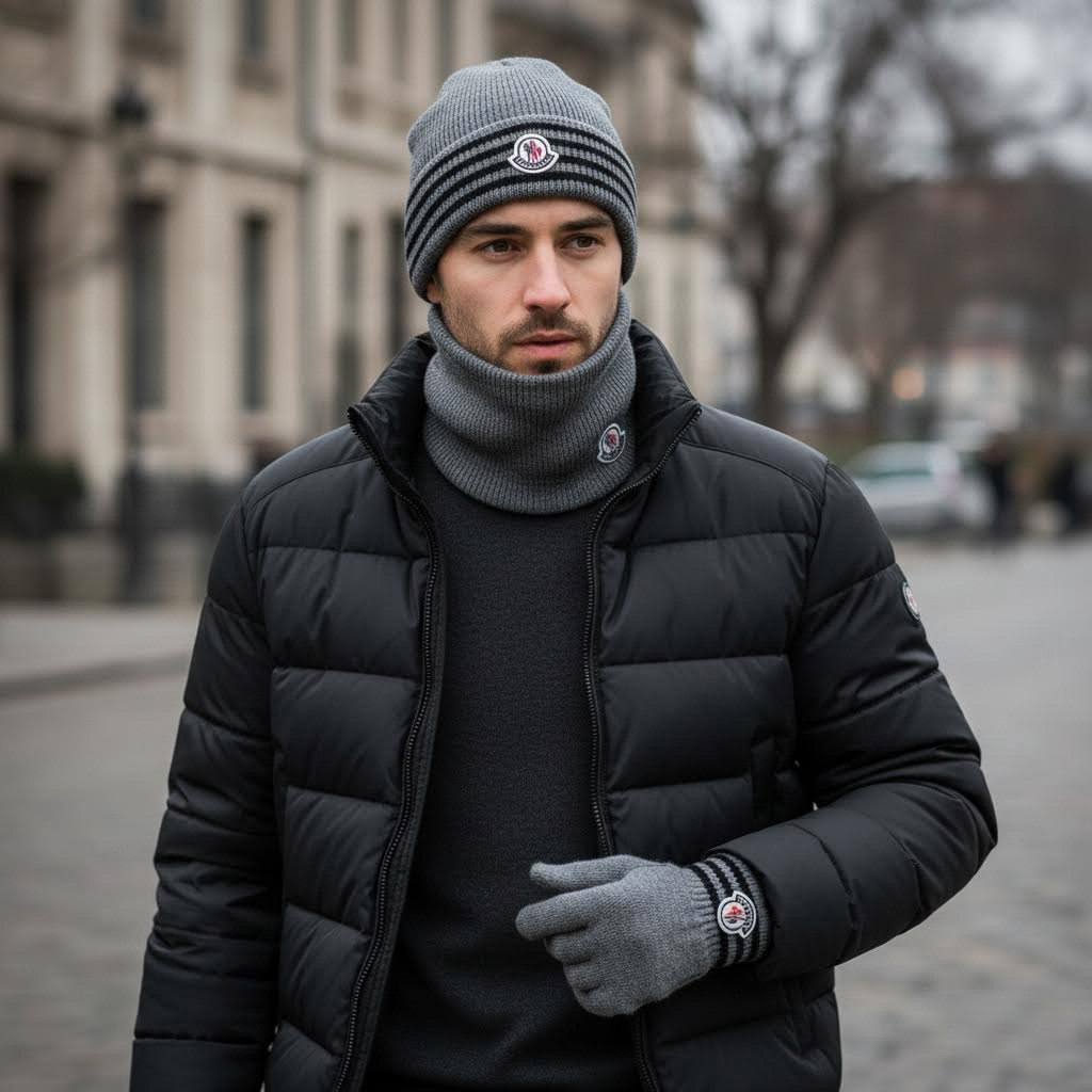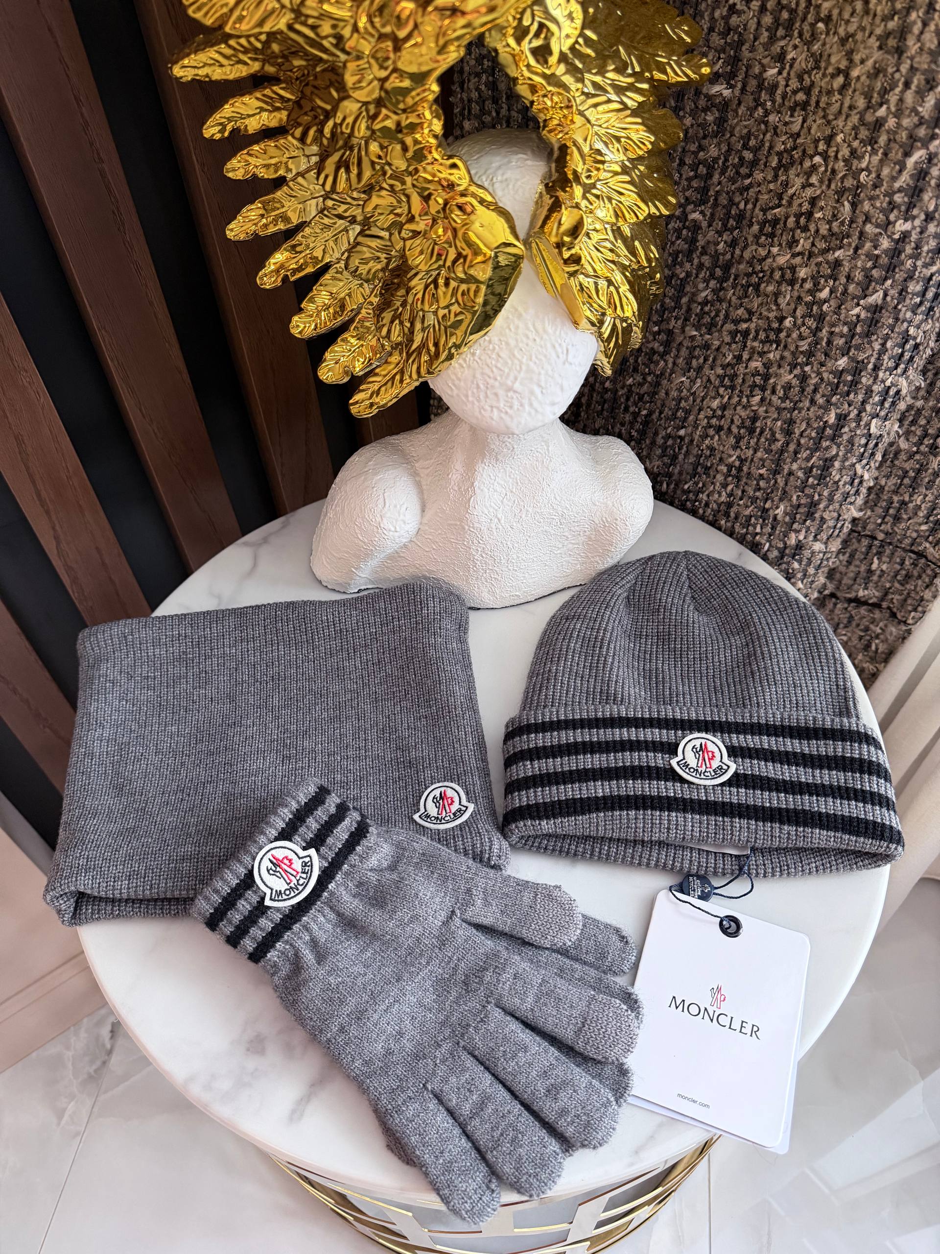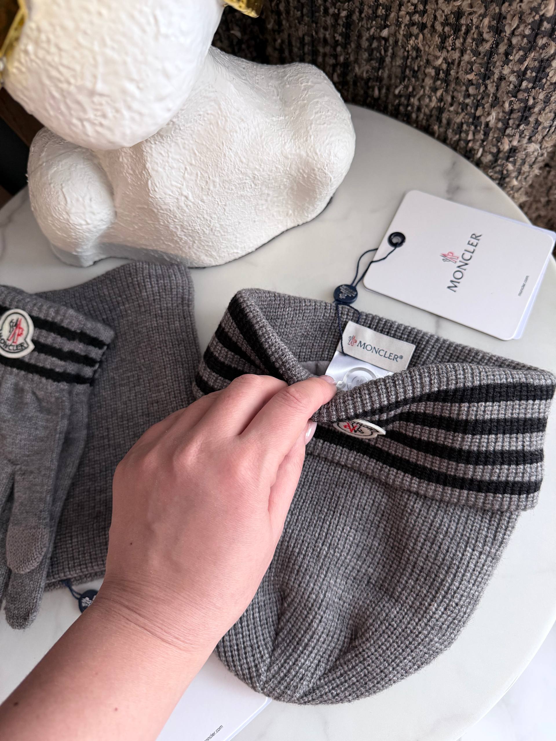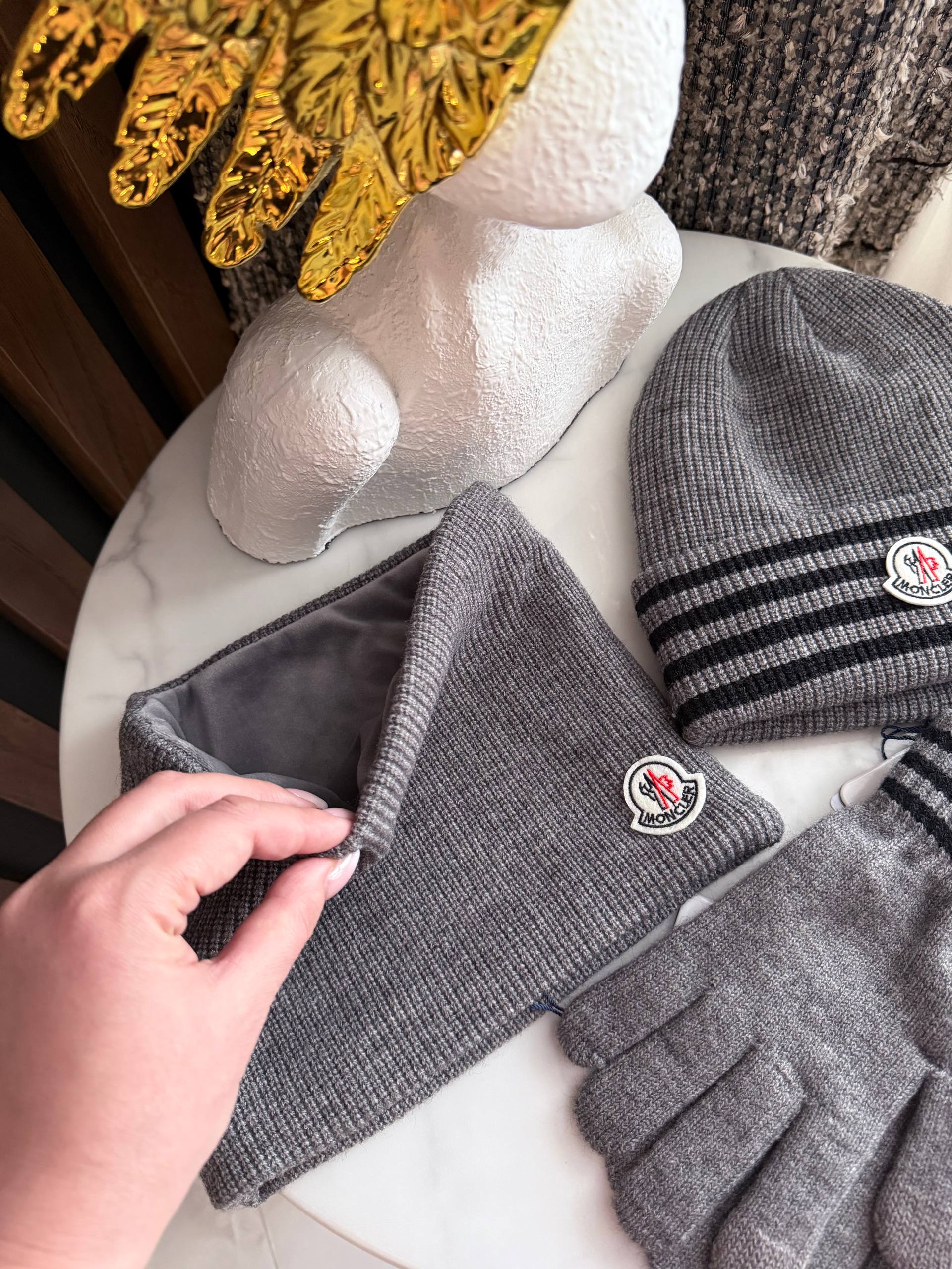 Элегантный зимний комплект от MONCLER, состоящий из шапки-бини, прямого шарфа и тёплых перчаток. Выполнен в сдержанном сером цвете с контрастной чёрной полоской и фирменной нашивкой Moncler на каждом элементе — идеальный выбор для тех, кто ценит лаконичный стиль и функциональность в холодное время года.