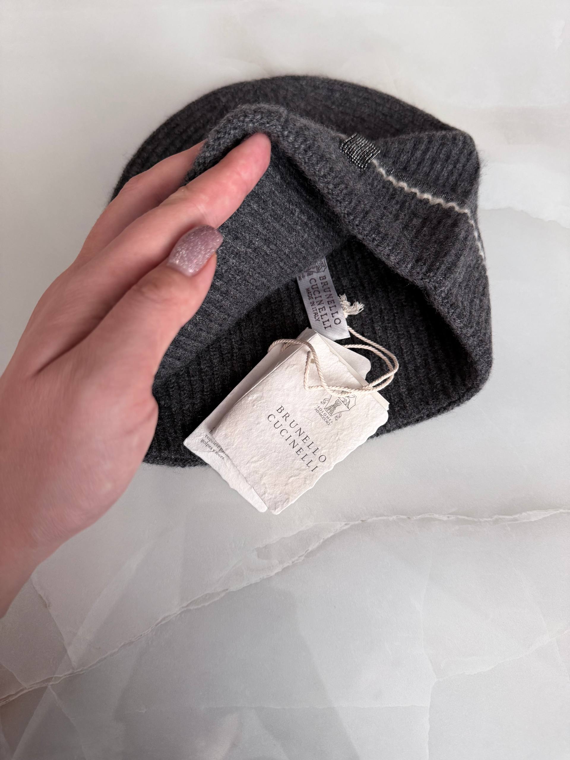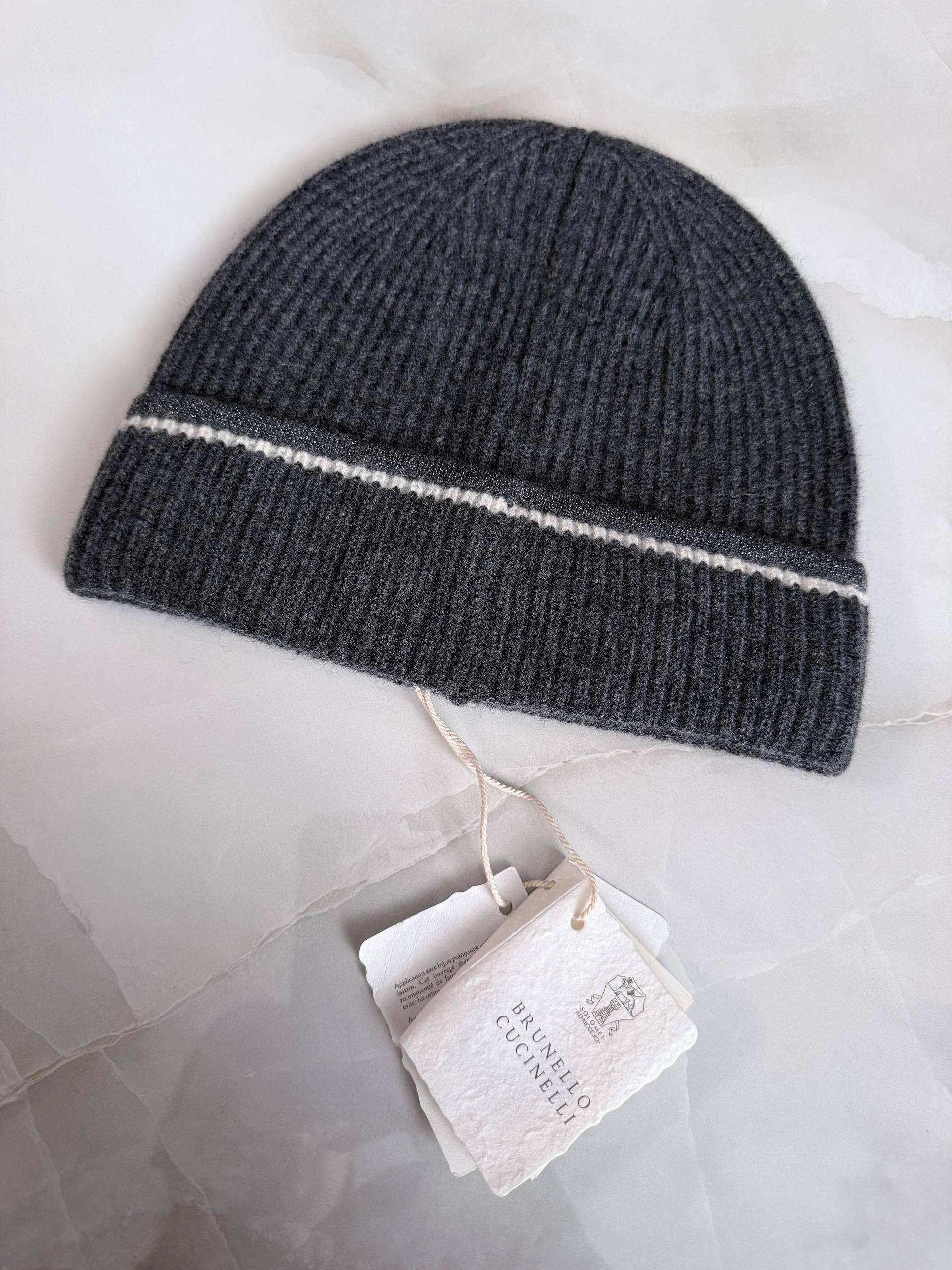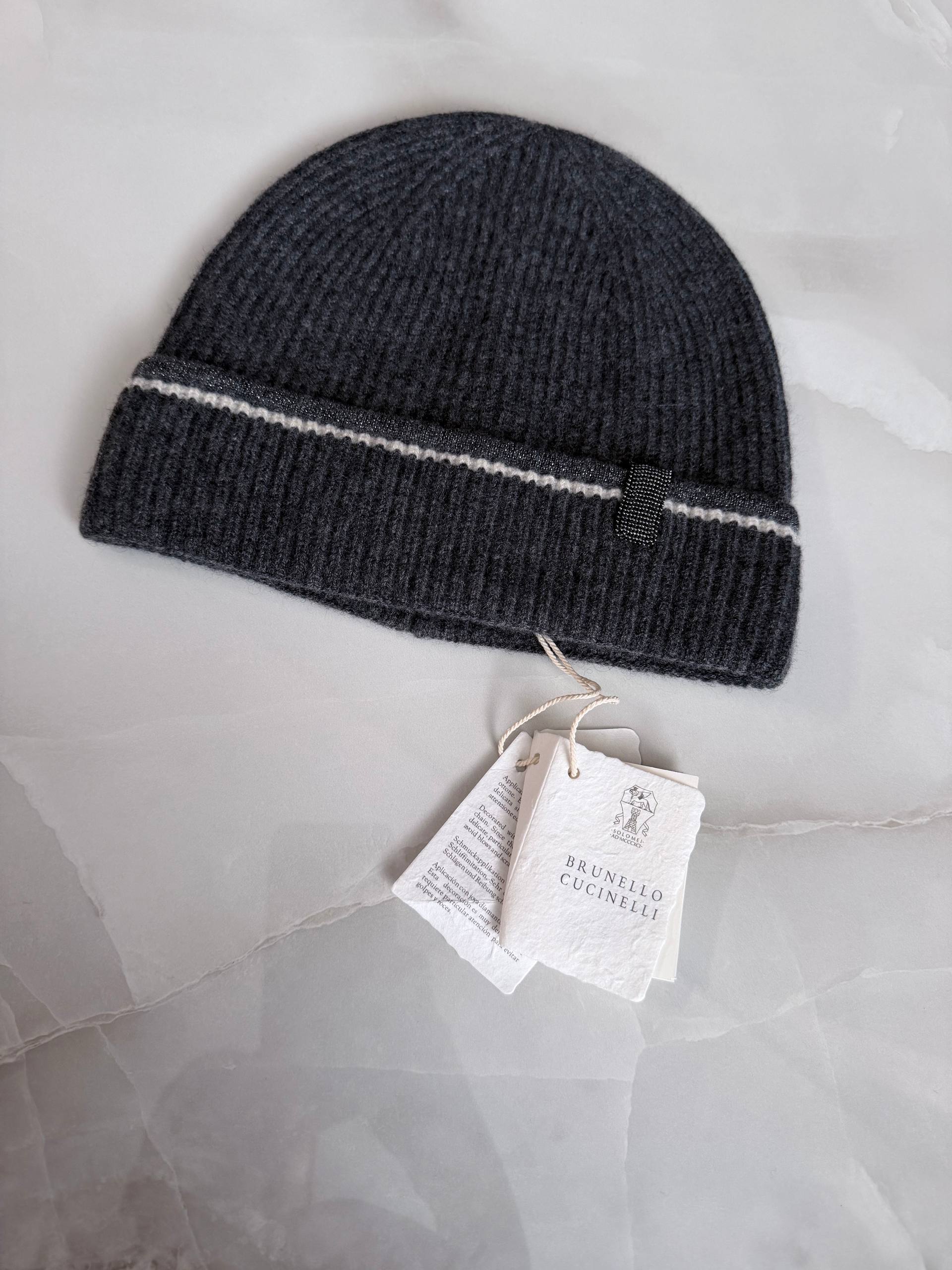 Элегантная и сдержанная вязаная шапка Brunello Cucinelli в глубокo‑антрацитовом оттенке с тонкой светлой контрастной полосой по линии отворота. Минималистичный дизайн, чистые линии и мелкие детали создают образ комфортной повседневной роскоши.