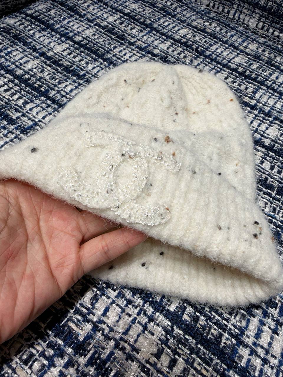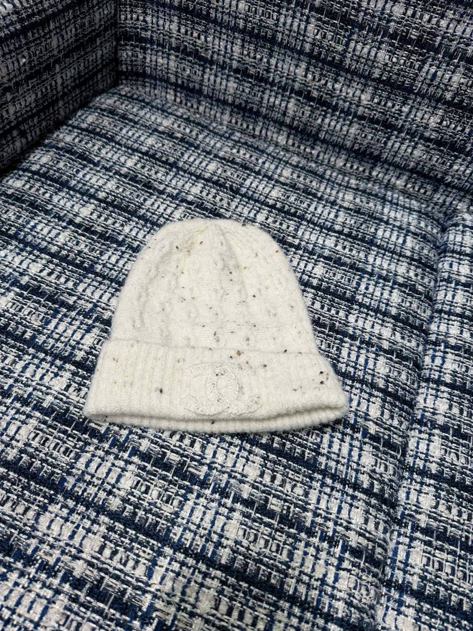 Элегантная женская вязаная шапка CHANEL в мягкой кремово‑белой гамме с декоративными вкраплениями. Универсальная модель для холодного сезона, выполненная в классическом стиле, сочетающем уютную фактуру ручной вязки и изящный фирменный акцент.