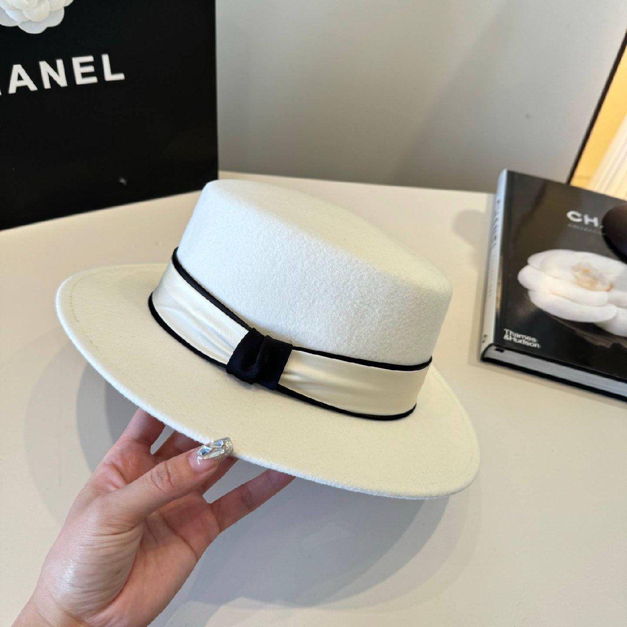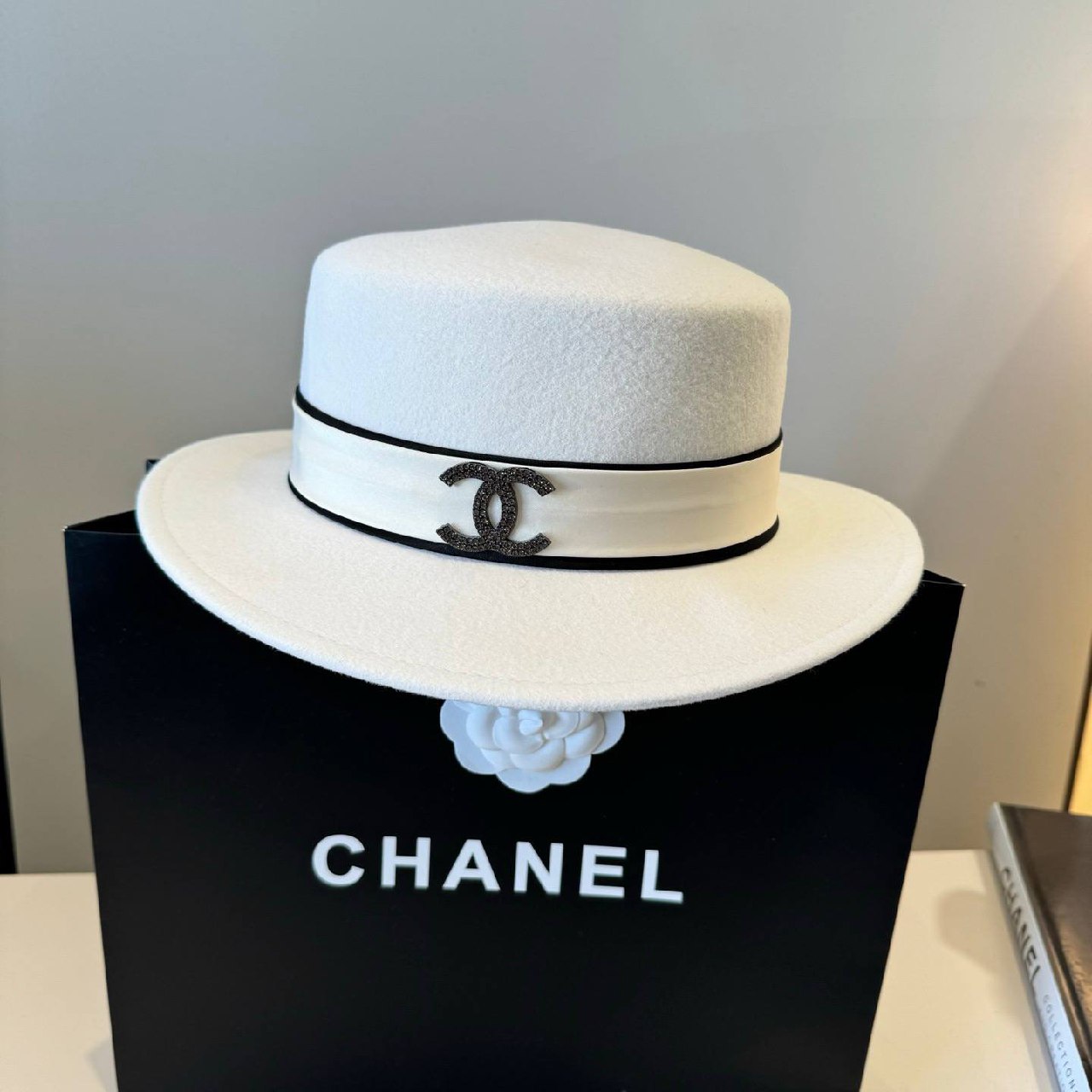 Классический цвет подчёркивает универсальность аксессуара, а лента придаёт образу выразительность и изысканность. Фирменный логотип CC, украшенный кристаллами, добавляет акцент роскоши и делает модель узнаваемой. Лаконичный силуэт с аккуратными полями идеально дополняет как повседневные, так и элегантные образы.