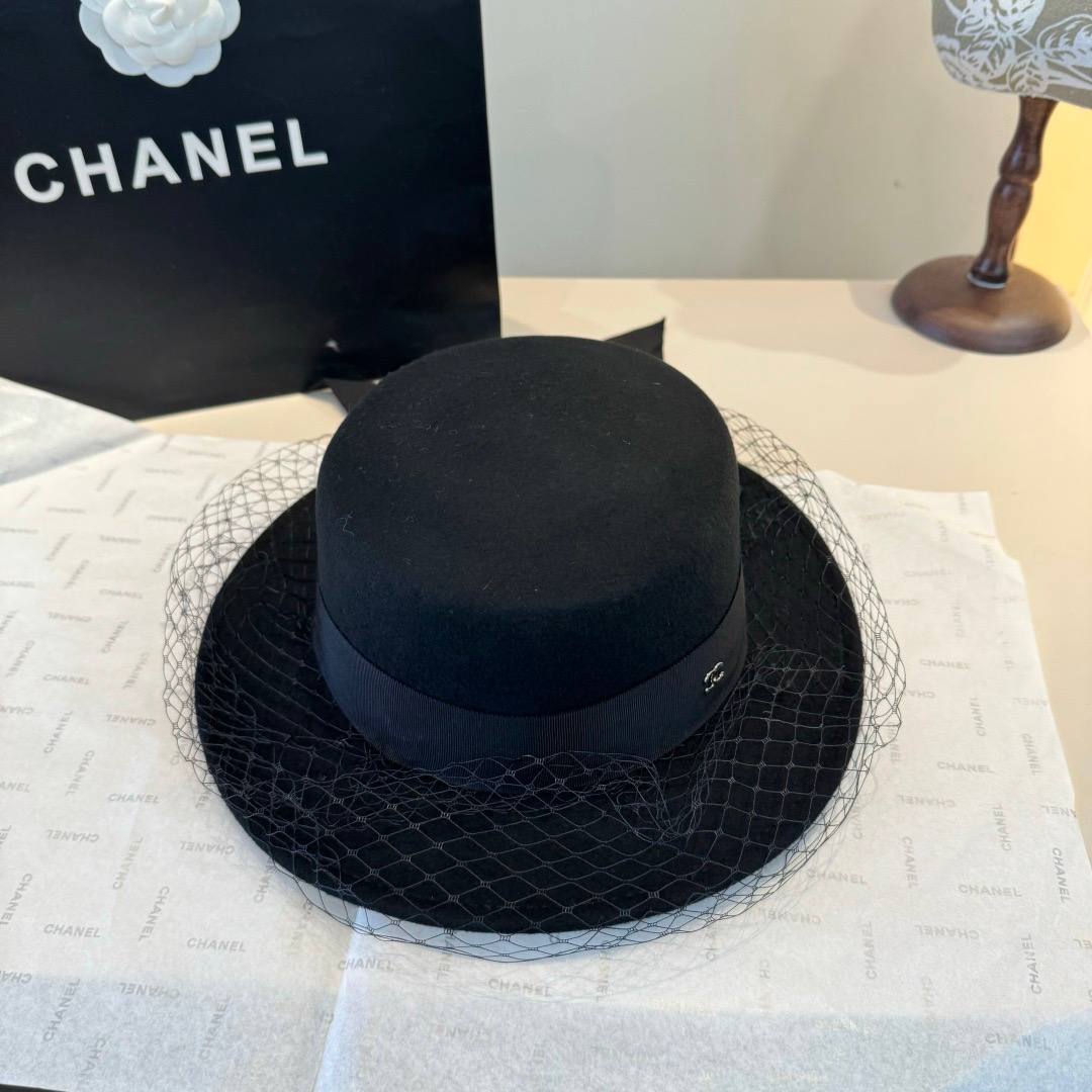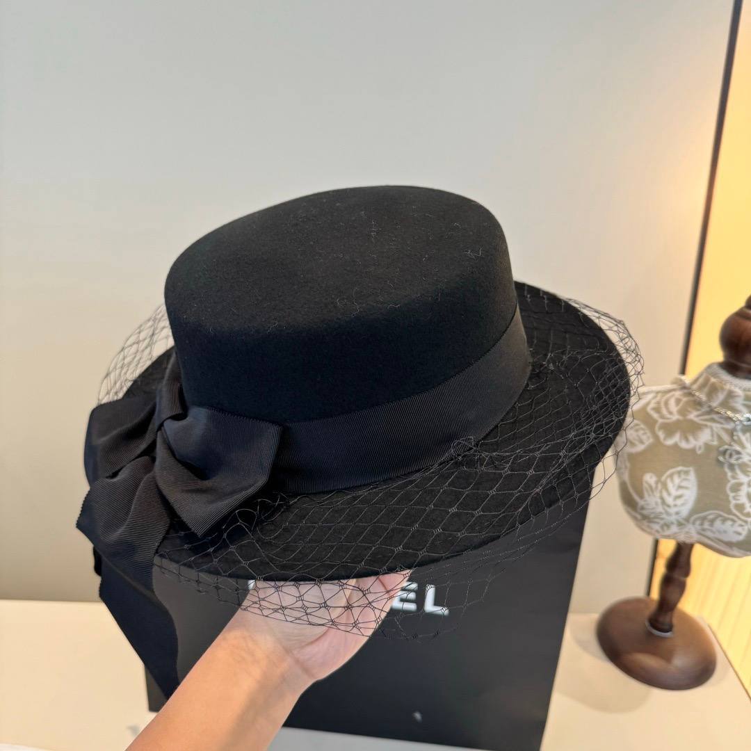 Классический силуэт дополнен широкой лентой с изящным бантом и фирменным логотипом CC, подчёркивающим статус и безупречный вкус. Лёгкая вуаль придаёт образу нотку винтажной женственности и делает шляпу особенно выразительной.