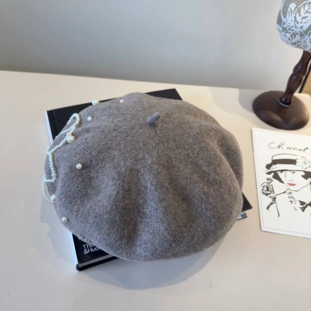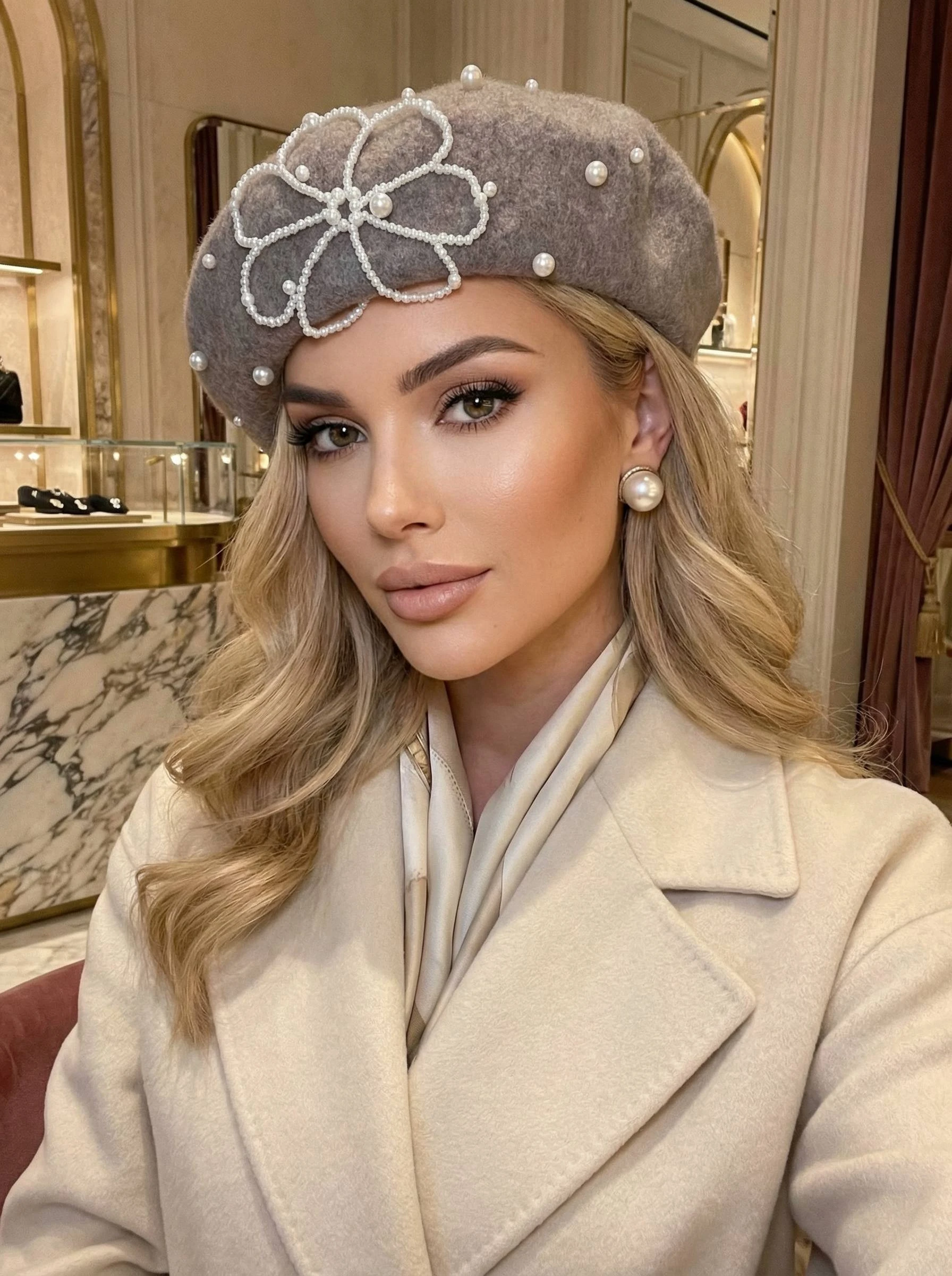 Изысканный декор из жемчужных элементов, выложенных в виде цветка, придаёт аксессуару особый шарм и женственность. Нежный серо-бежевый оттенок делает берет универсальным: он гармонично дополнит как классический образ с пальто, так и романтичный ансамбль с платьем или твидовым жакетом.