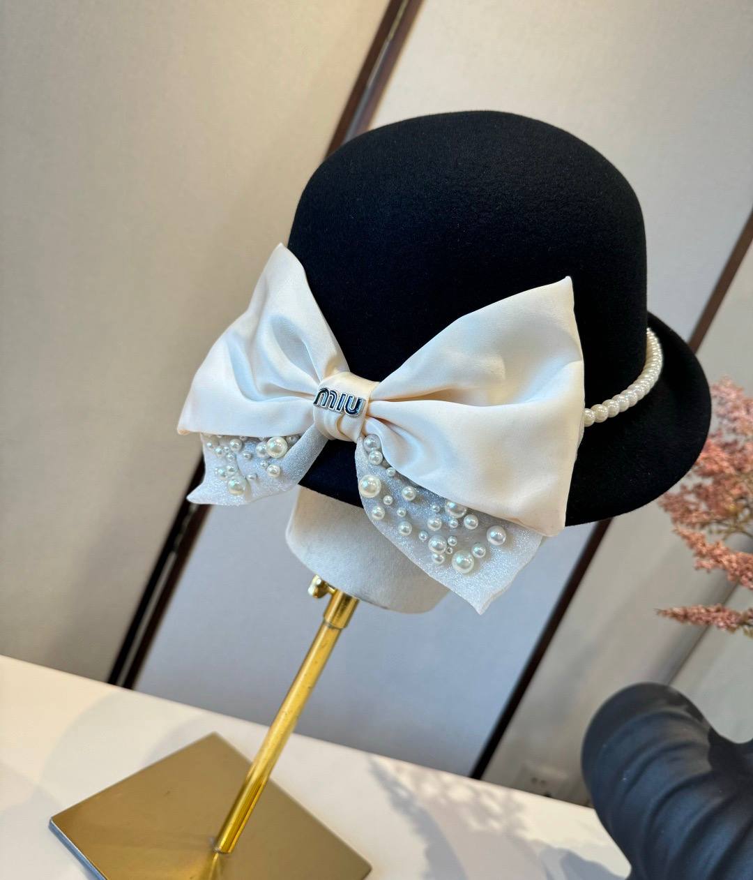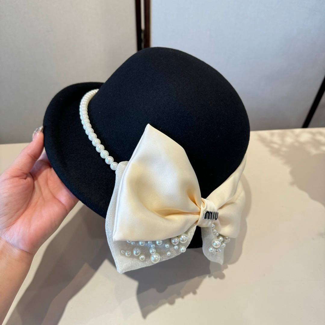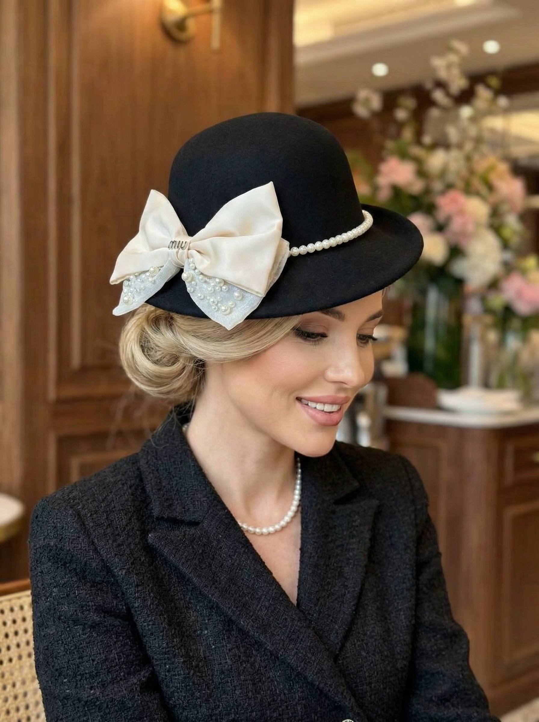 Изысканный акцент модели — контрастный бант из нежной ткани, украшенный жемчужными элементами и лаконичным логотипом MIU MIU. Декоративная отделка придаёт образу романтичность и благородный шарм, делая шляпу не просто аксессуаром, а выразительной деталью образа.