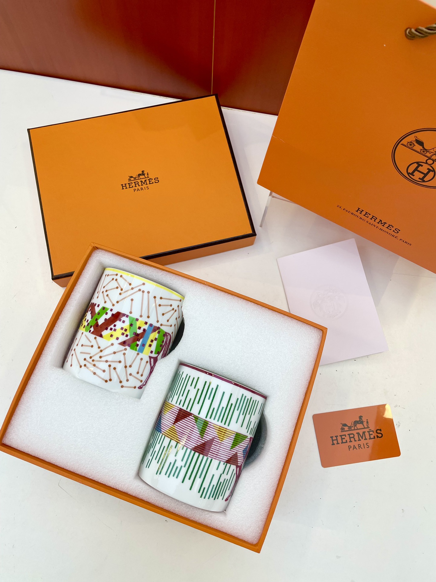 Набор из двух кружек из костяного фарфора в стиле Hermes. Тонкий, светлый фарфор с изящным рисунком: конская тема в сочетании графических и геометрических мотивов, акценты золотистого и насыщенных оттенков (зелёный, бордовый, жёлтый). Каждая кружка аккуратно оформлена тонким ободком и удобной изогнутой ручкой.