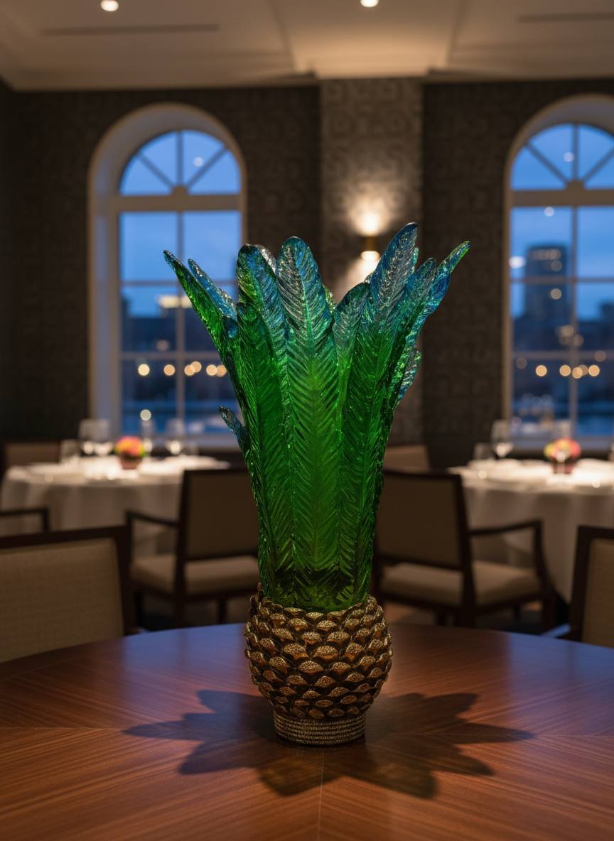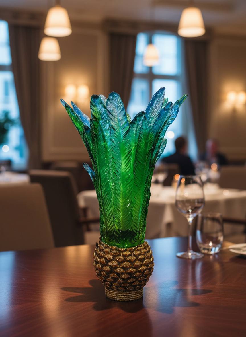 Ваза «Ананас» Daum, высота 30 см — декоративный арт‑объект из хрусталя, который сразу притягивает взгляд. Изящный цилиндрический «ствол» выполнен в виде высоких, вытянутых листьев с рельефной текстурой: переходы зелёного в бирюзово‑синие тона создают эффект перелива и глубины. Основание стилизовано под шишковатую кору ананаса — золотисто‑бронзовая фактура подчёркивает тропическую тему и придаёт изделию монументальный, но в то же время изящный вид.
