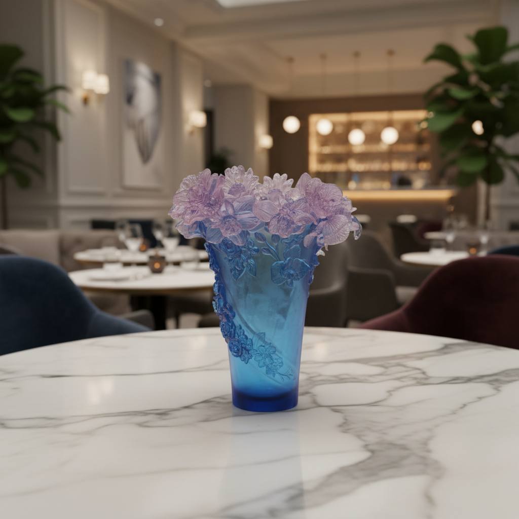 Ваза Daum — словно застывший букет, воплощённый в кристалле. Верхний край оформлен в виде объёмных цветочных бутонов и лепестков нежно-лилового оттенка, прозрачных и хрупких, будто тончайший хрусталь поймал рассветный свет. Тело вазы выполнено в глубоких синих тонах с мягким градиентом, переходящим от насыщенного сапфира внизу к более светлому аквамарину у верха; матово-полупрозрачная поверхность подчёркивает глубину цвета и придаёт ощущение ледяной прохлады. По боку — декоративные растительные мотивы в рельефе: изящные веточки и листья, словно обвивающие сосуд, добавляют динамики и тактильного интереса. Контраст между гладкостью корня вазы и детализированными лепестками создаёт ощущение живого цветка, застывшего в момент расцвета. Свет, проходящий через кристаллические элементы, даёт мягкие переливы и радугу бликов, подчёркивая высокую оптику материала. По технике исполнение напоминает знаменитую pâte de verre — точную работу с цветом и прозрачностью, характерную для мастерских Daum. Такая ваза станет центром внимания в интерьере: на столе, консоли или под отдельной подсветкой она будет играть оттенками и создавать атмосферу галерейной утончённости.