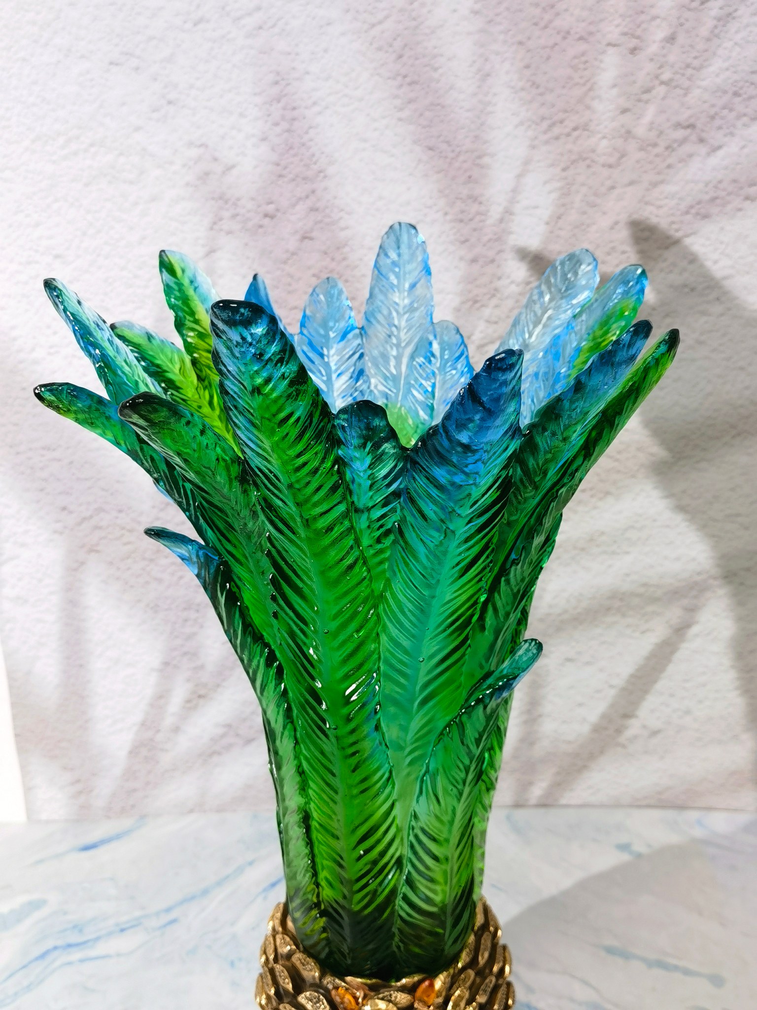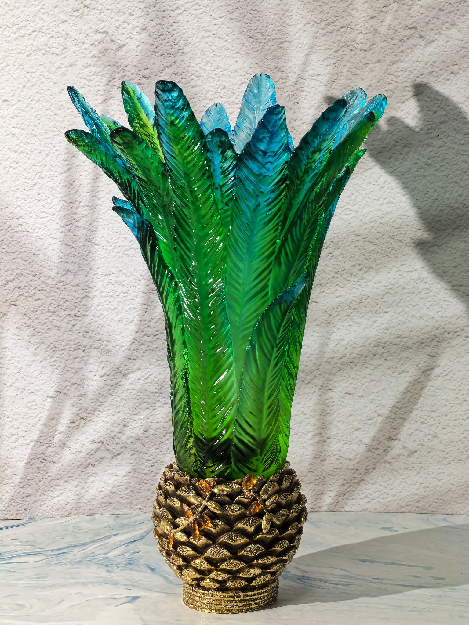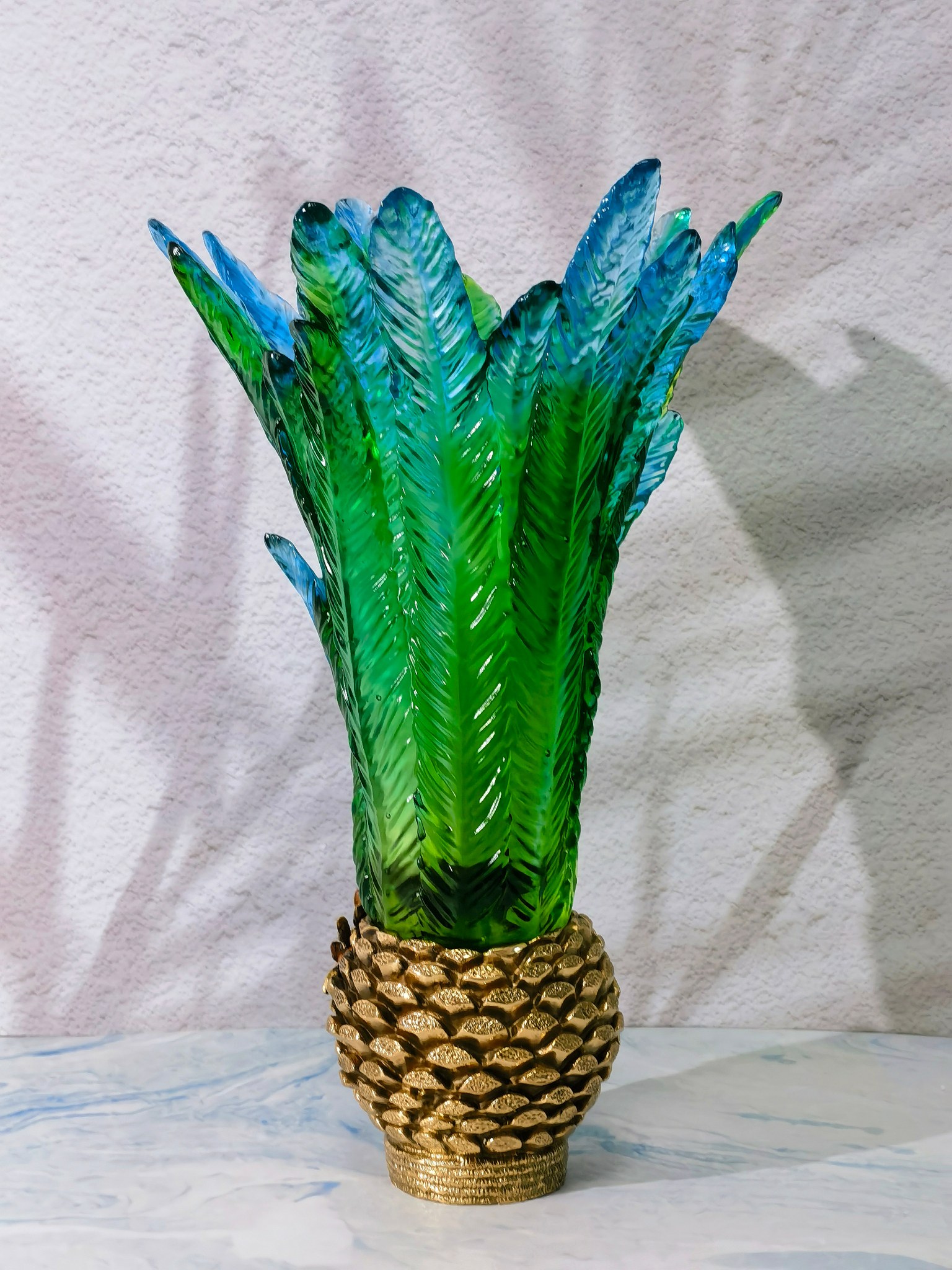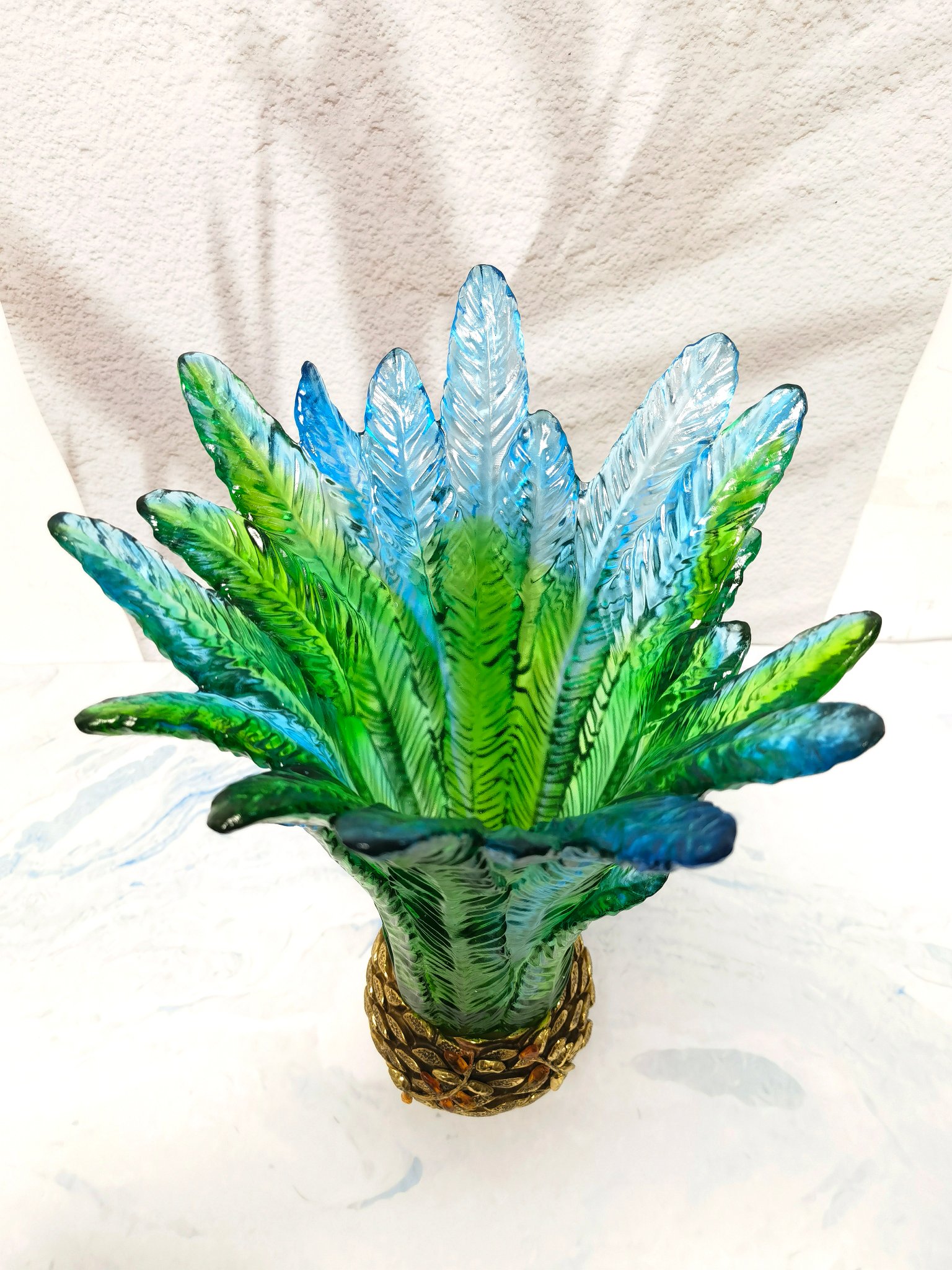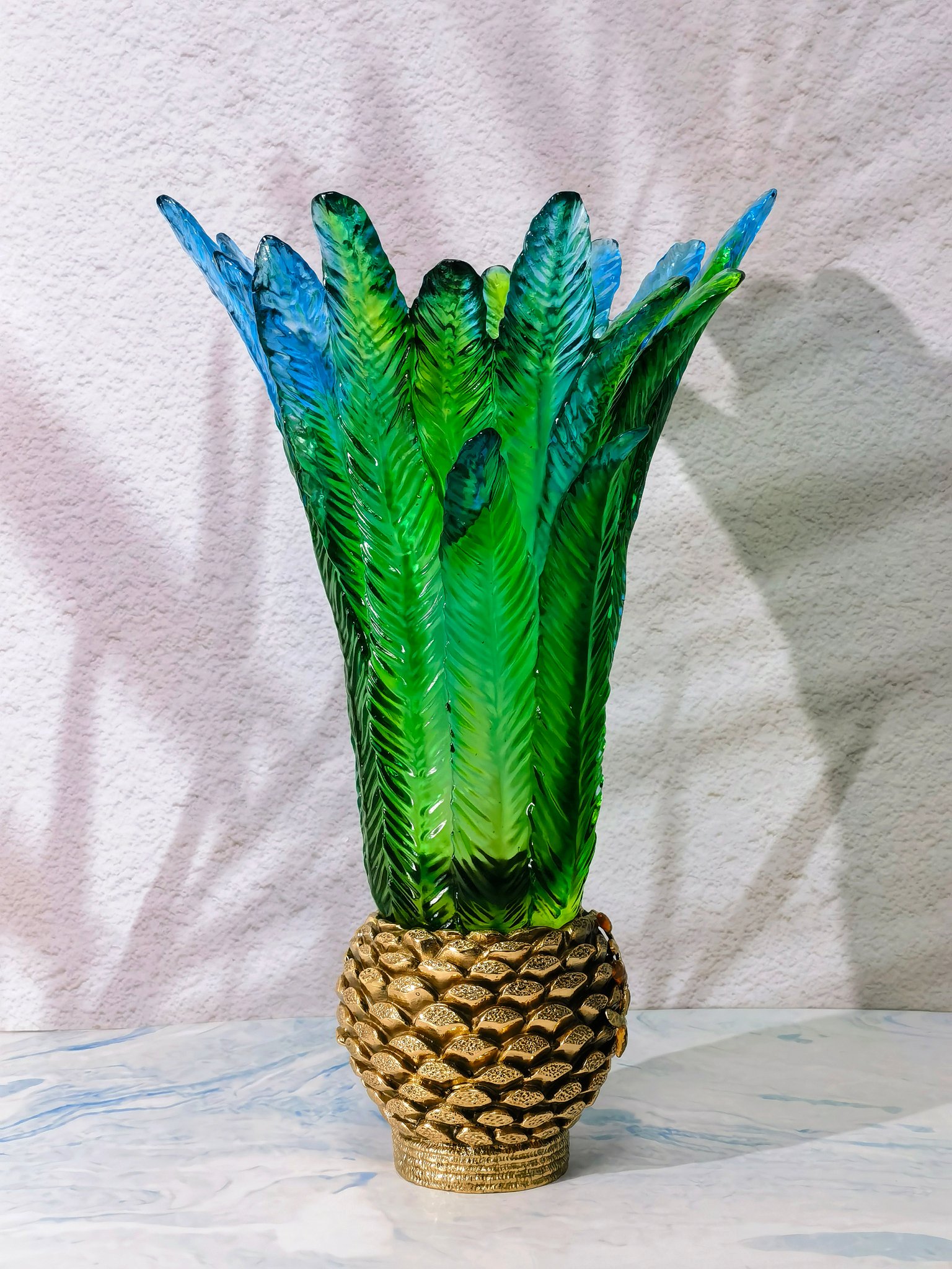 Хрустальная ваза Daum в форме ананаса является замечательным произведением искусства, которое прекрасно передает атмосферу тропиков. Тонкий градиент синего и зеленого цветов создает эффект глубины и объема, а многослойное наложение придаёт вазе особую выразительность.