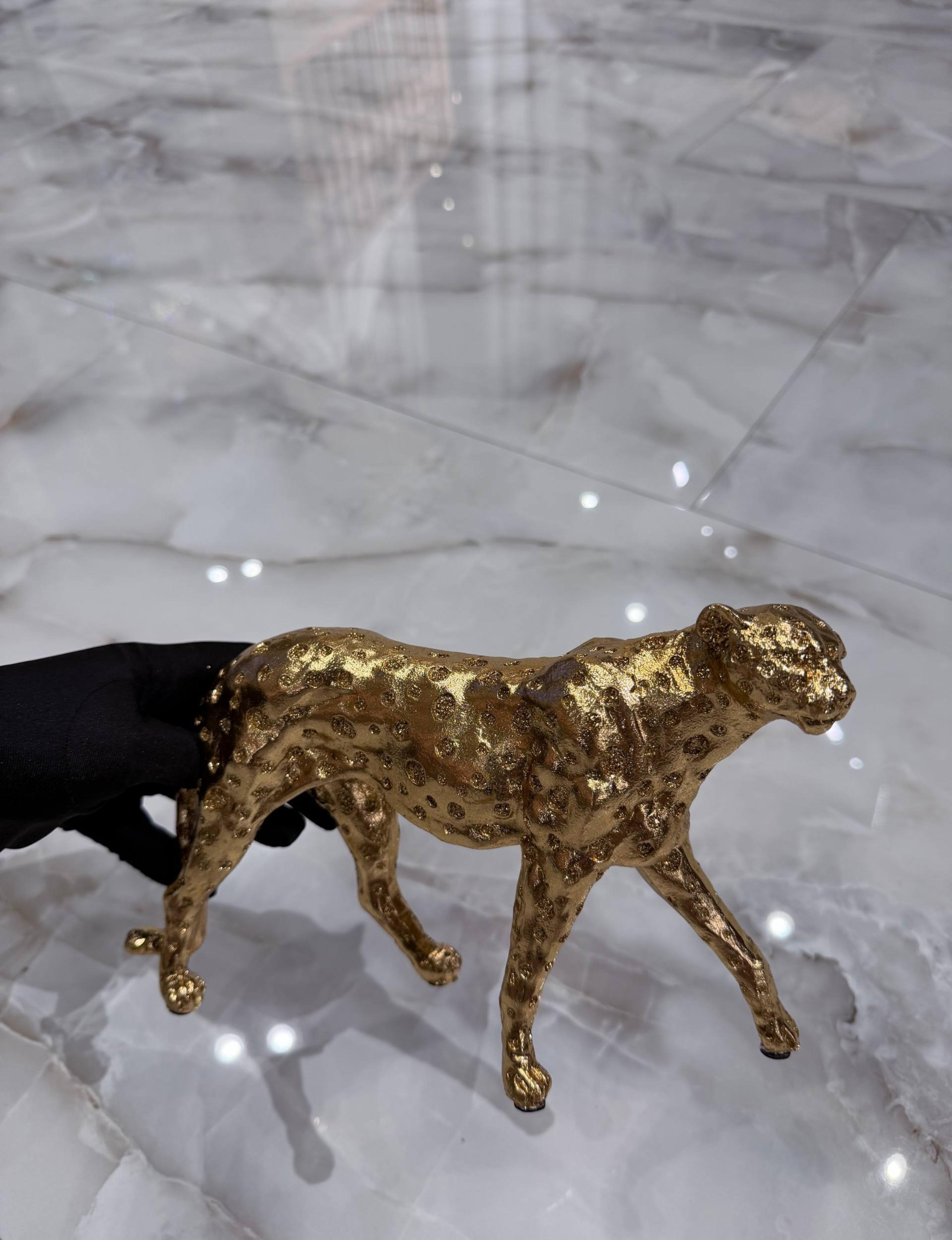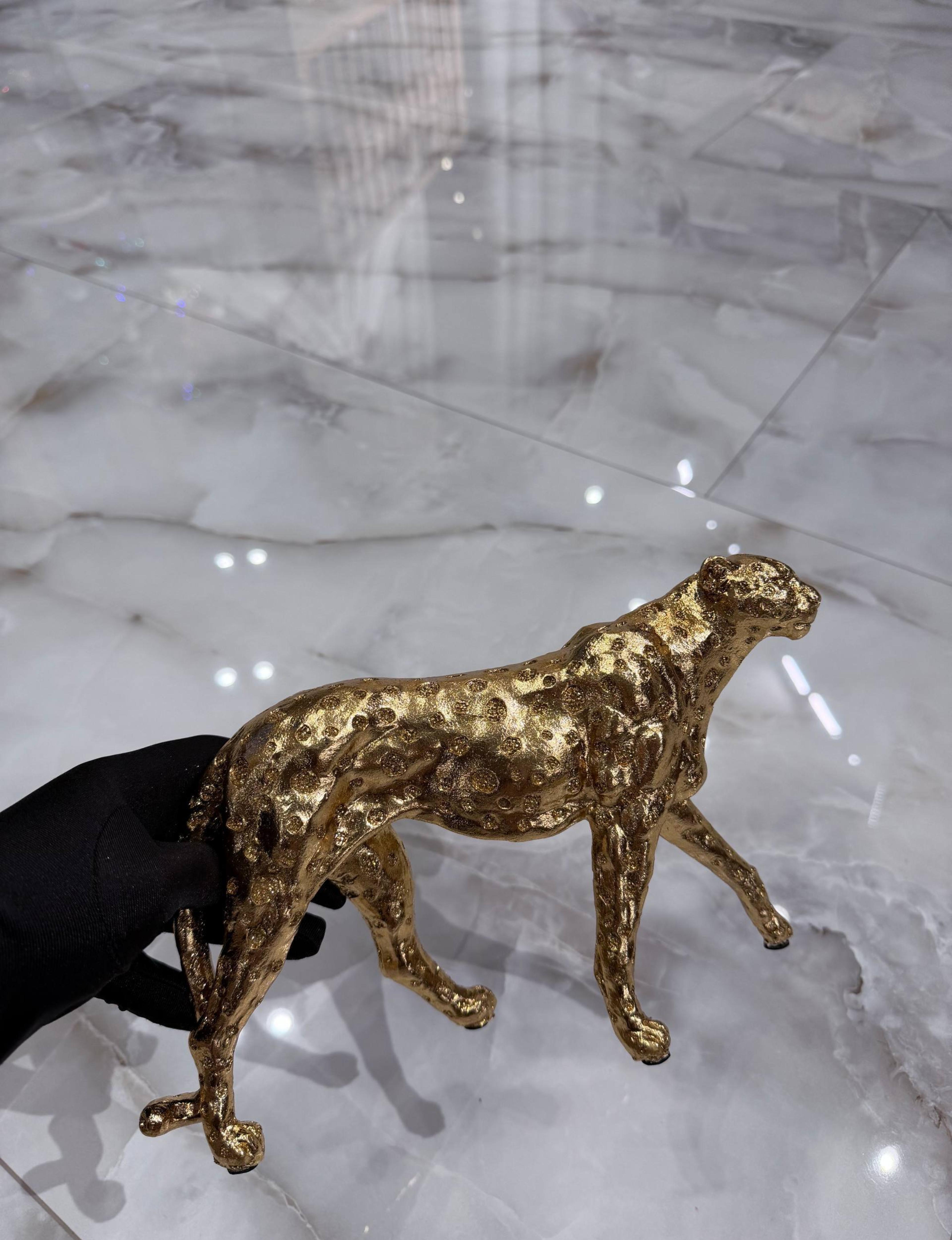 Статуэтка гепарда выполнена из прочной смолы и покрыта золотистой металлической краской с лёгкой патиной, подчёркивающей рельеф и фактуру пятен. Минималистичная, но выразительная форма передаёт грациозность хищника и добавляет интерьеру элегантности. Подходит для гостиной, спальни, кабинета или как оригинальный подарок.
