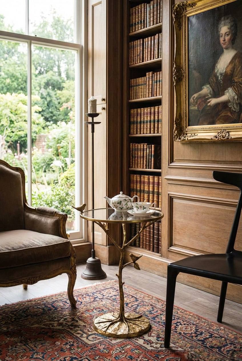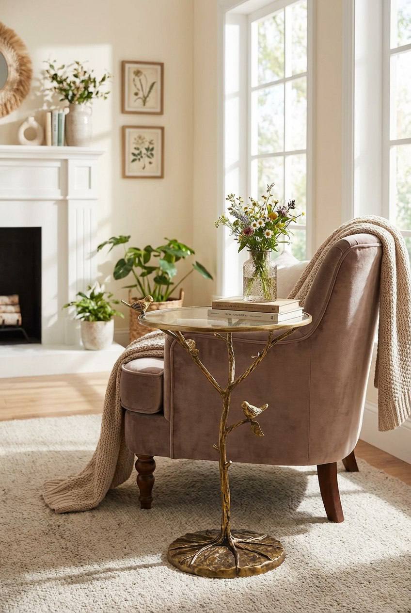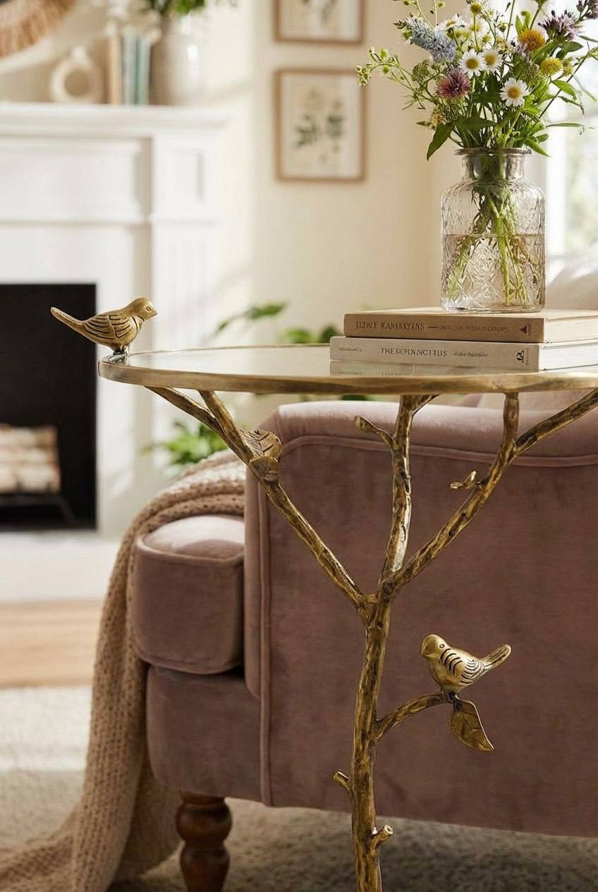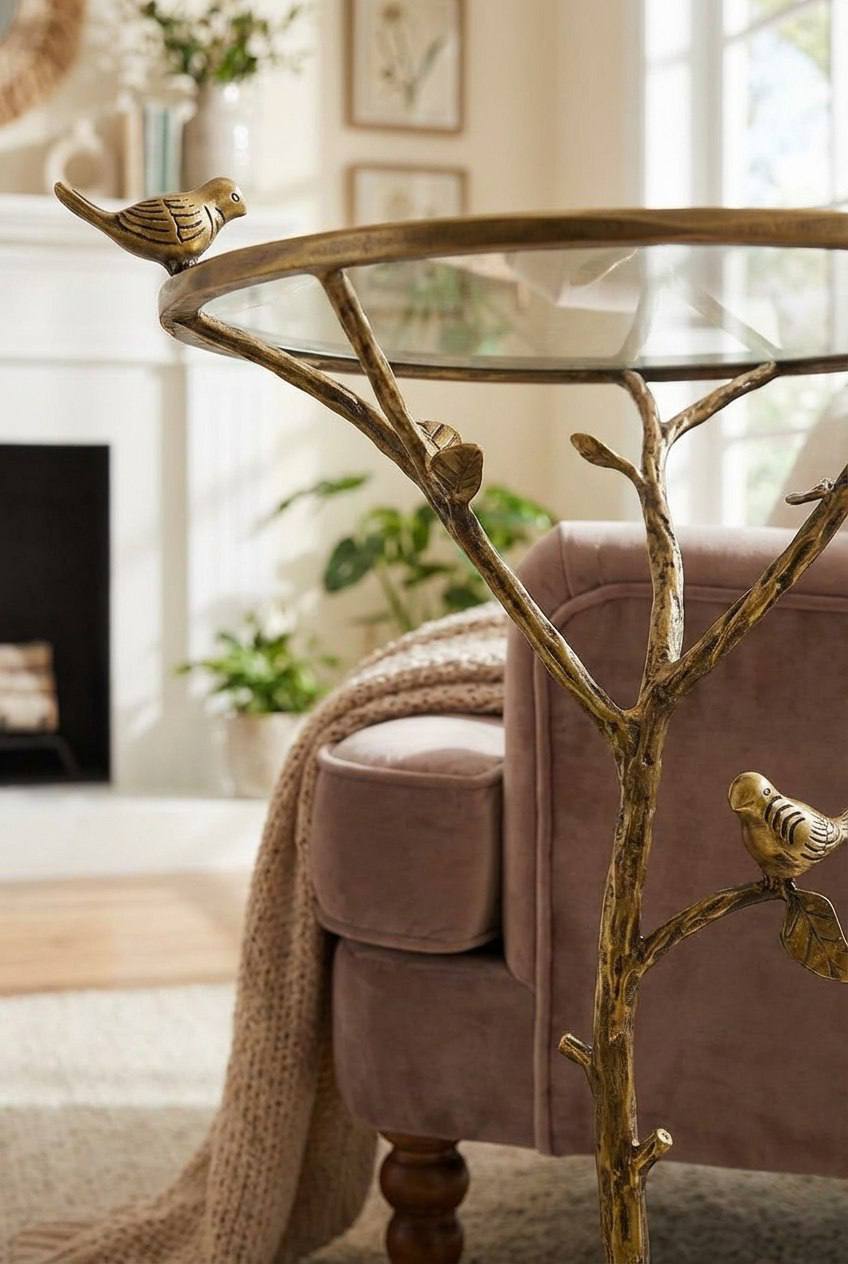 Уникальный акцентный столик в виде ветки с фигурной птицей — сочетание художественной латунной отделки и прозрачной стеклянной столешницы. Придаст интерьеру теплоту и изящность: отлично смотрится в гостиной, у камина, рядом с креслом или как прикроватная тумбочка.