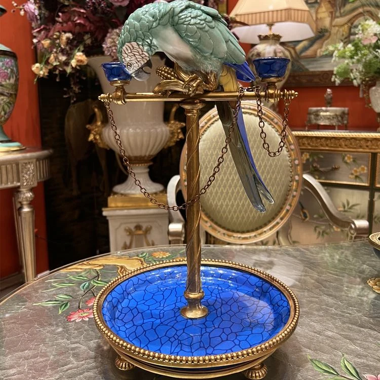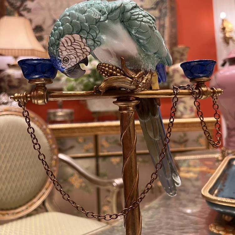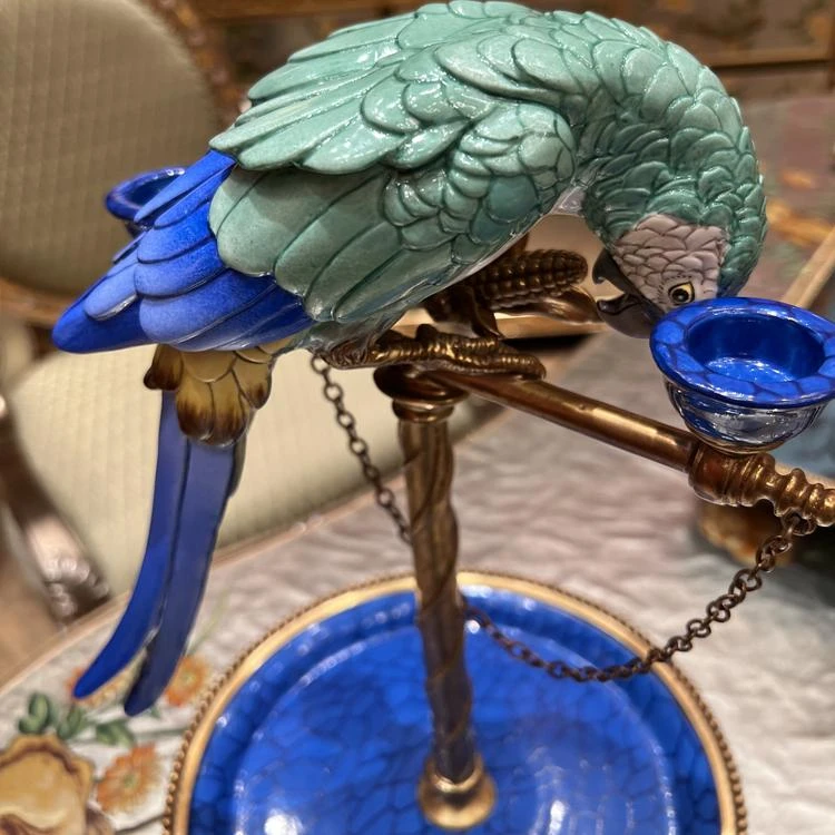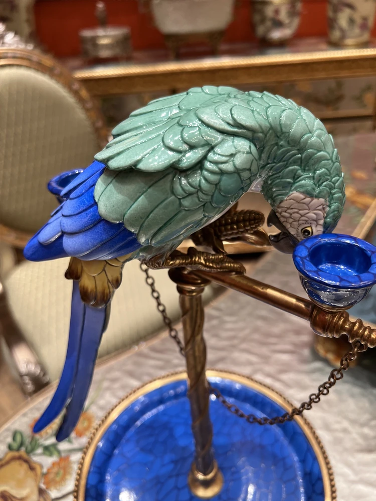 Винтажный подсвечник в виде попугая из меди и керамики — прекрасный элемент для любителей эстетики.