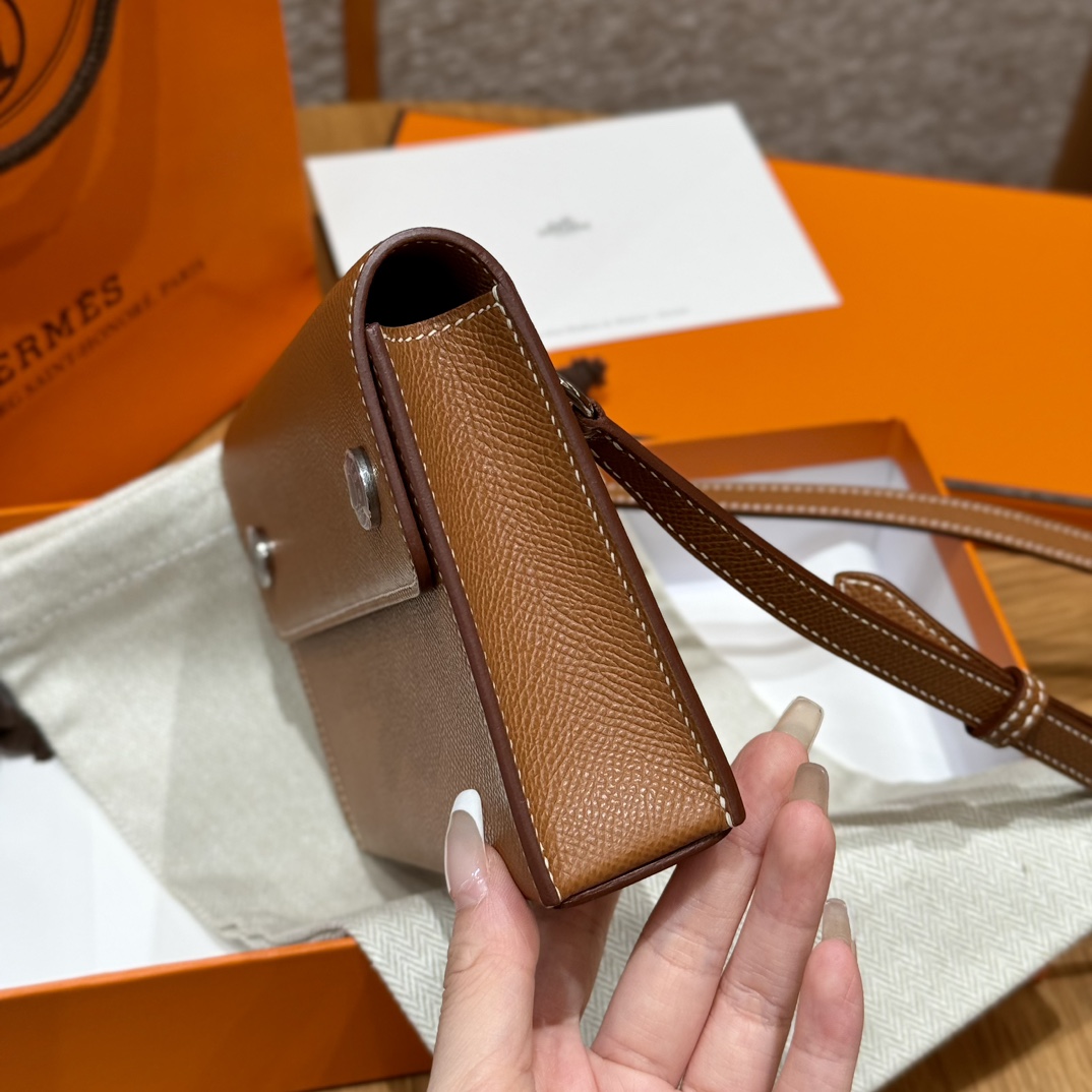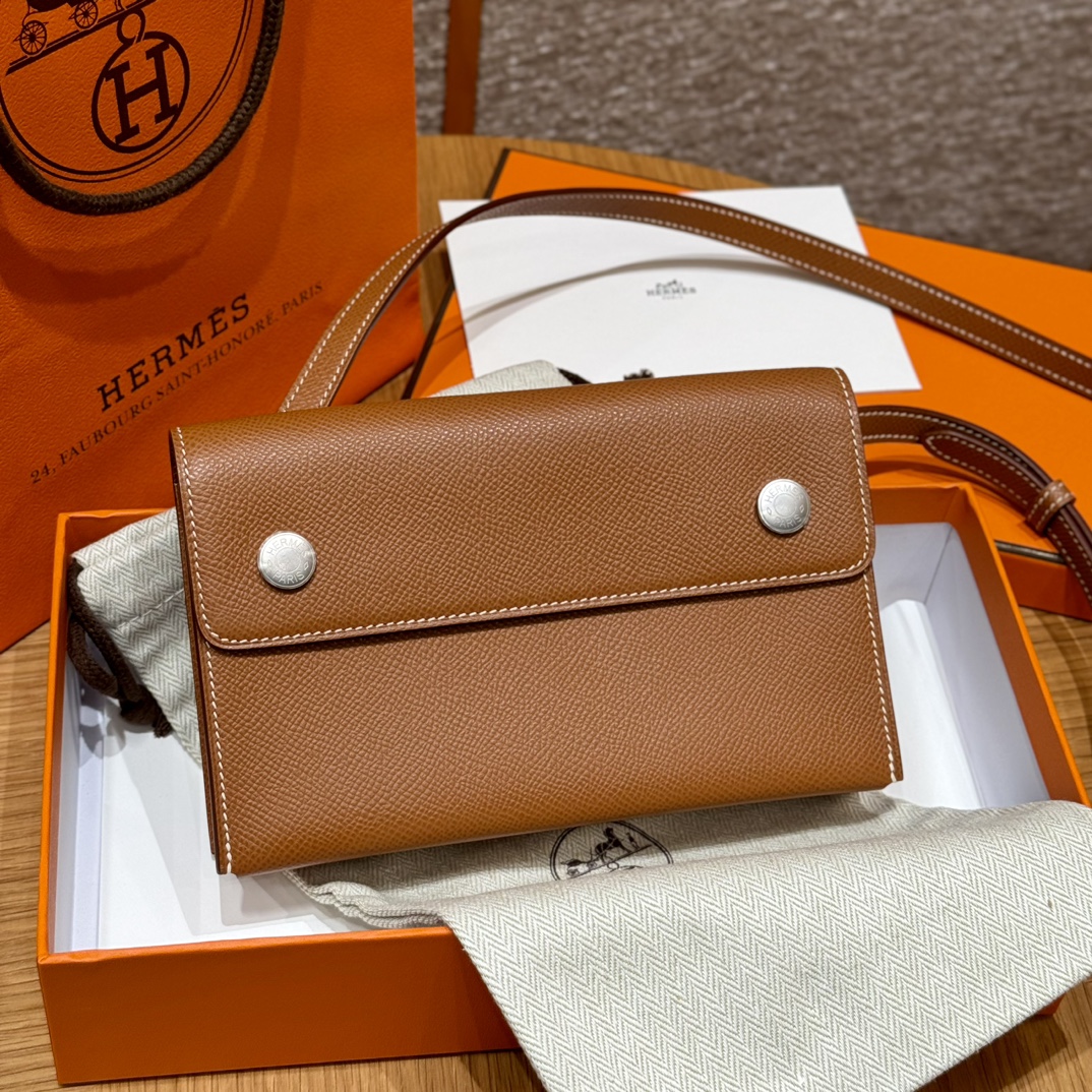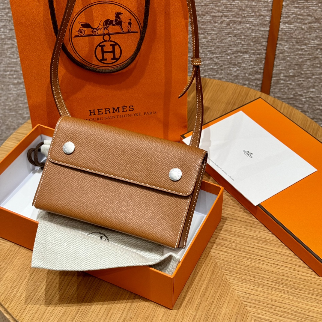 Минималистичный дизайн подчеркивается двумя серебряными кнопками с гравировкой Hermes Paris, которые надежно фиксируют клапан кошелька. Регулируемый ремешок обеспечивает удобство носки на плече или через плечо. Кошелек представлен в универсальном черном цвете, который легко сочетается с любым образом — от делового до вечернего.