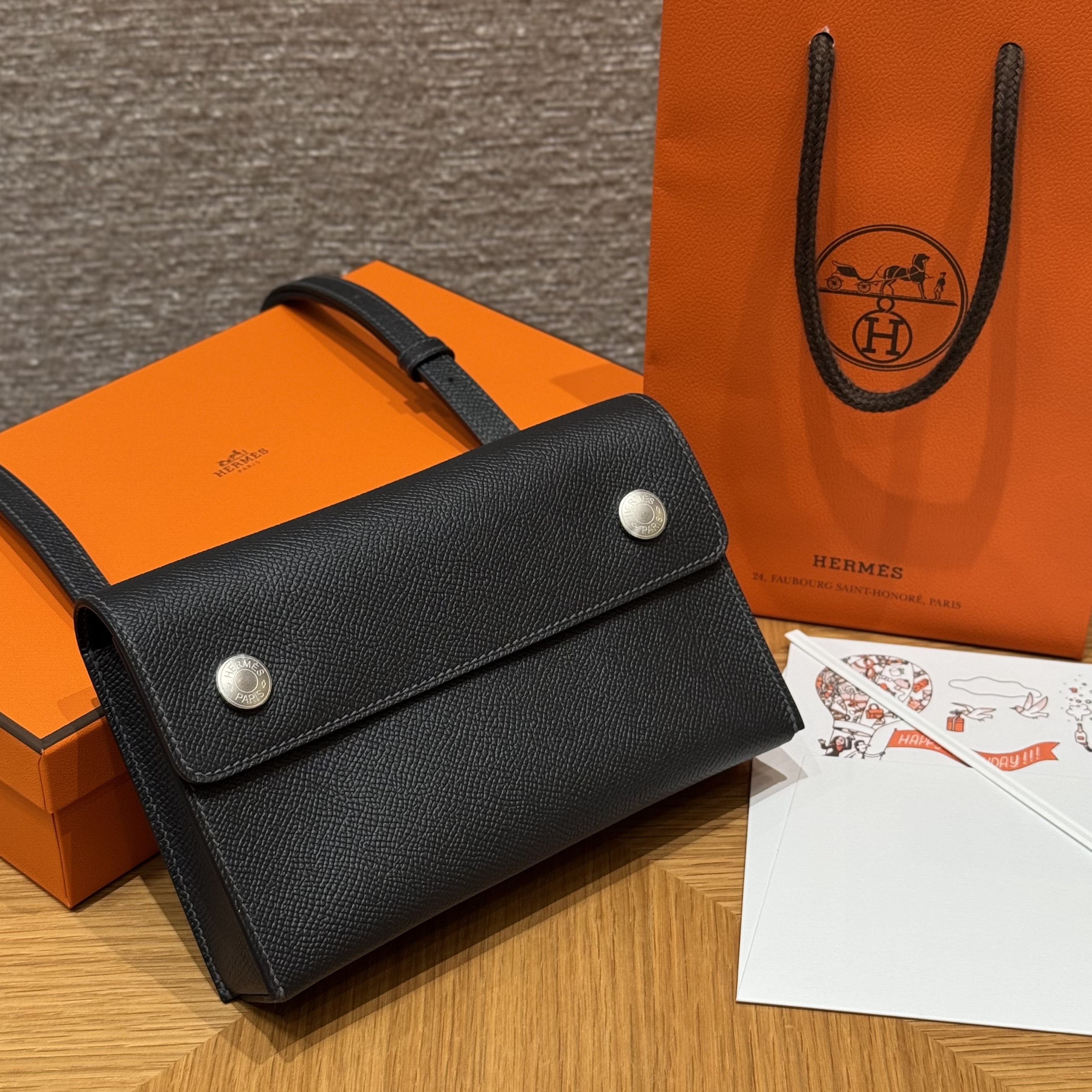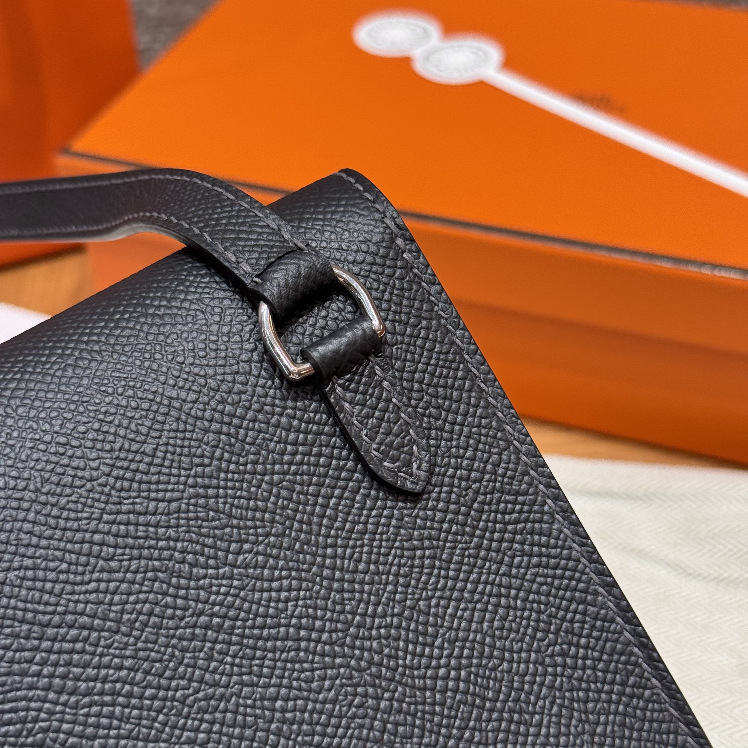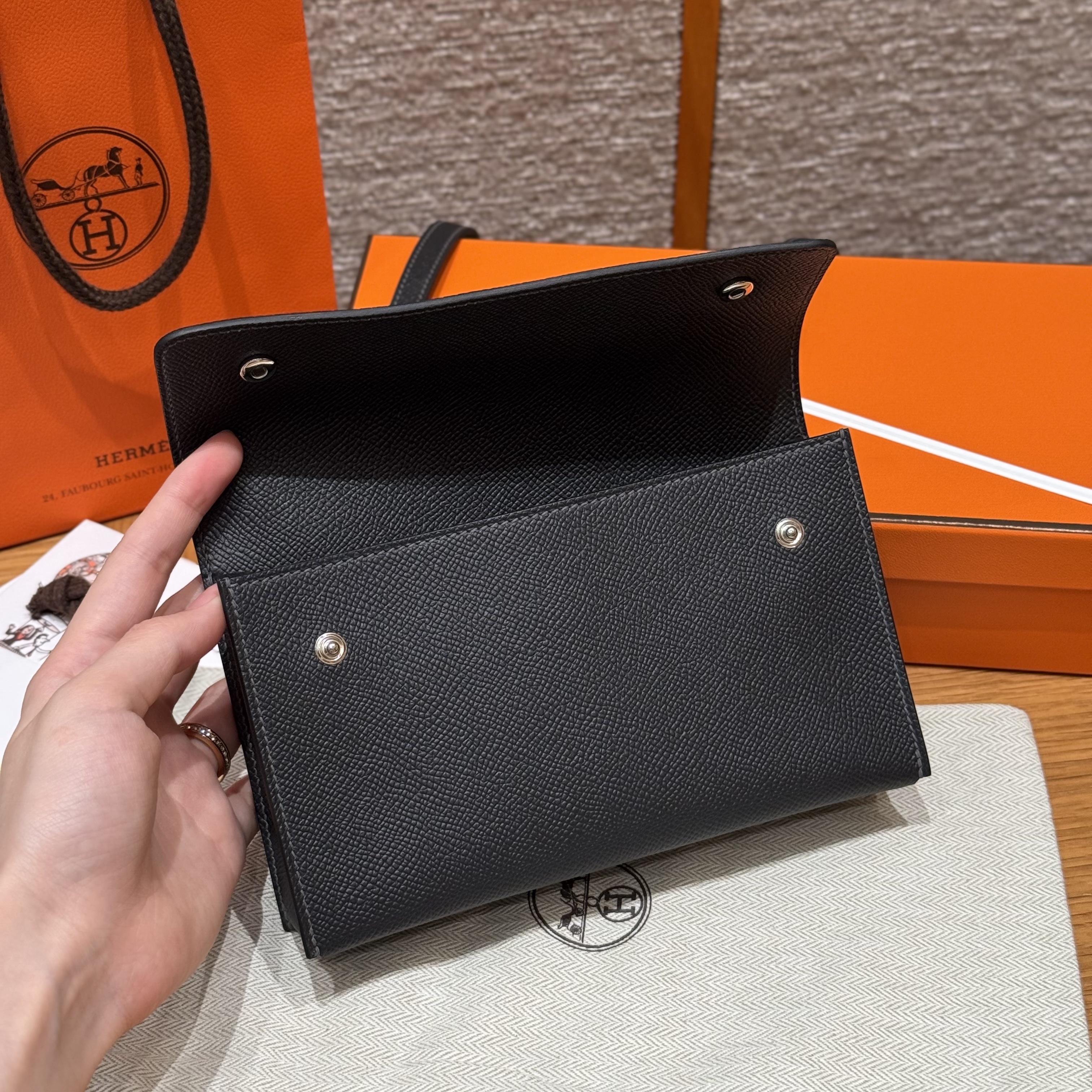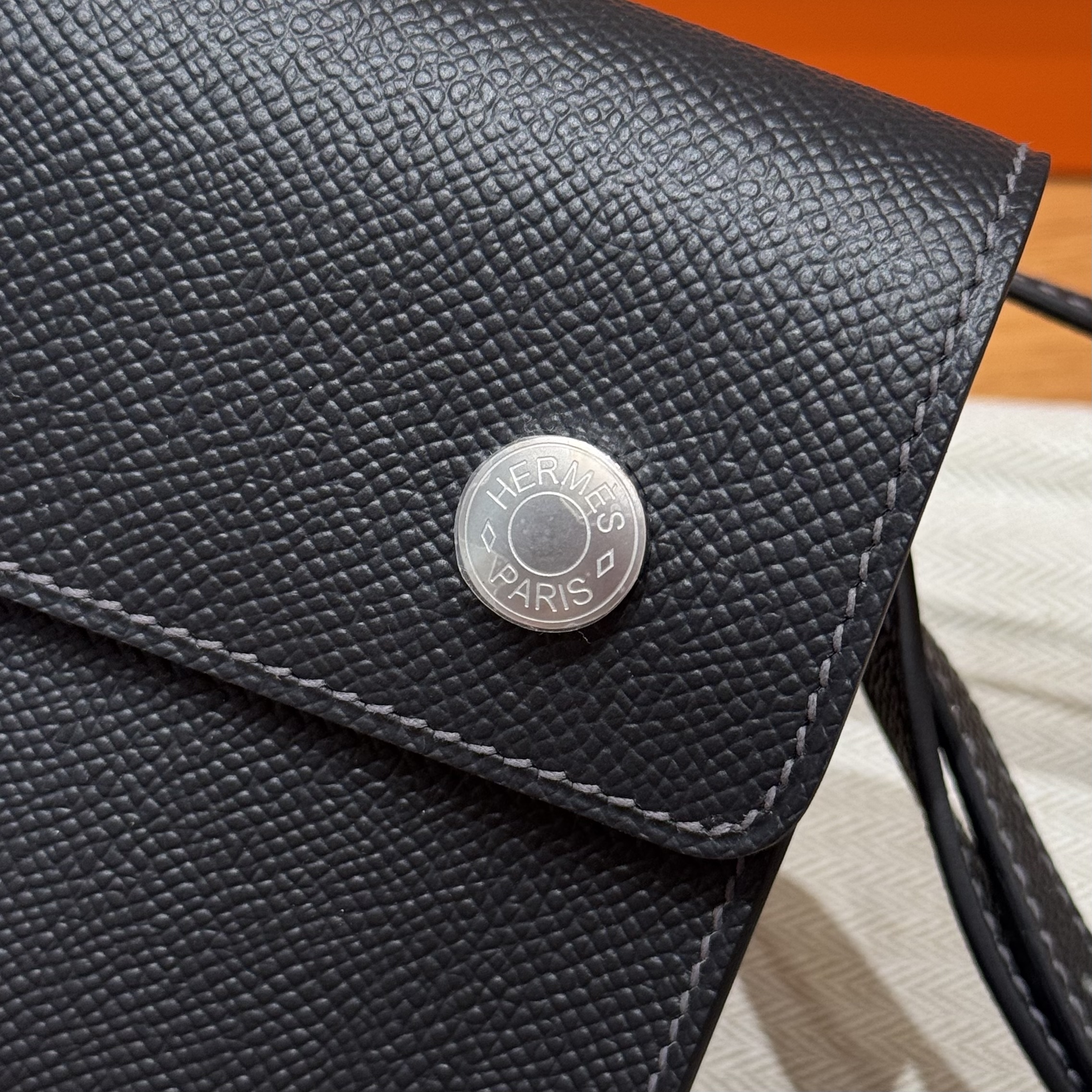 Минималистичный дизайн подчеркивается двумя серебряными кнопками с гравировкой Hermes Paris, которые надежно фиксируют клапан кошелька. Регулируемый ремешок обеспечивает удобство носки на плече или через плечо. Кошелек представлен в универсальном черном цвете, который легко сочетается с любым образом — от делового до вечернего.