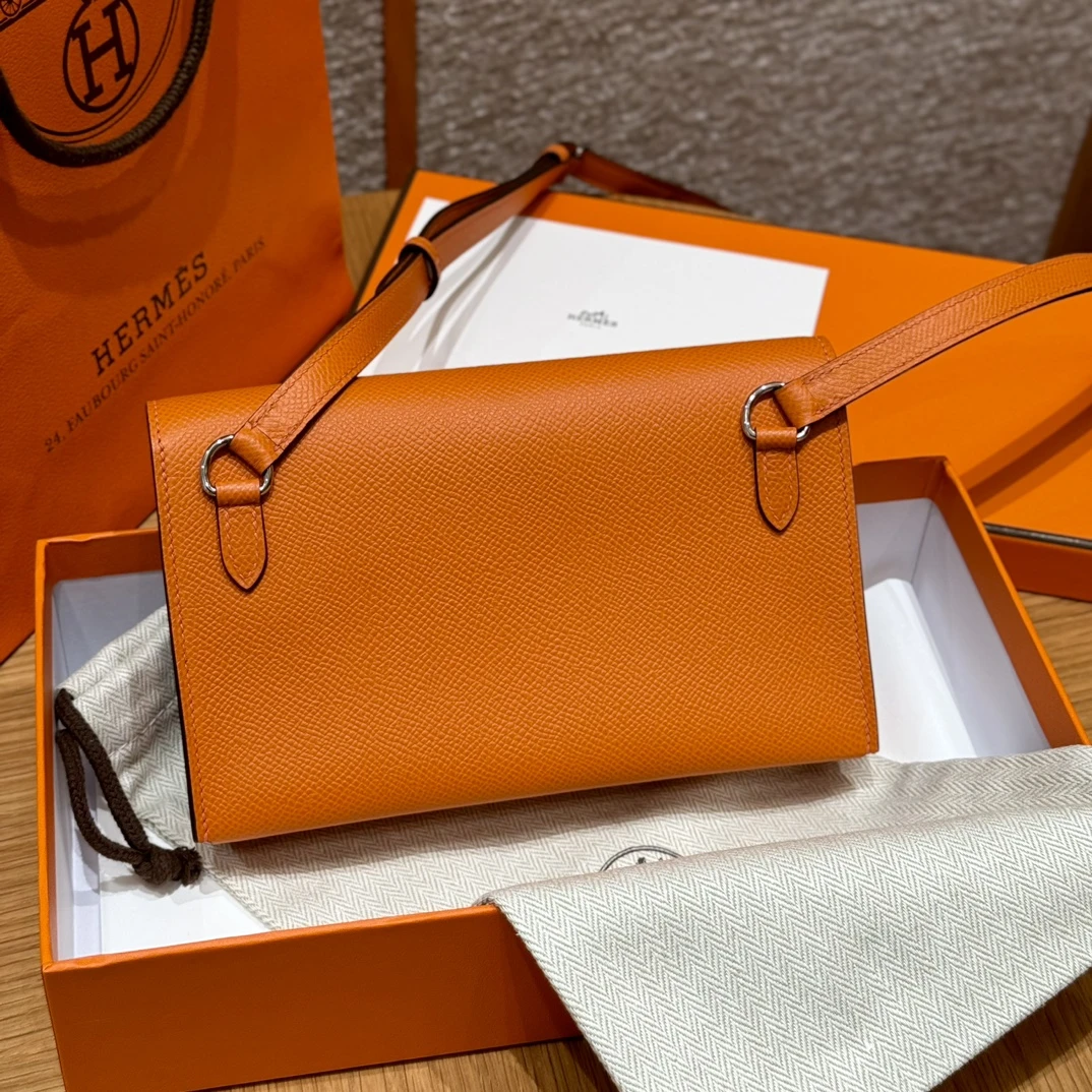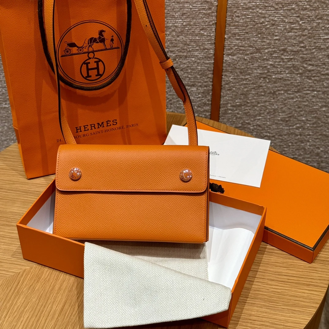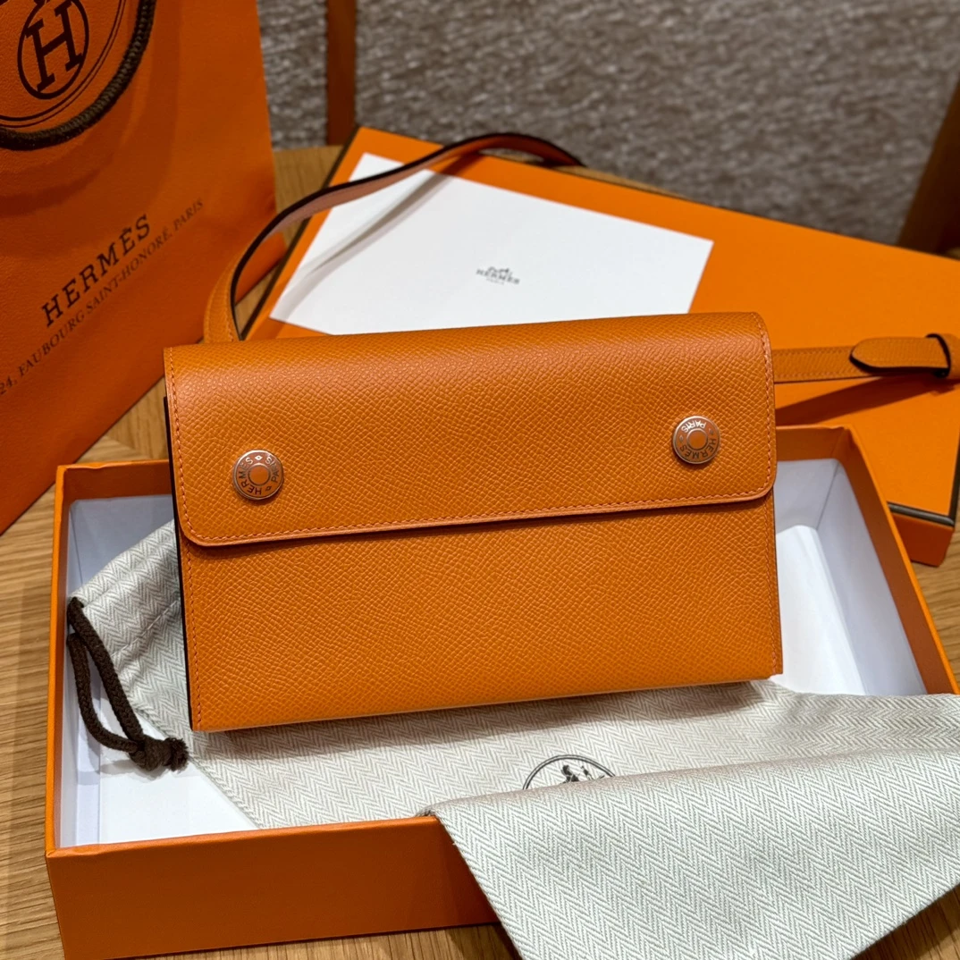 Минималистичный дизайн подчеркивается двумя серебряными кнопками с гравировкой Hermes Paris, которые надежно фиксируют клапан кошелька. Регулируемый ремешок обеспечивает удобство носки на плече или через плечо. Кошелек представлен в универсальном черном цвете, который легко сочетается с любым образом — от делового до вечернего.