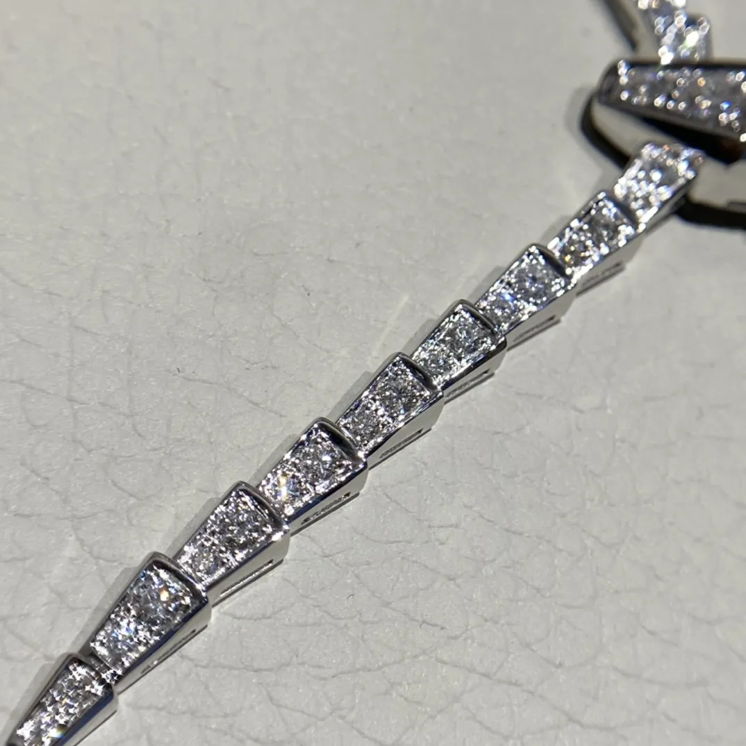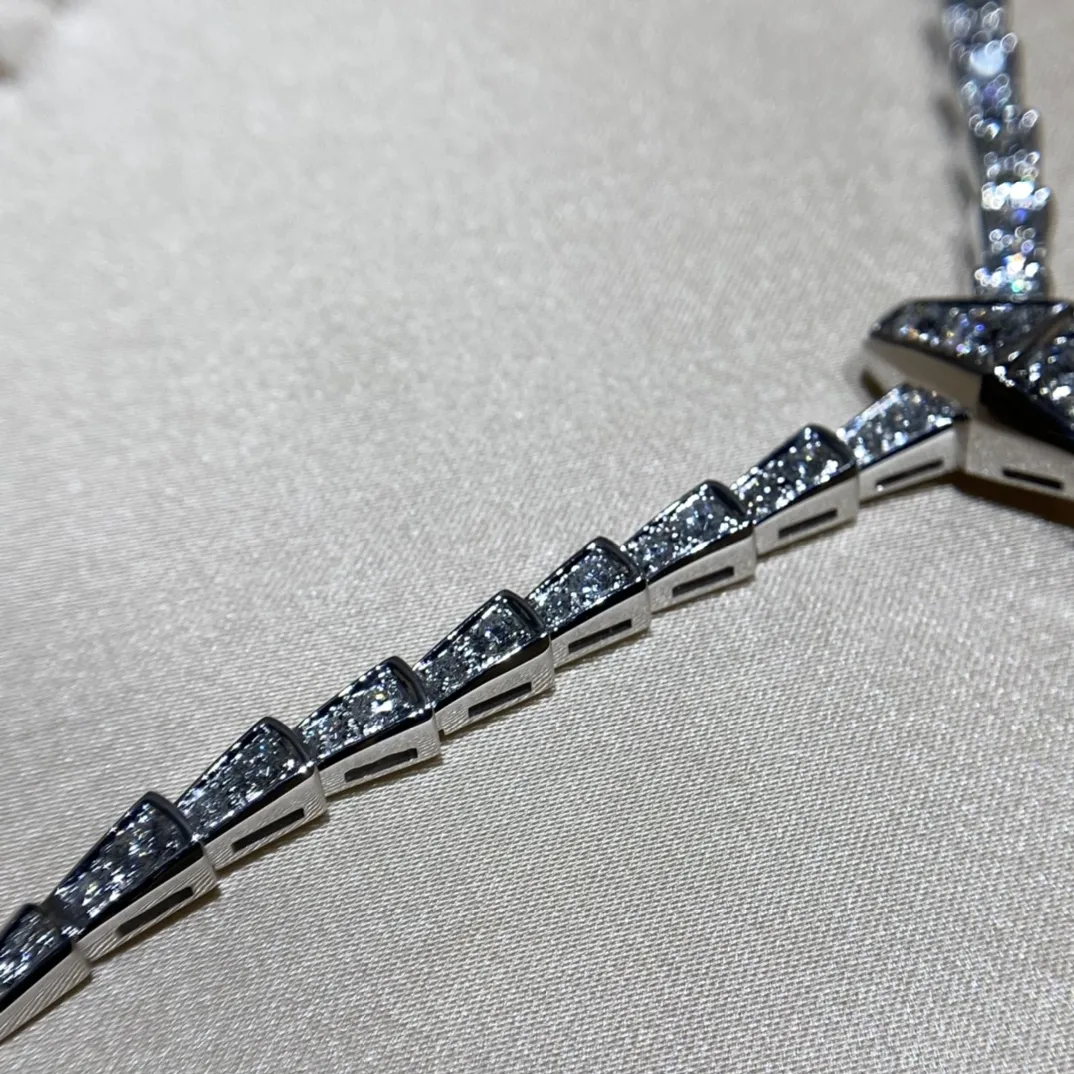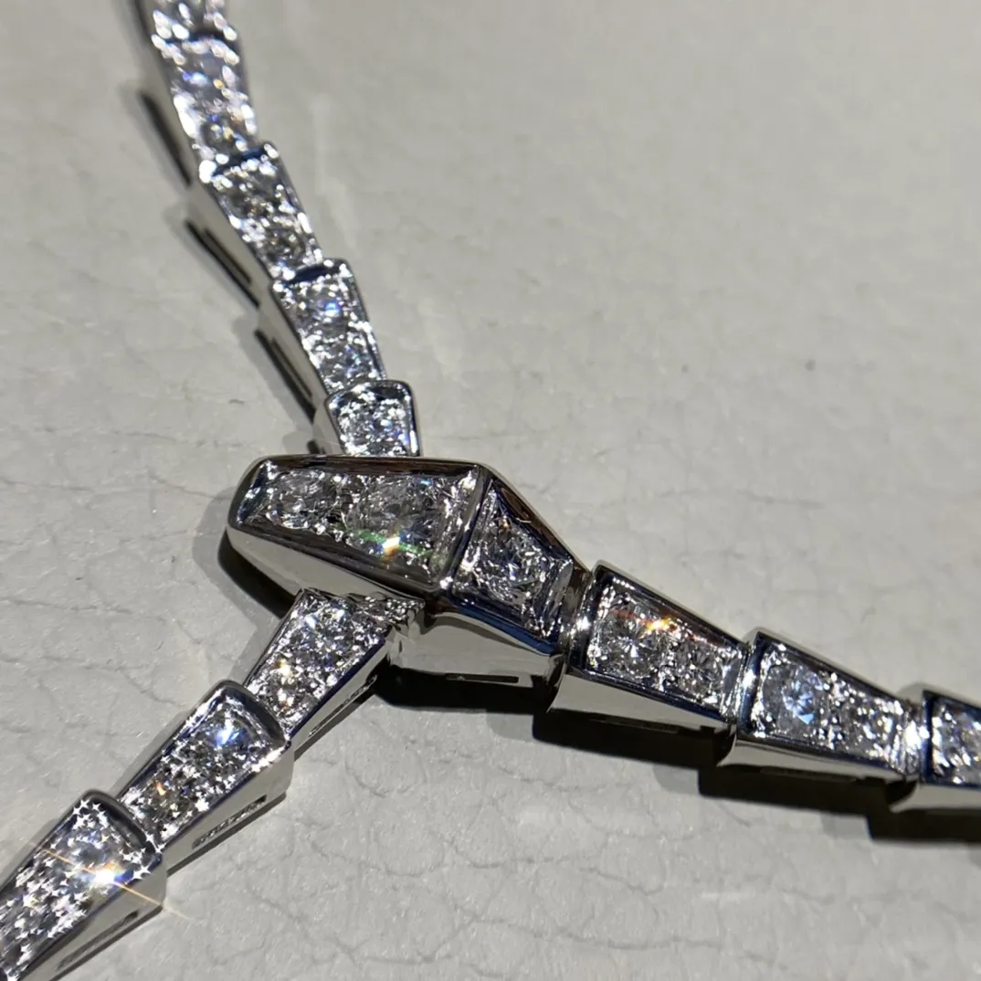 Колье Serpenti Viper из 18-каратного белого золота и бриллиантов— это изысканное ювелирное изделие, демонстрирующее мастерство исполнения и роскошь. Выполнено из белого золота 18 карат, оно представляет собой гибкую цепочку, повторяющую изгибы змеиного тела. Отличительной чертой является полное бриллиантовое паве, покрывающее всю поверхность колье. Каждый бриллиант тщательно подобран и огранен, создавая непрерывное сияние и игру света.